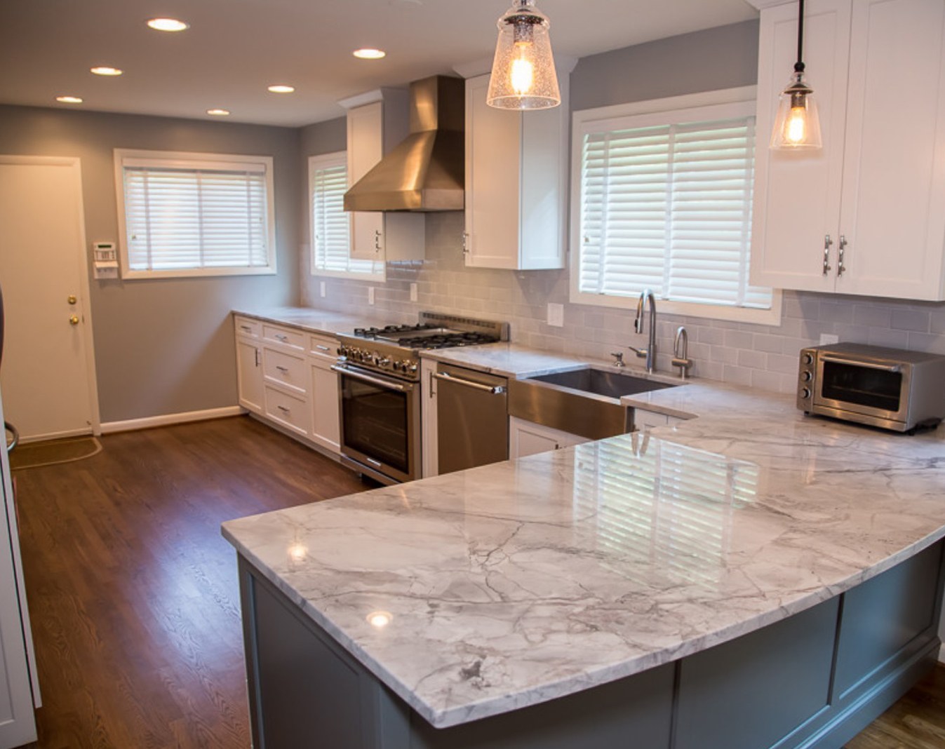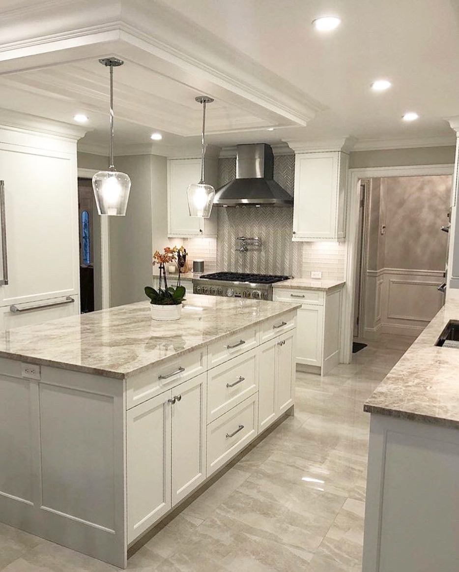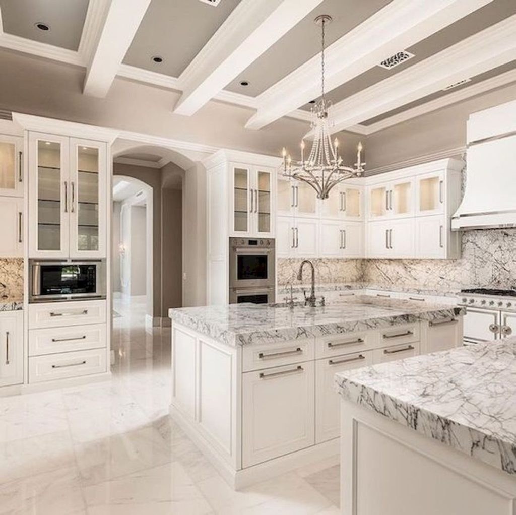 Белая кухня с мрамором в интерьере
