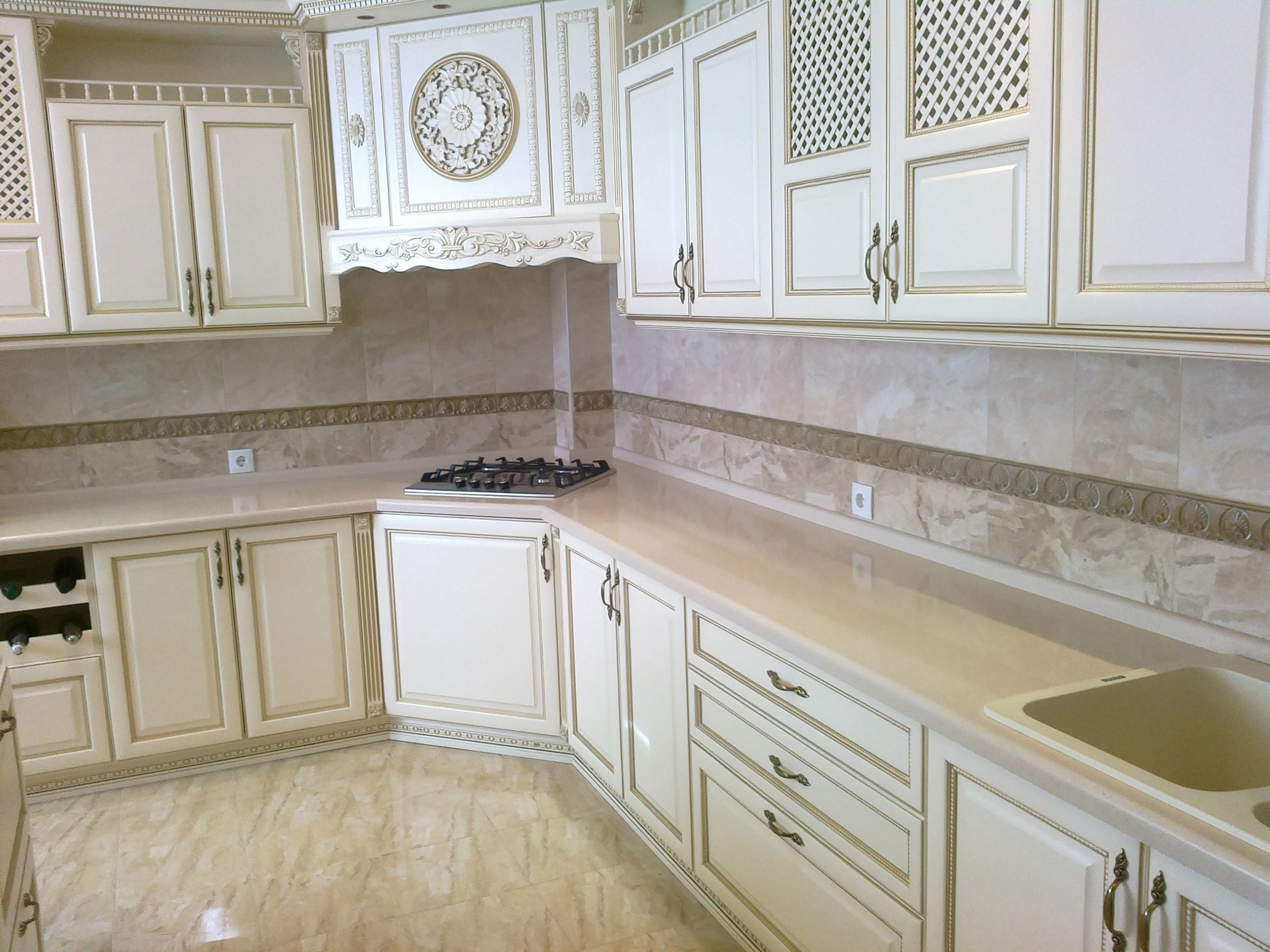 Белая кухня классика с мраморной столешницей