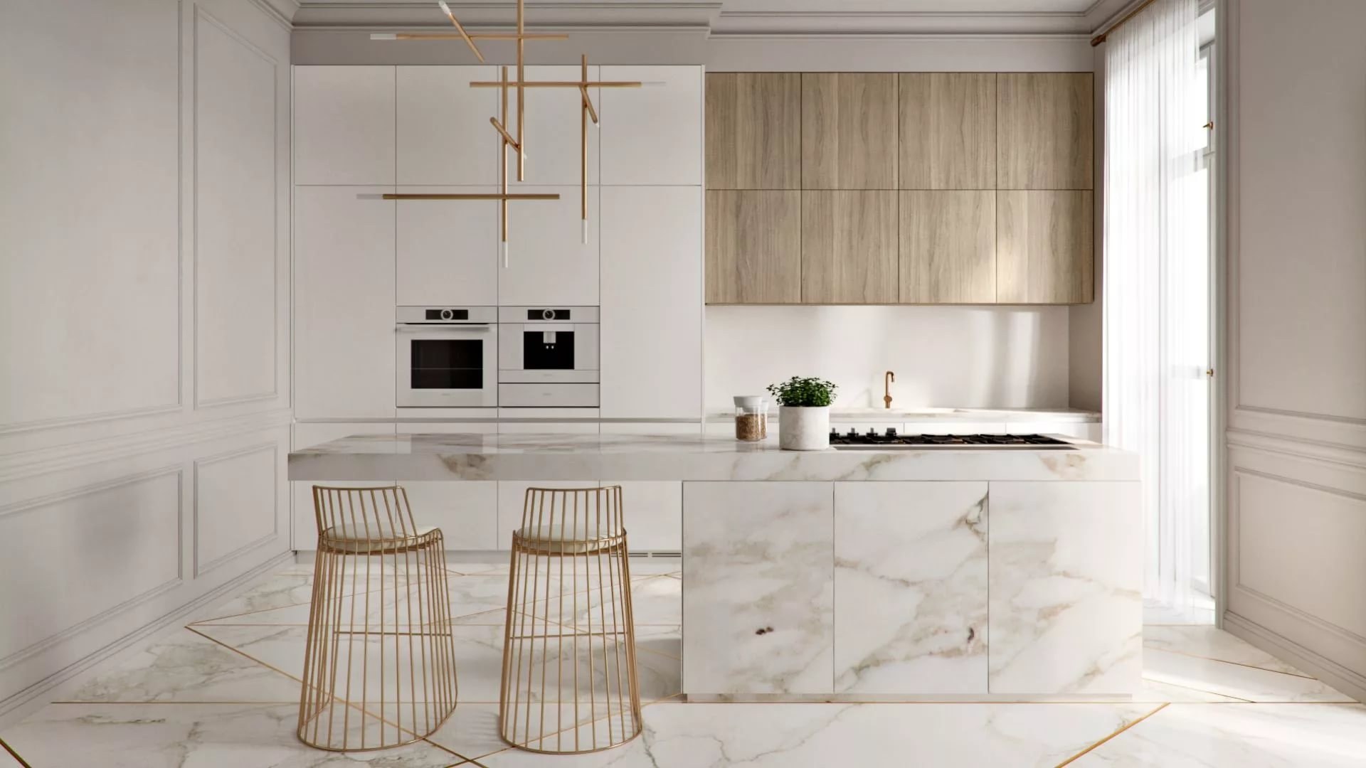 Светлая мраморная кухня