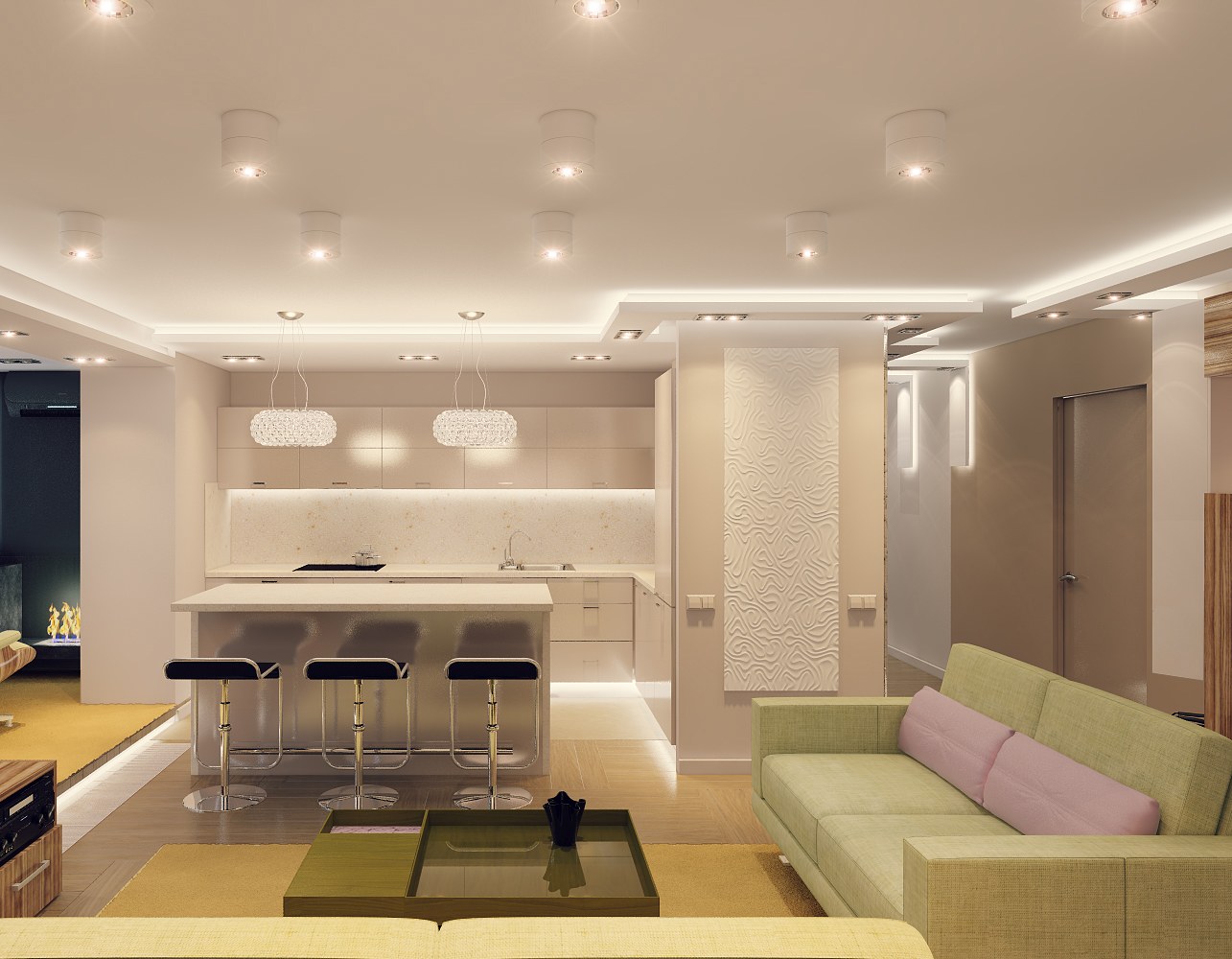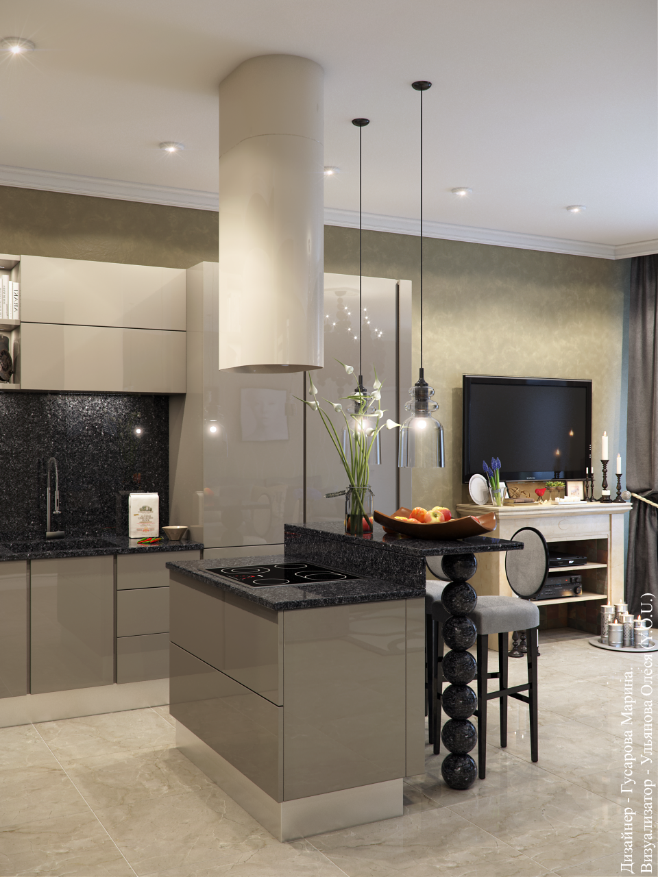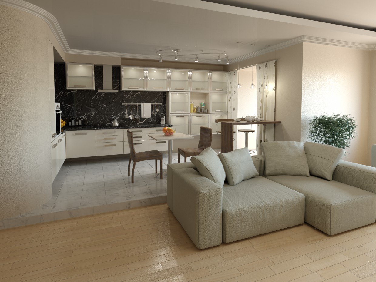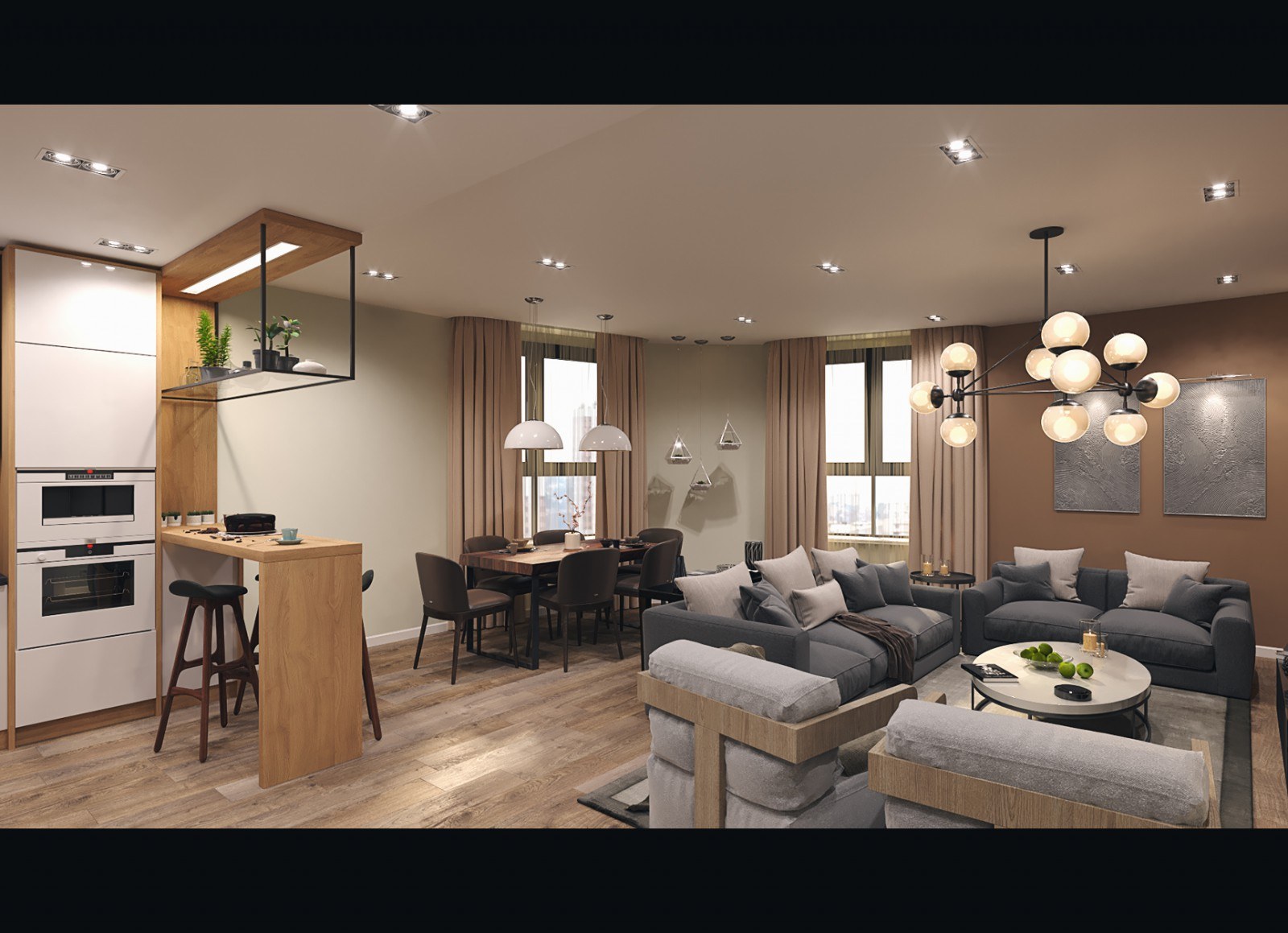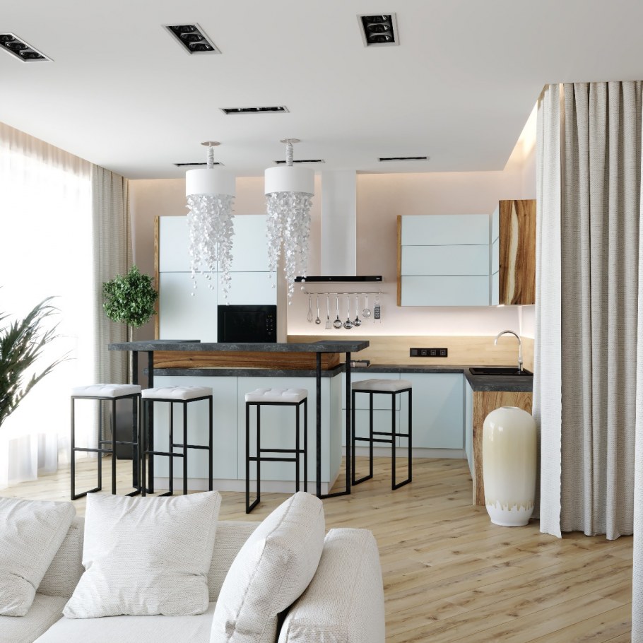 3д визуализация интерьеров Холли и совместная гостиная кухня
