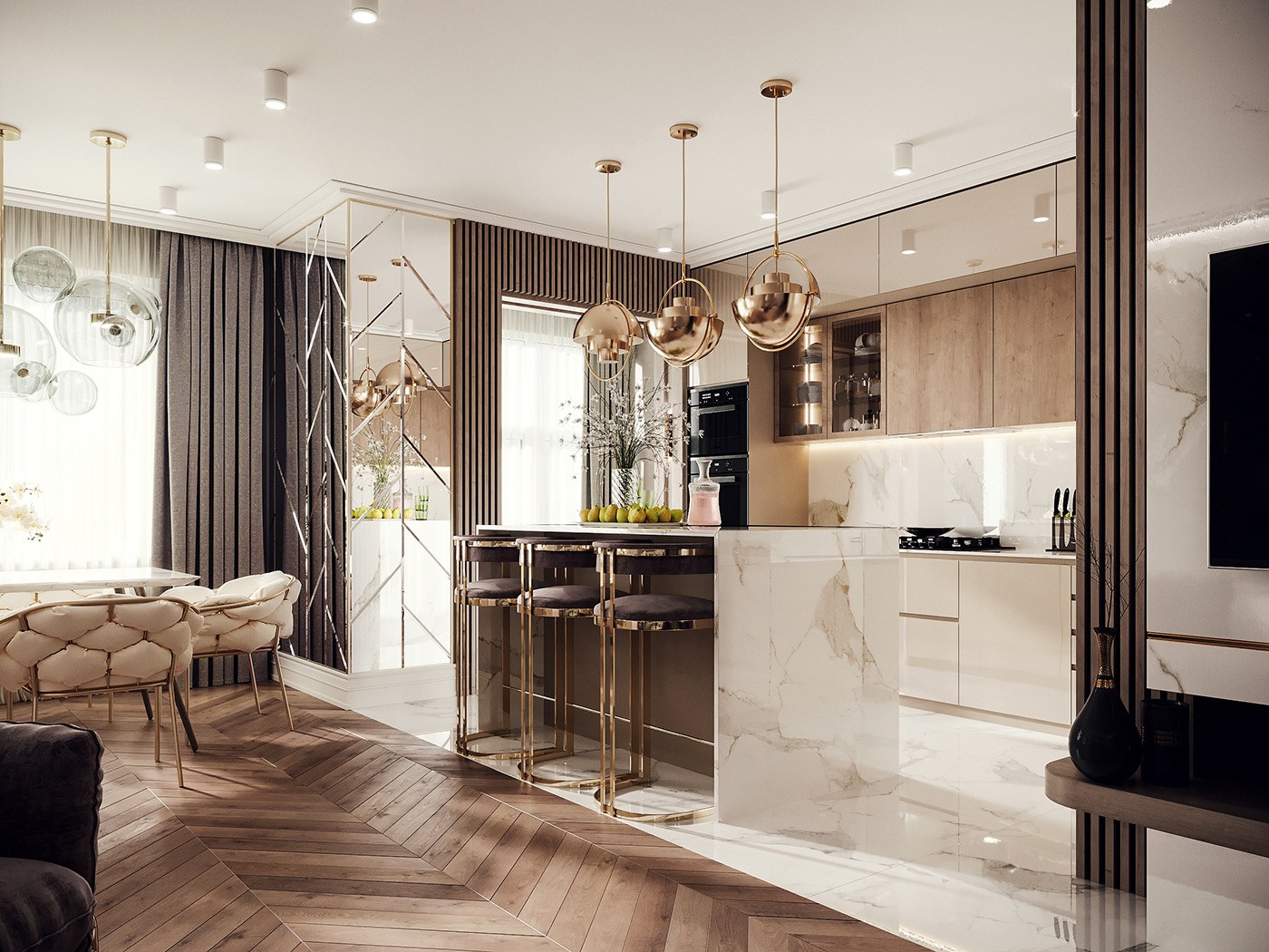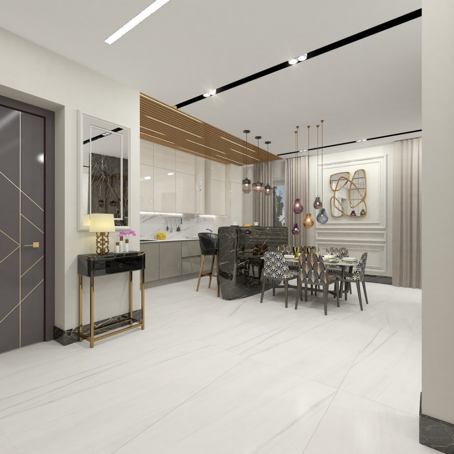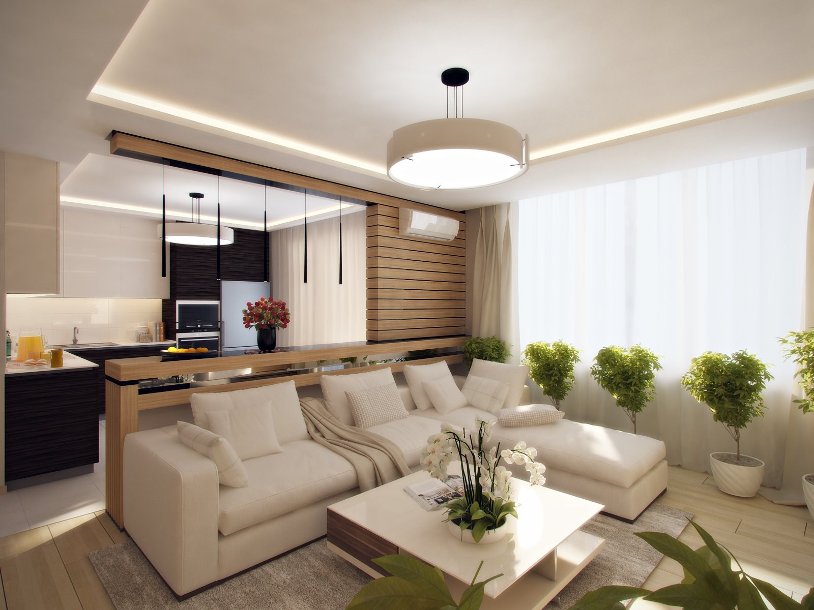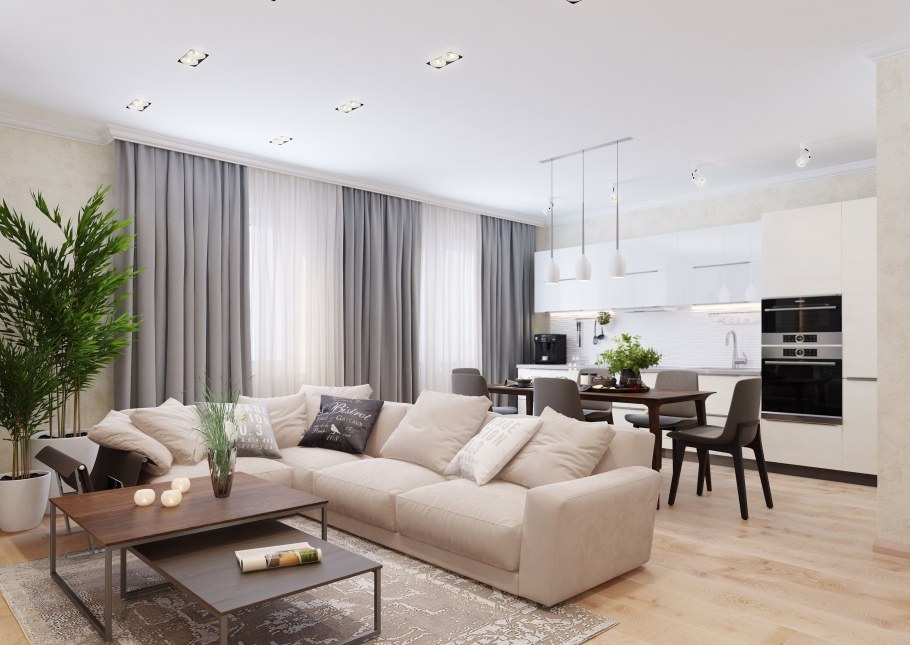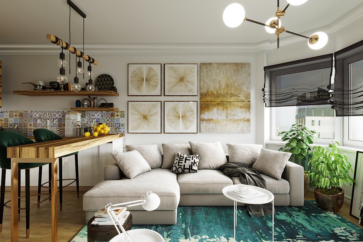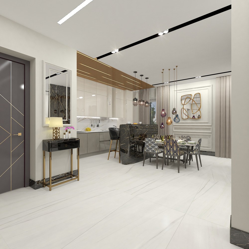3д визуализация интерьеров Холли и совместная гостиная кухня
