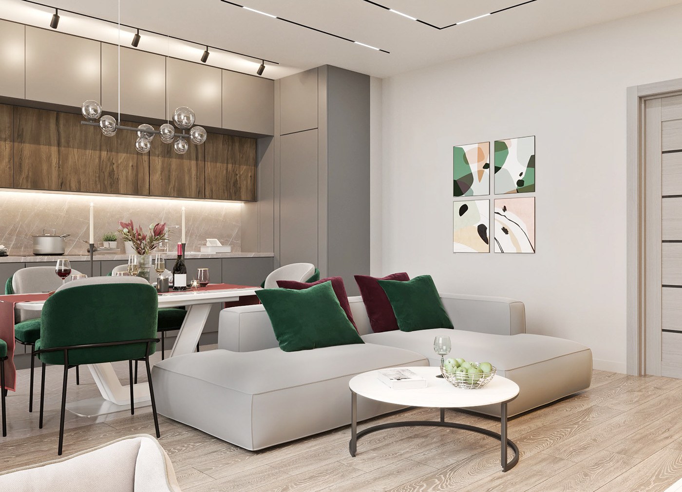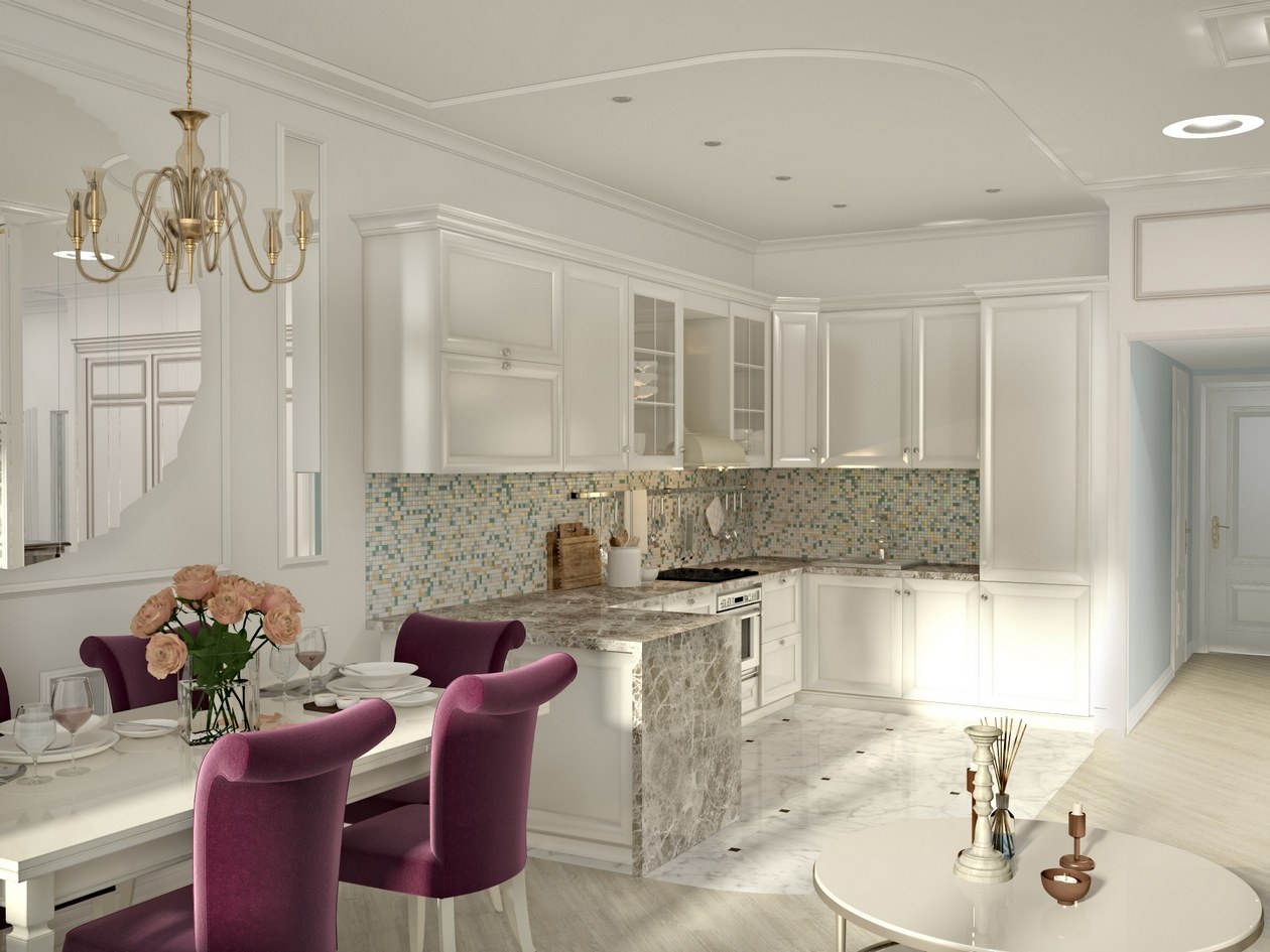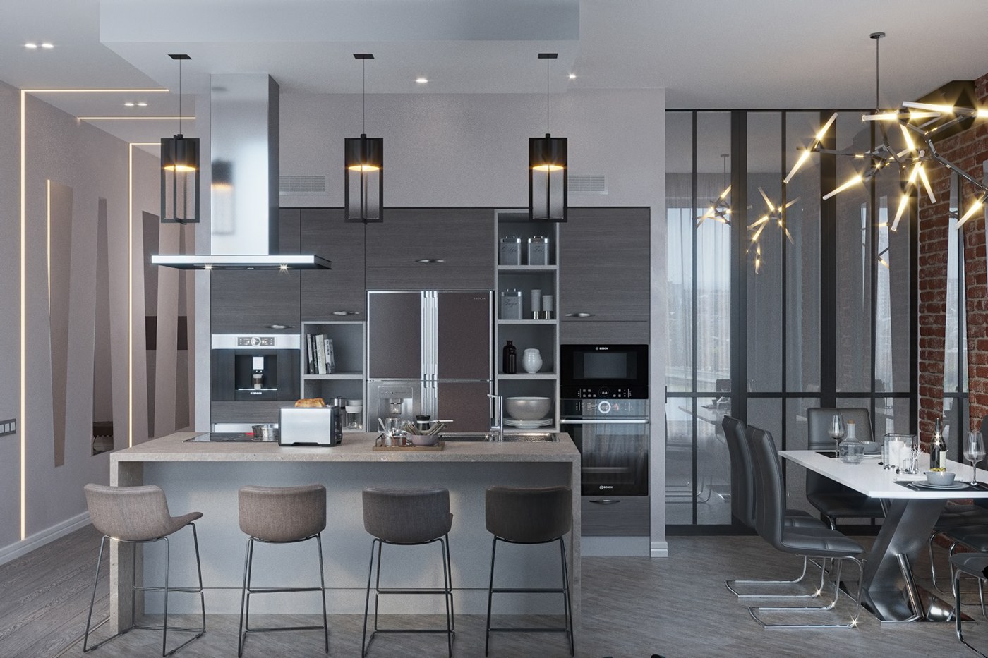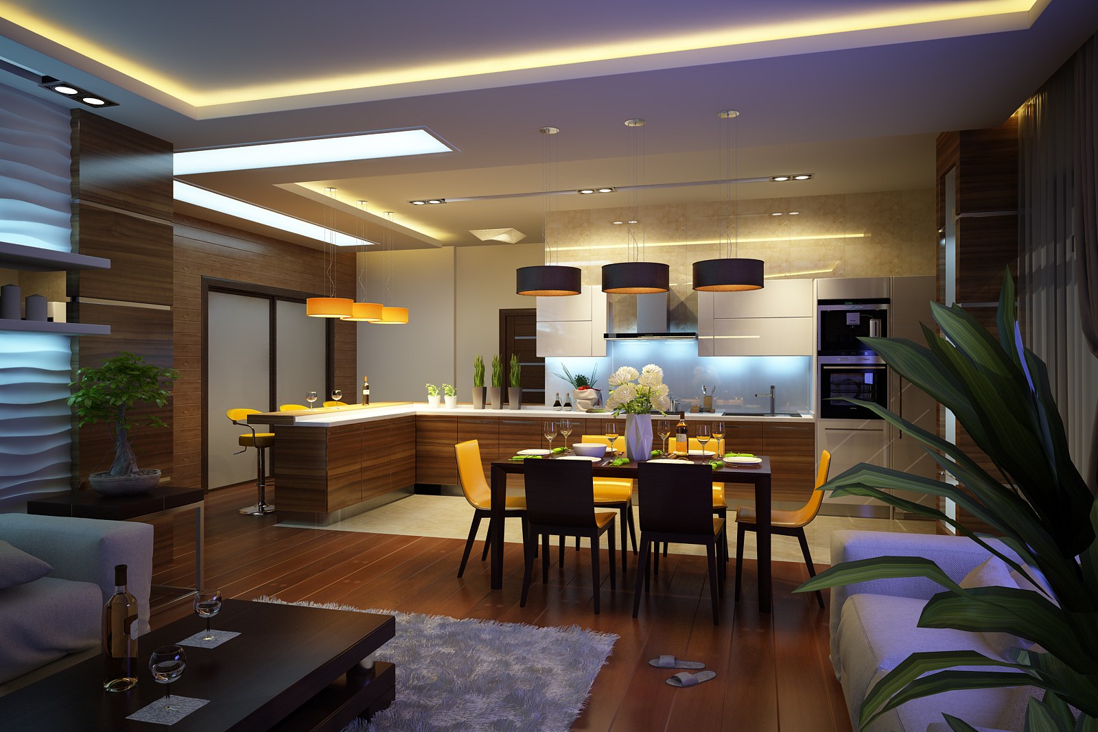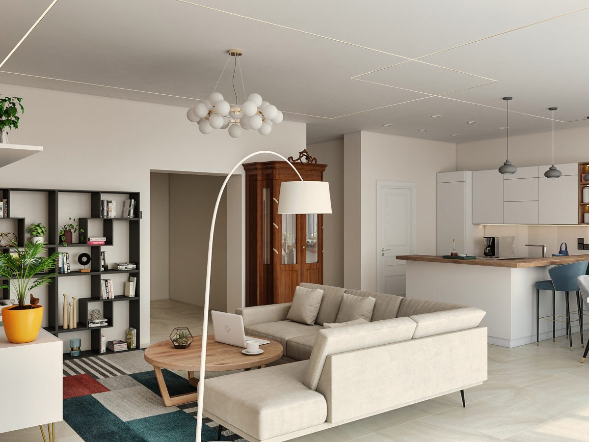 3д визуализация интерьеров Холли и совместная гостиная кухня