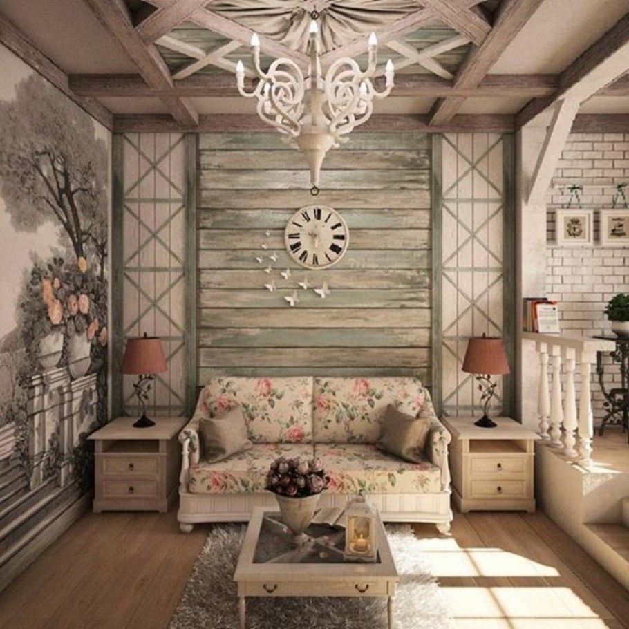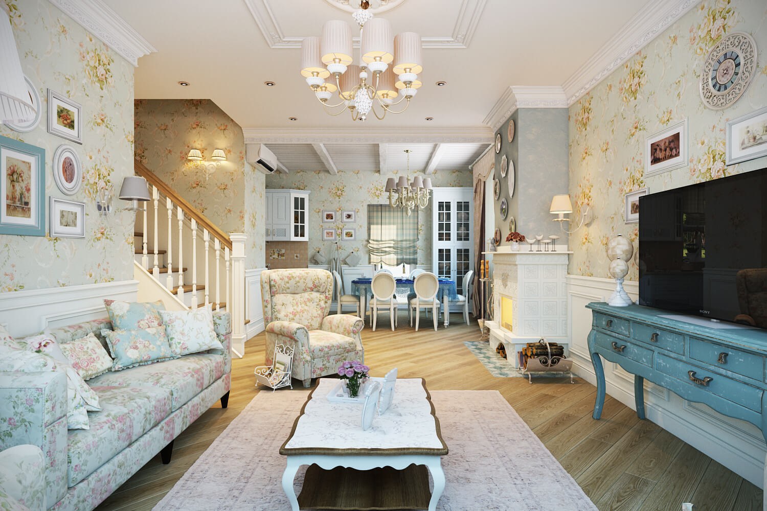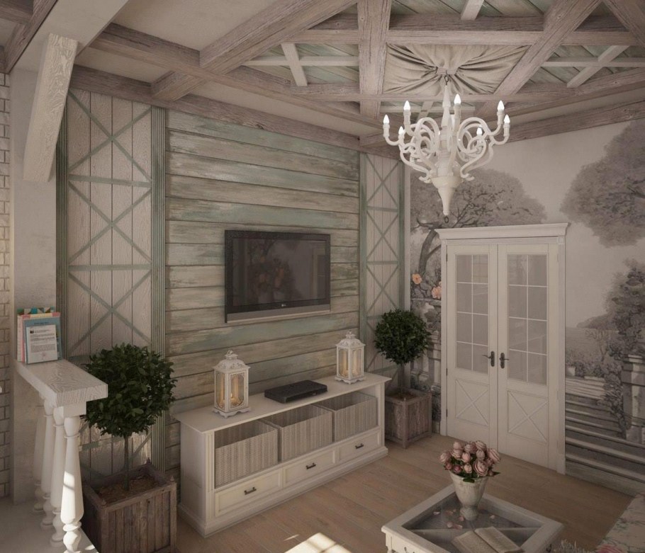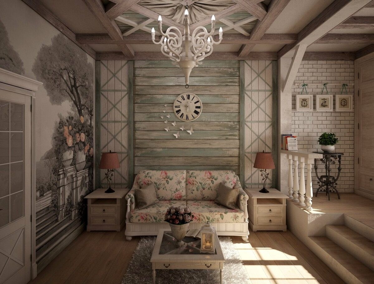 Гостиная в стиле Прованс в деревянном доме с обоями