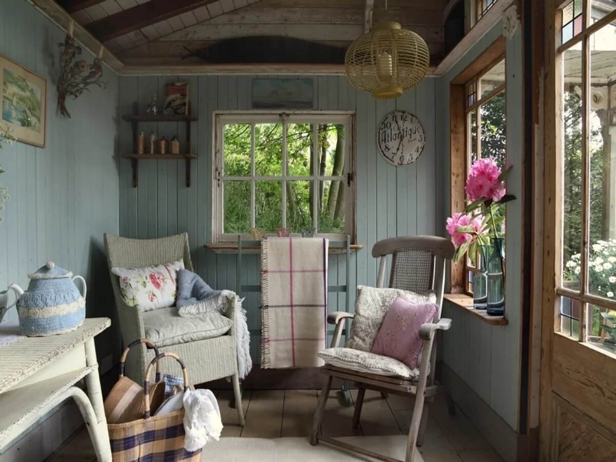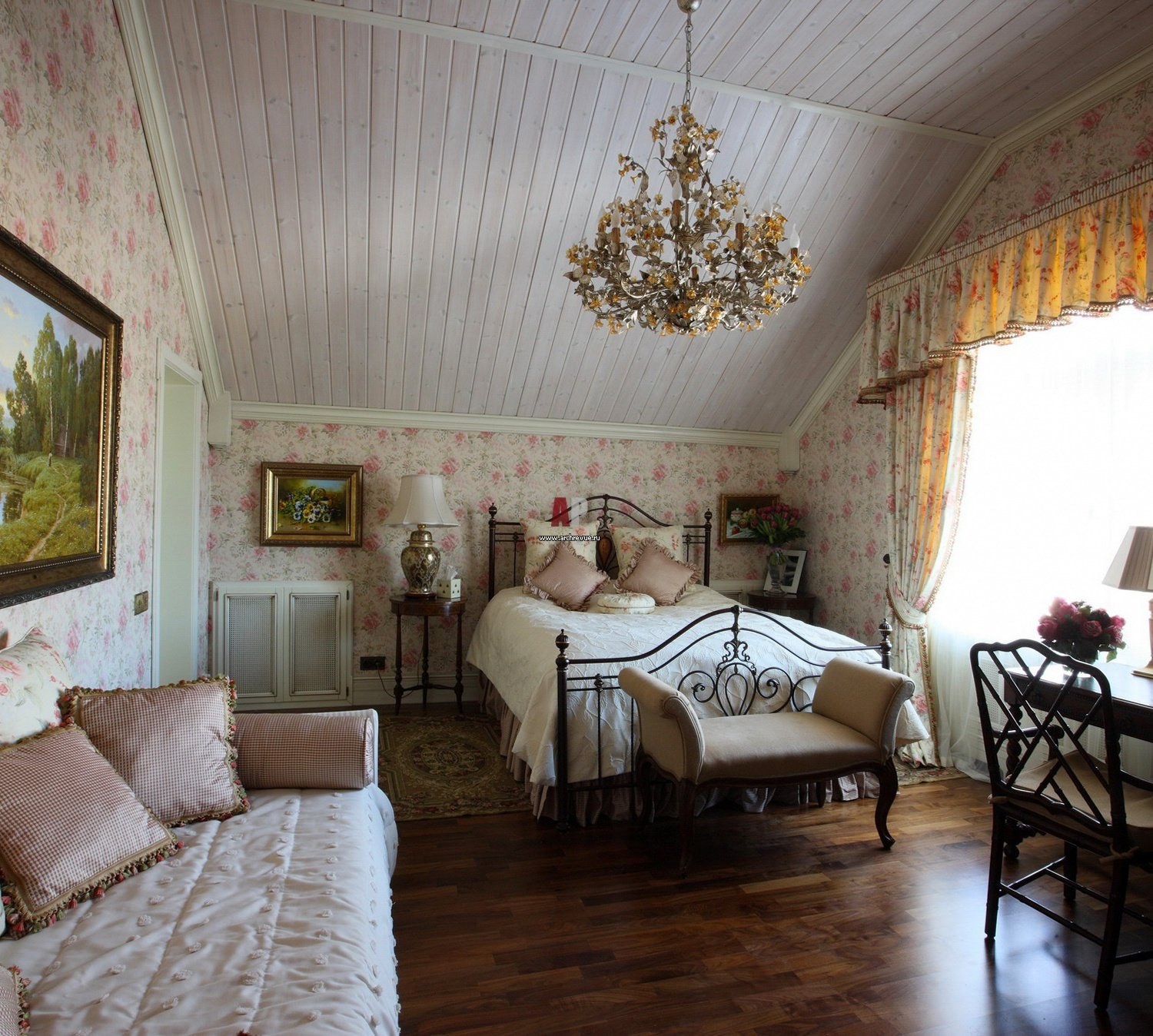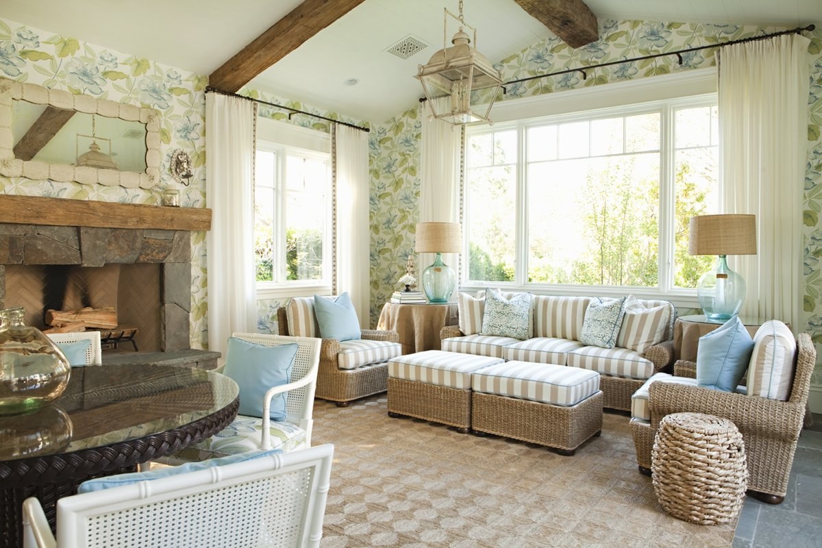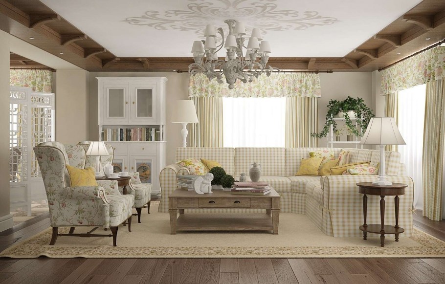 Гостиная в стиле Прованс в деревянном доме с обоями
