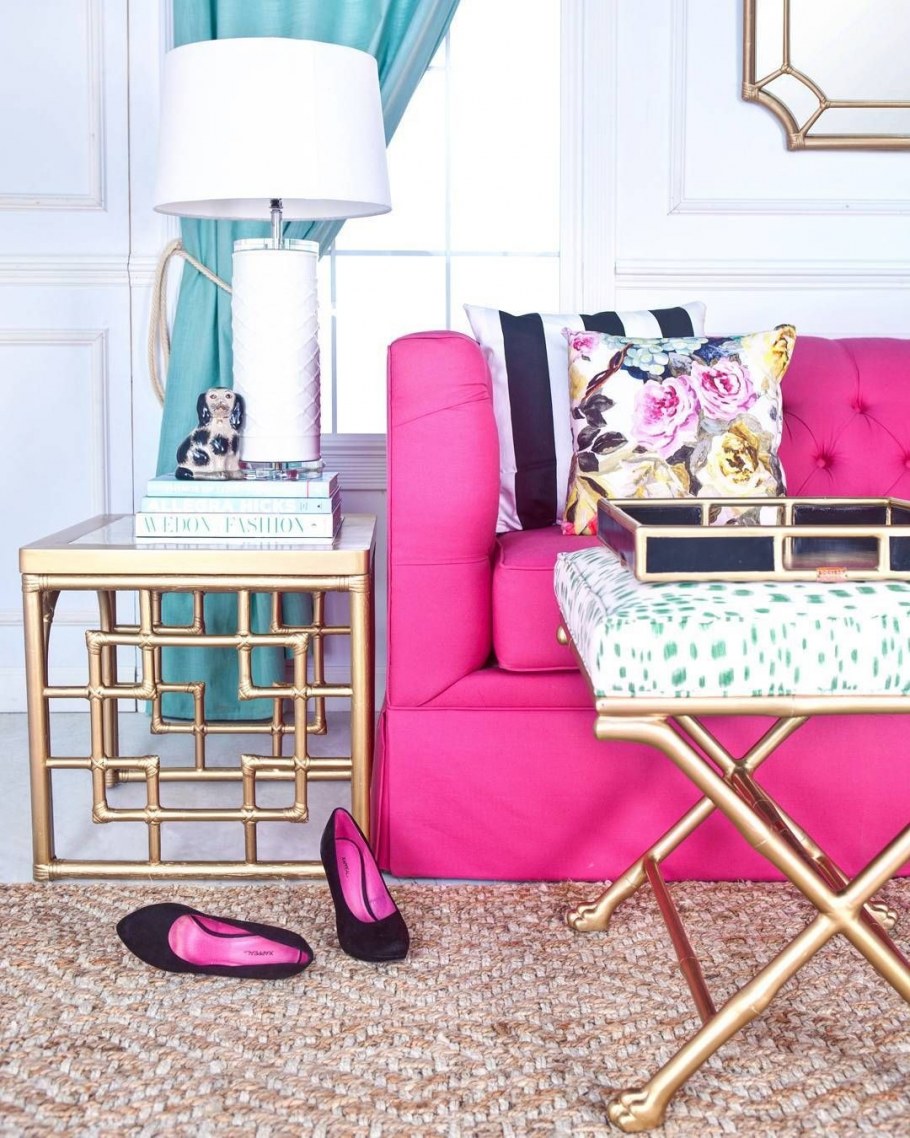 Розовый диван в интерьере яркий