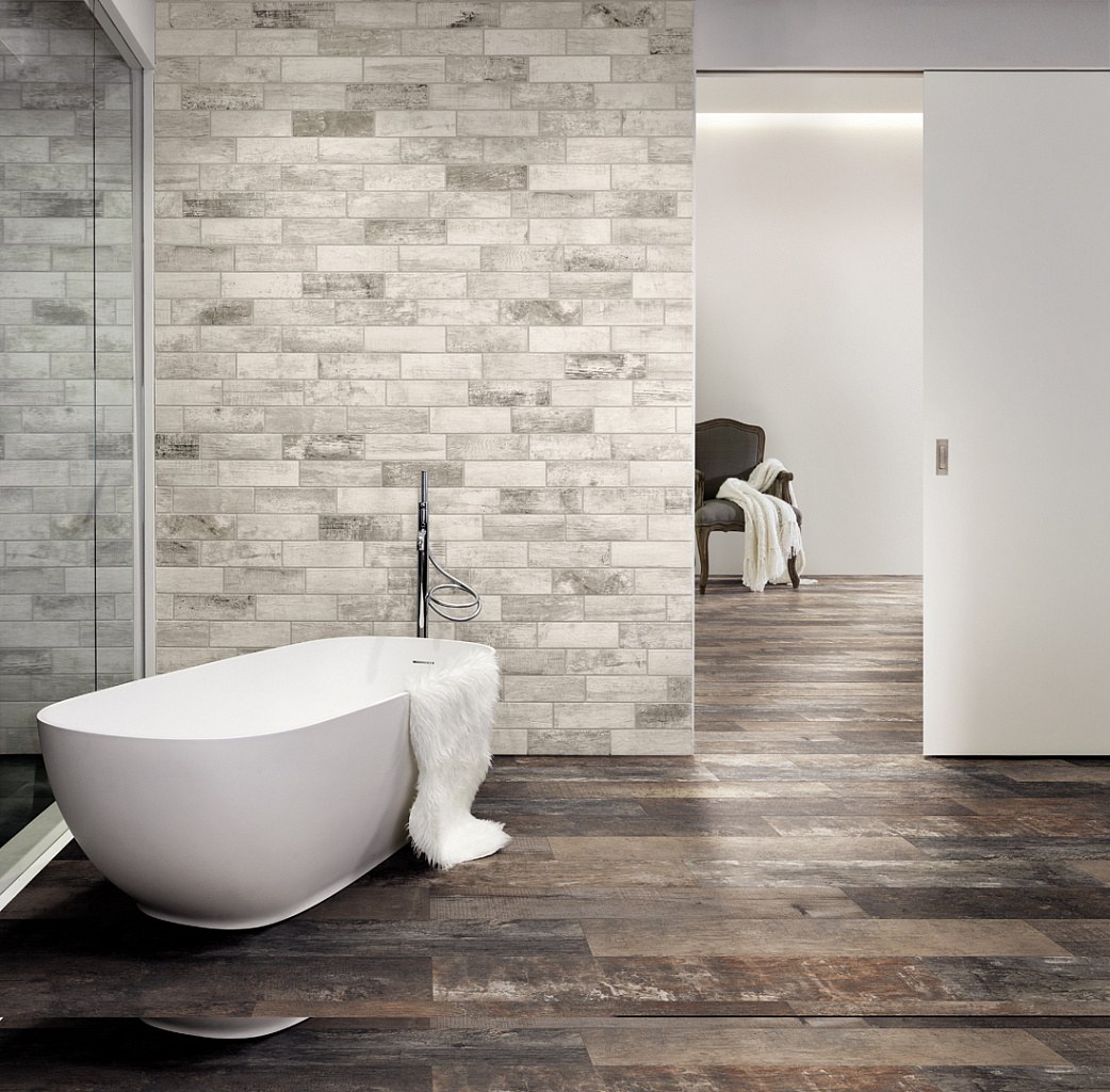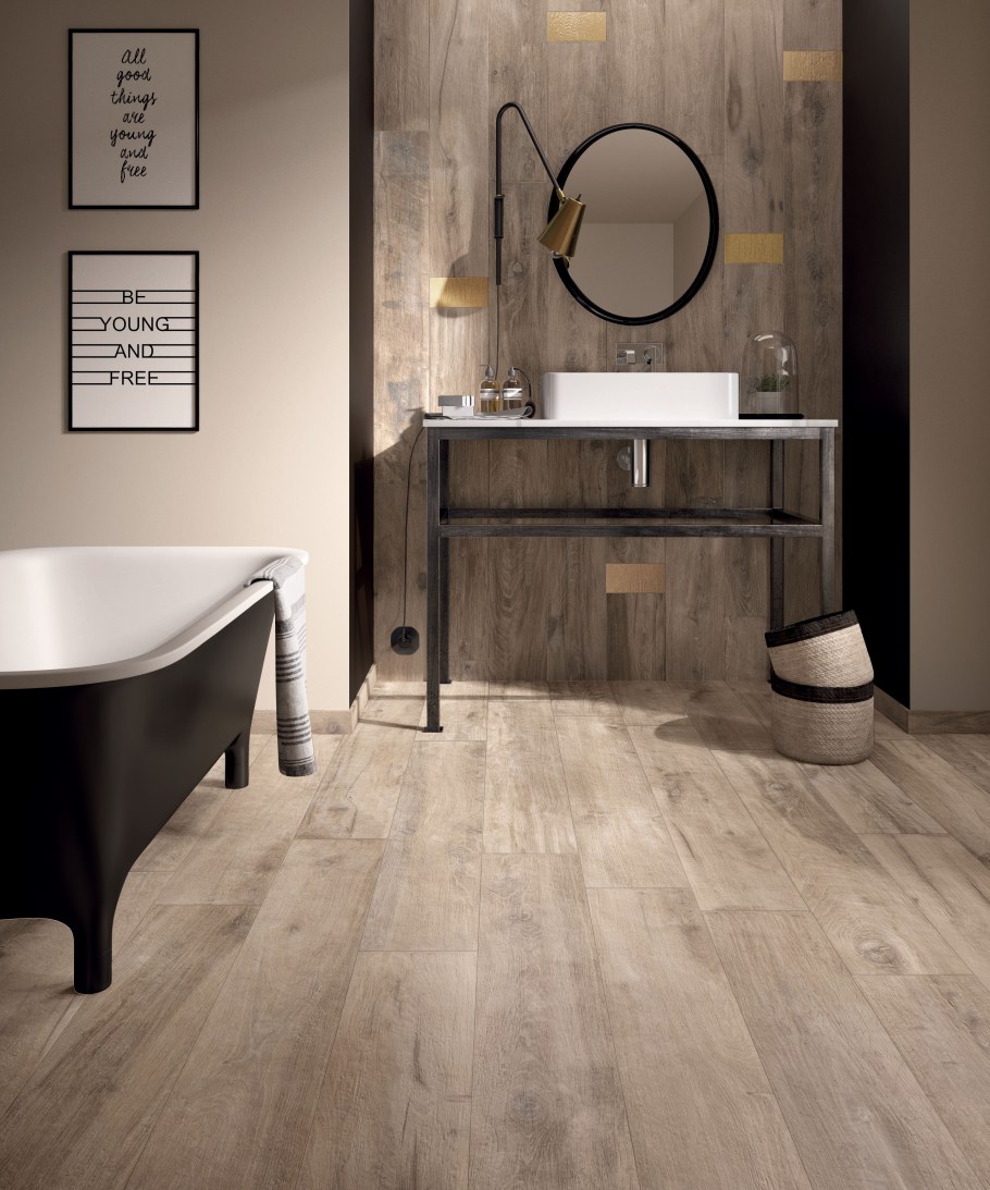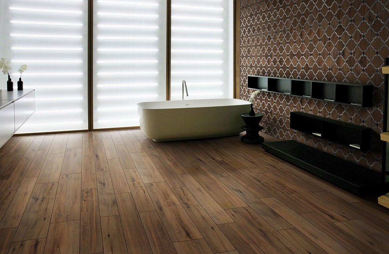 Плитка под дерево на пол в ванной (75 фото)