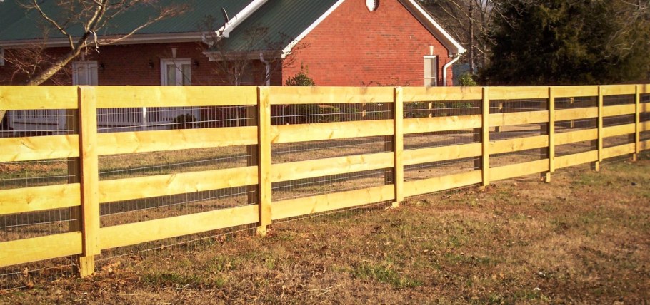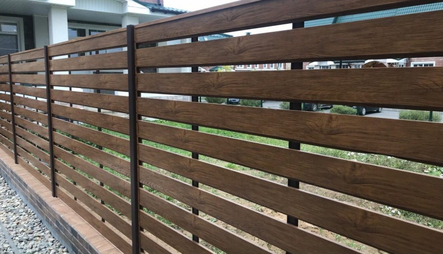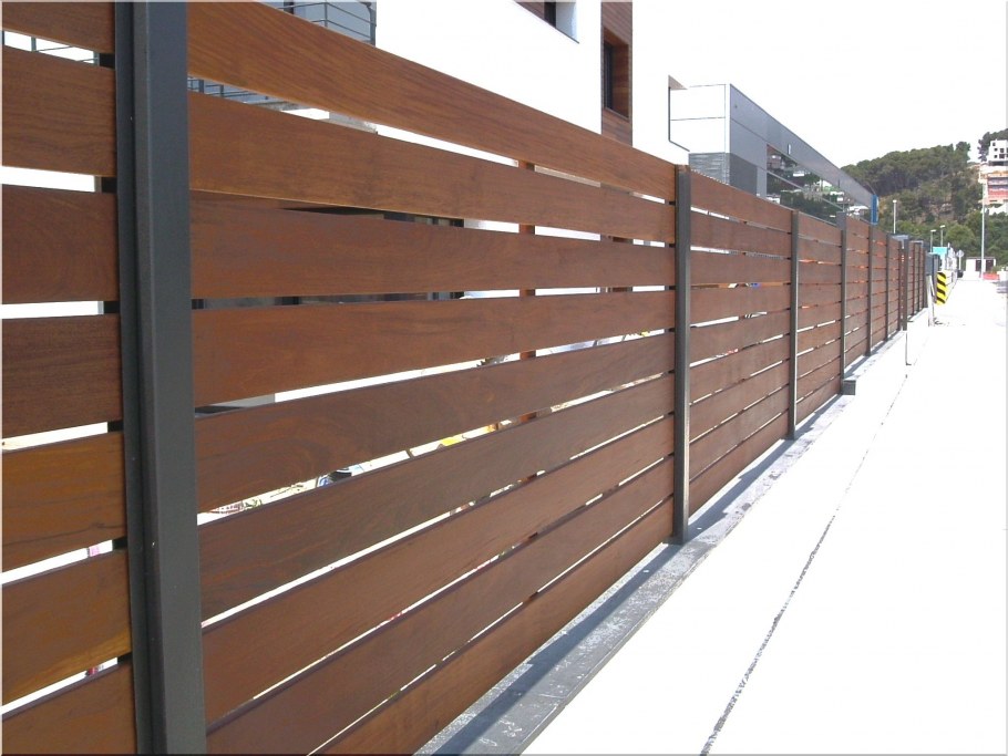 Горизонтальный деревянный забор на металлических столбах (81 фото)