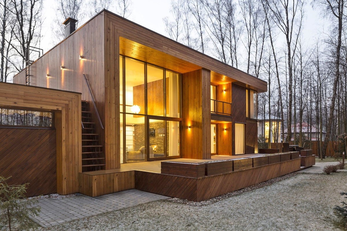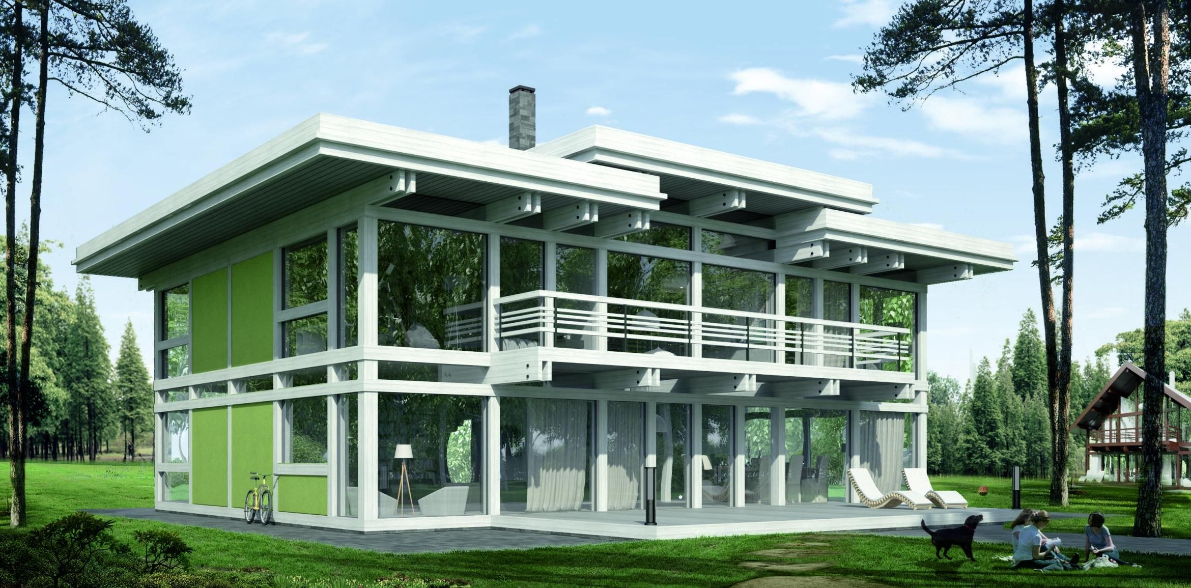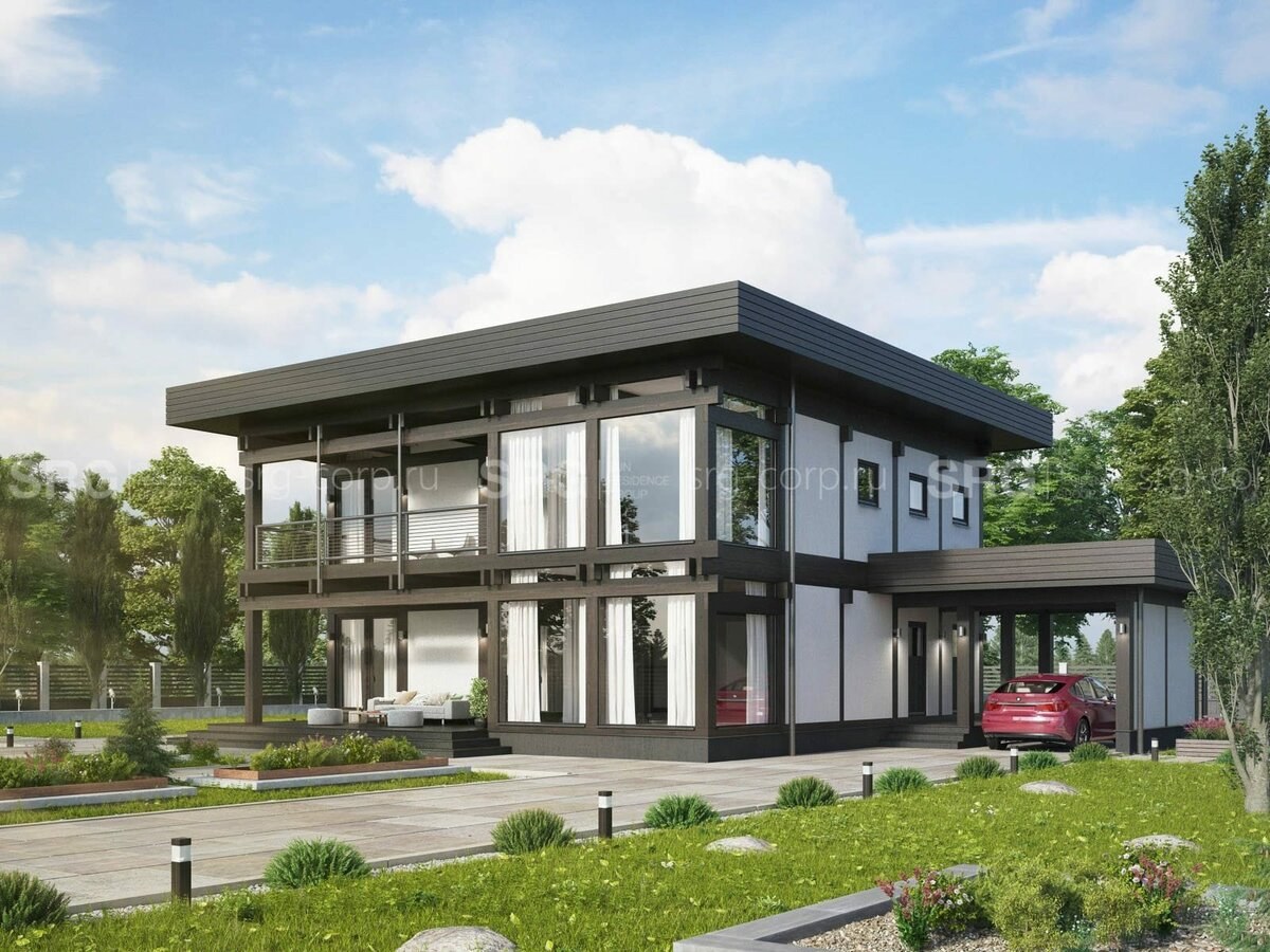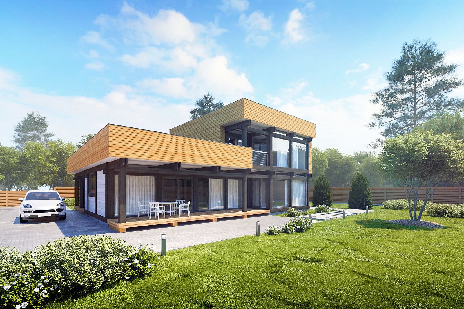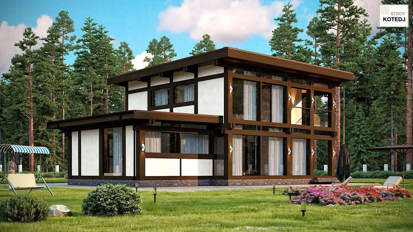 Двухэтажный дом с односкатной крышей в стиле Модерн