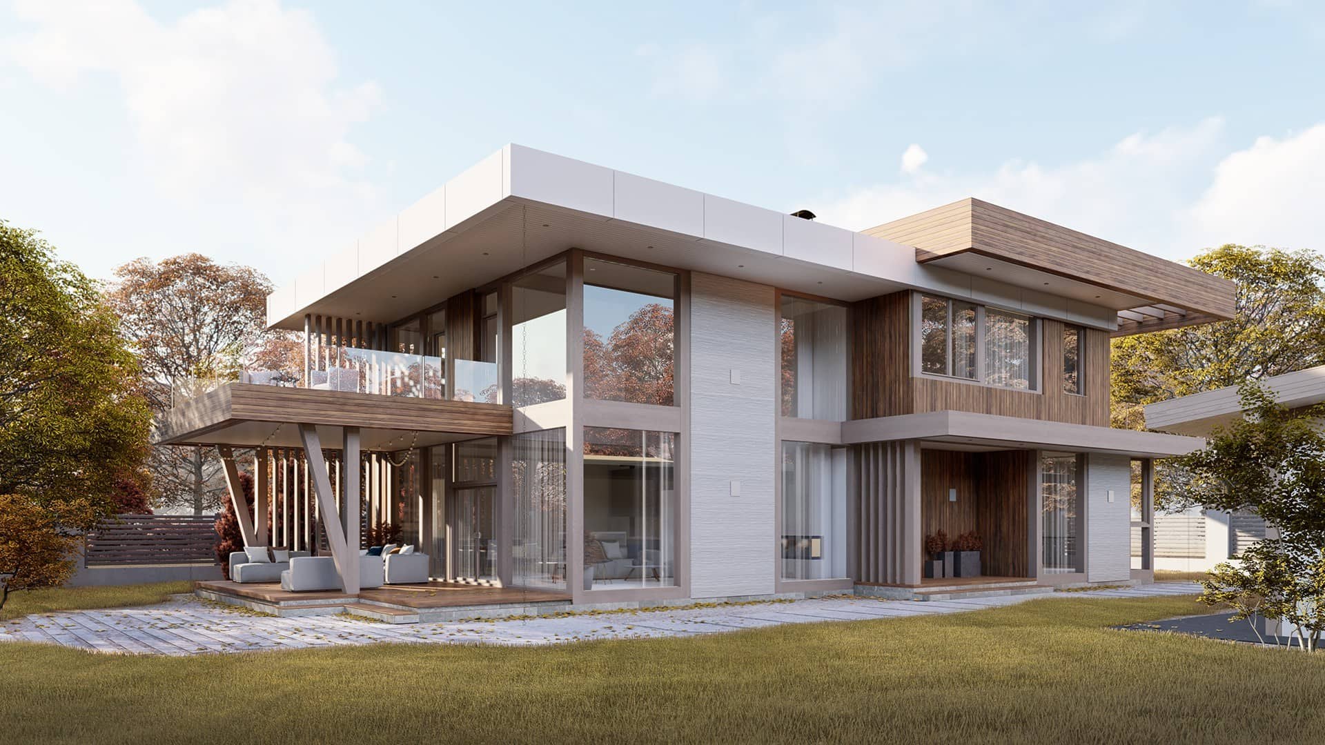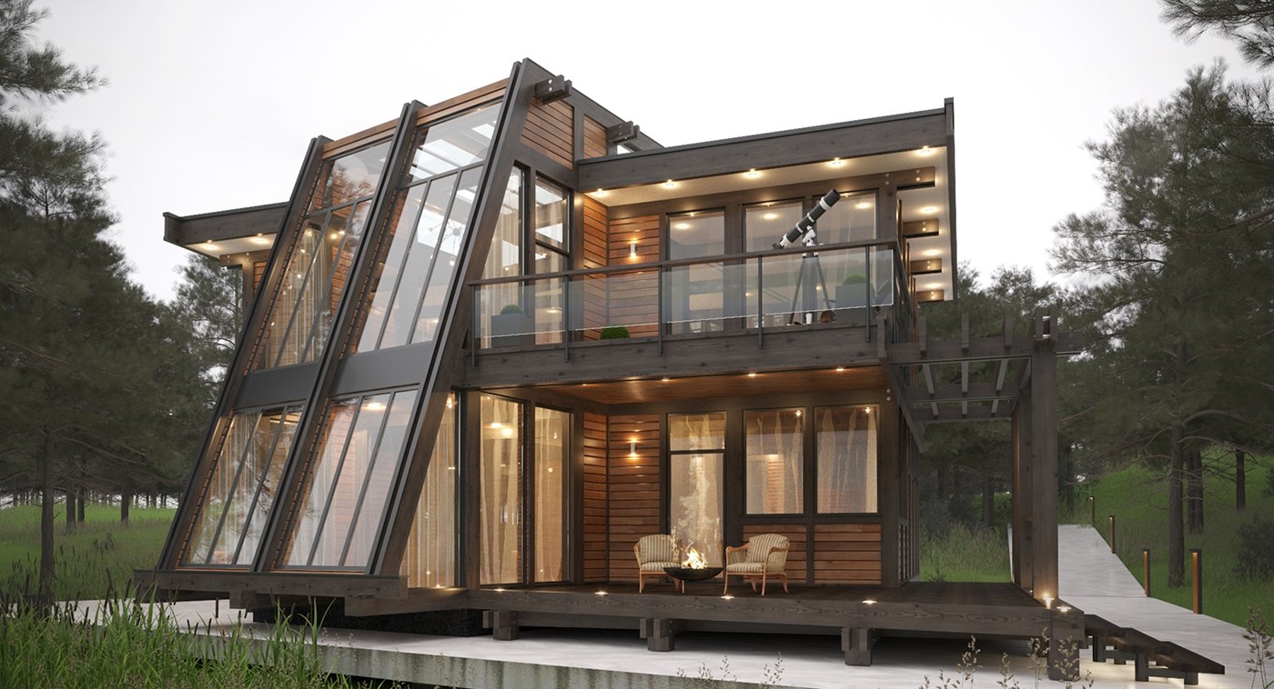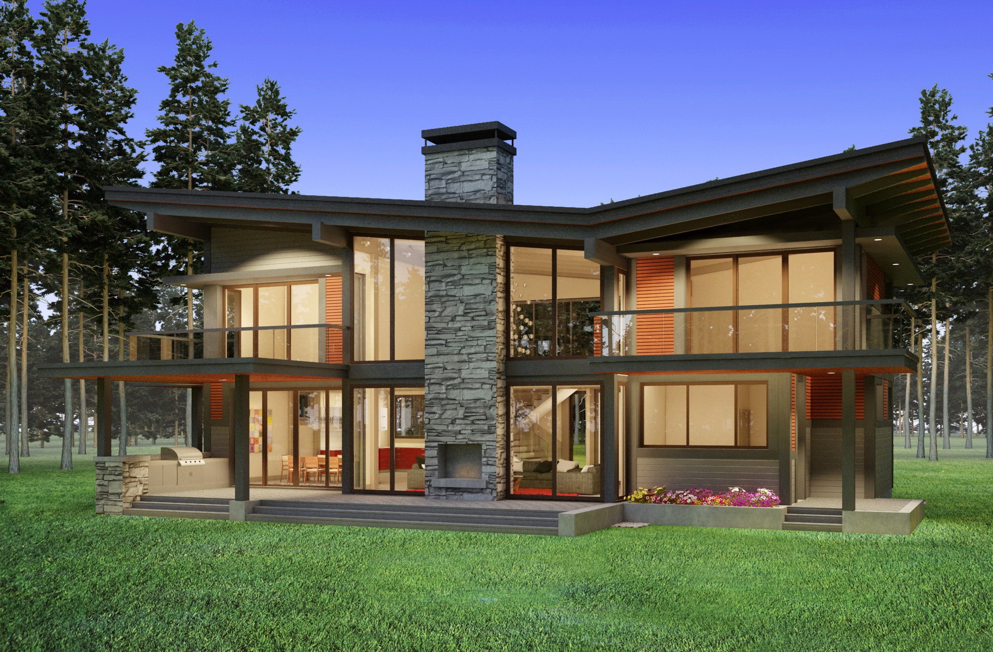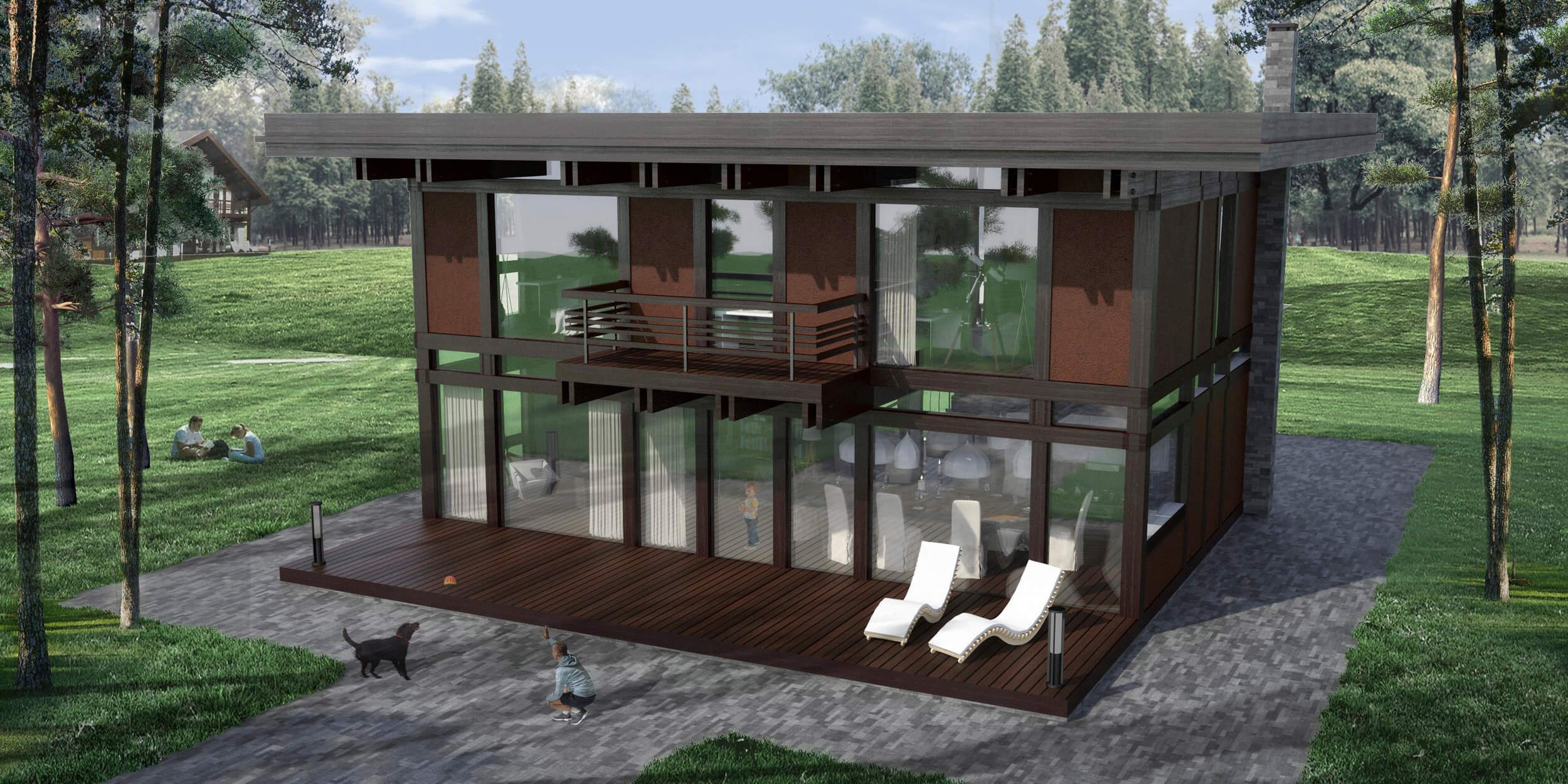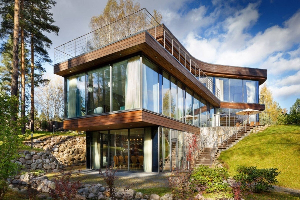 Двухэтажный дом с односкатной крышей в стиле Модерн