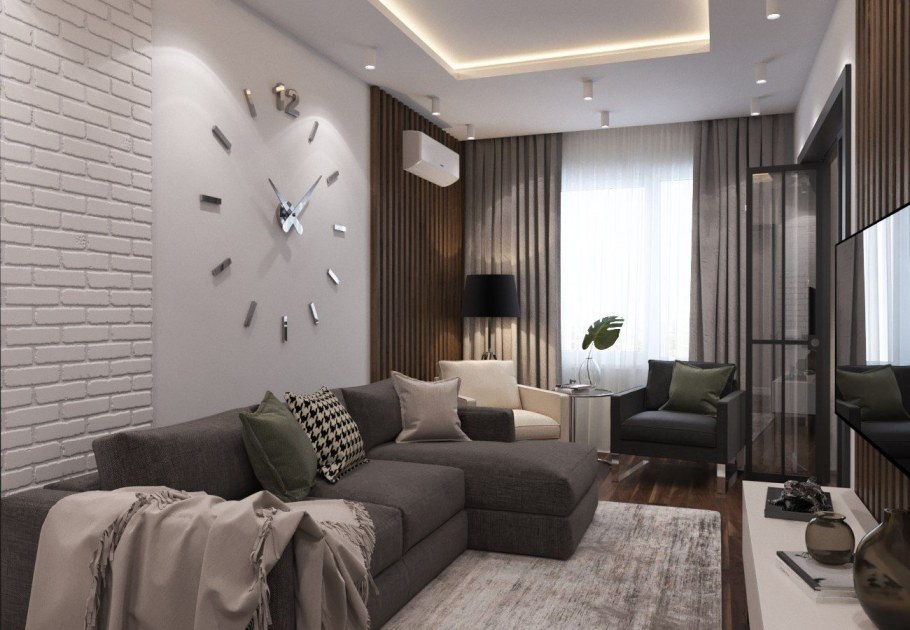 Серый с коричневым в интерьере гостиной