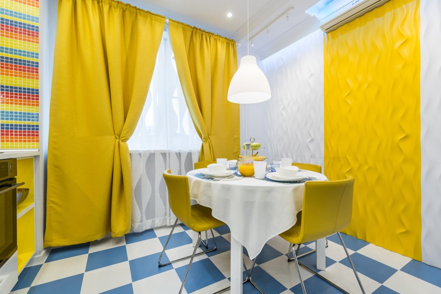 Желтые шторы в интерьере кухни