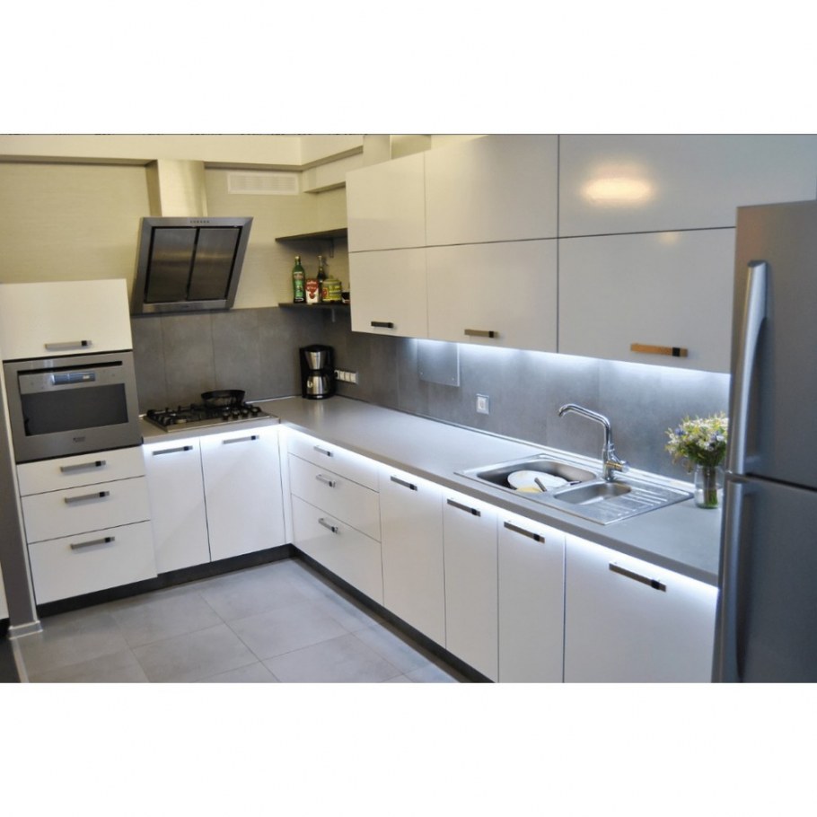 Белая кухня с серым фартуком