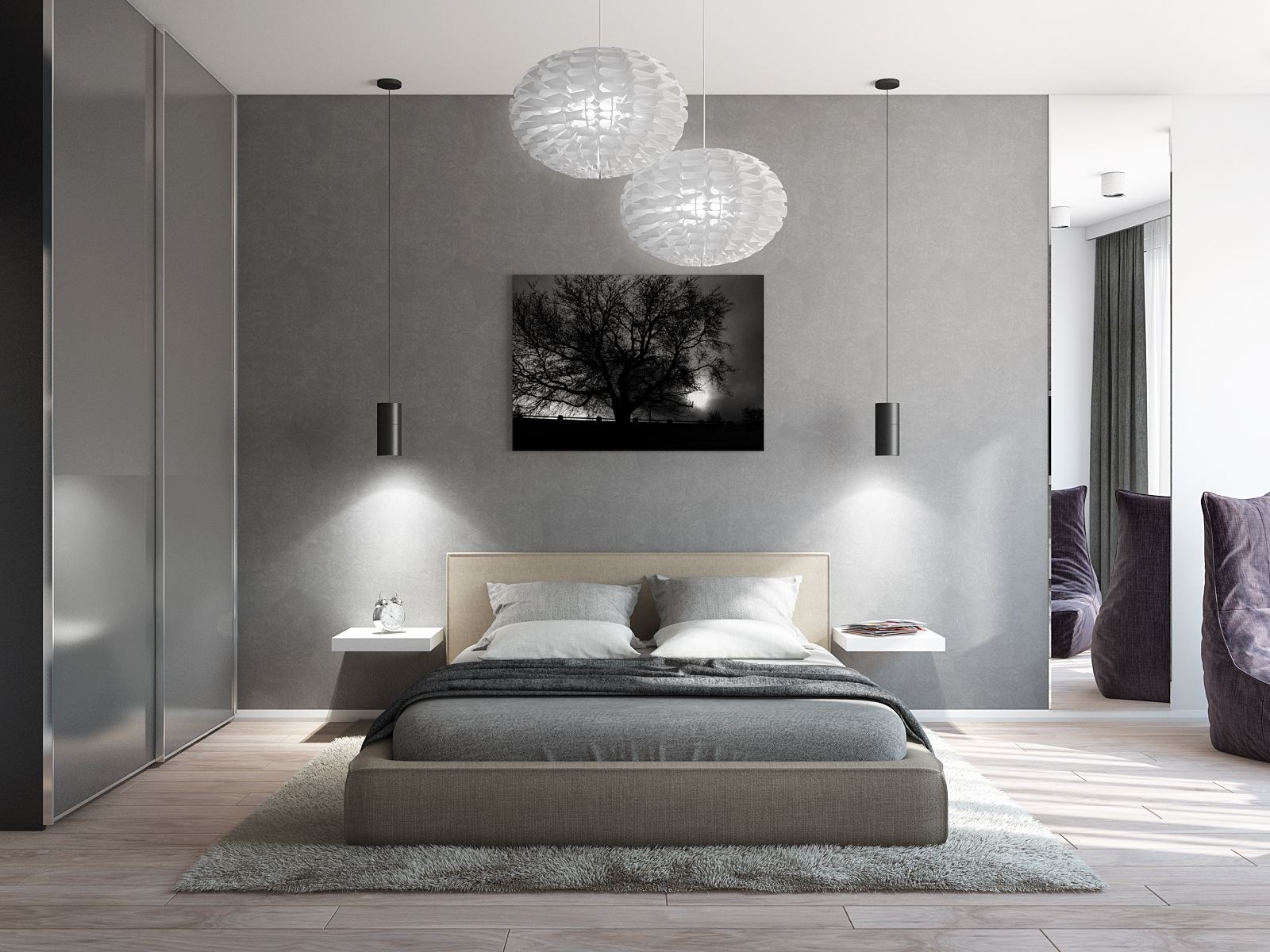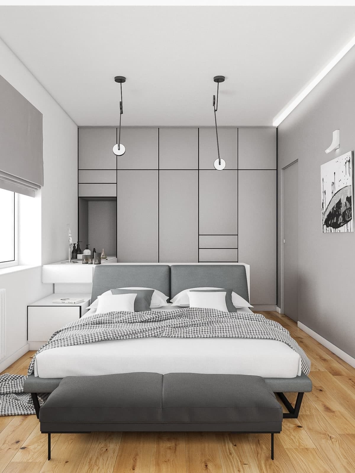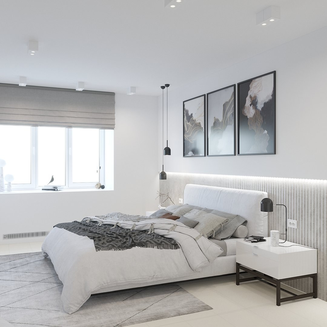 Серая спальня с белой мебелью