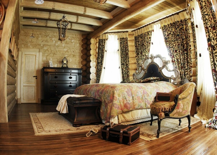 Интерьер спальни в бревенчатом доме в русском стиле