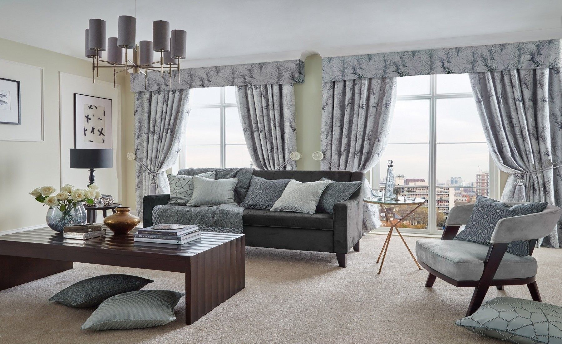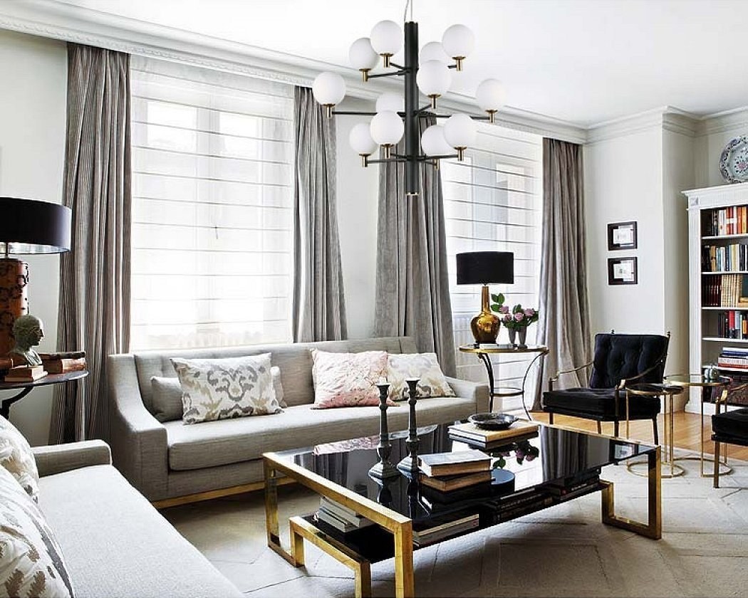 Серые портьеры в интерьере гостиной