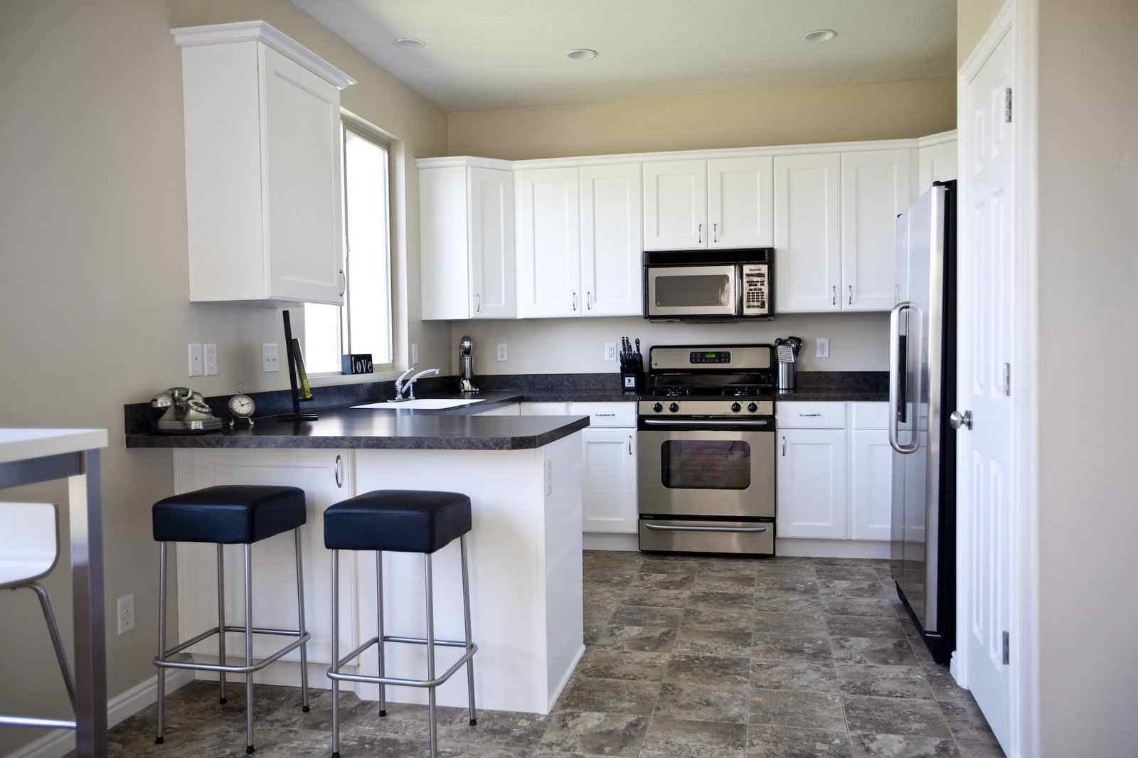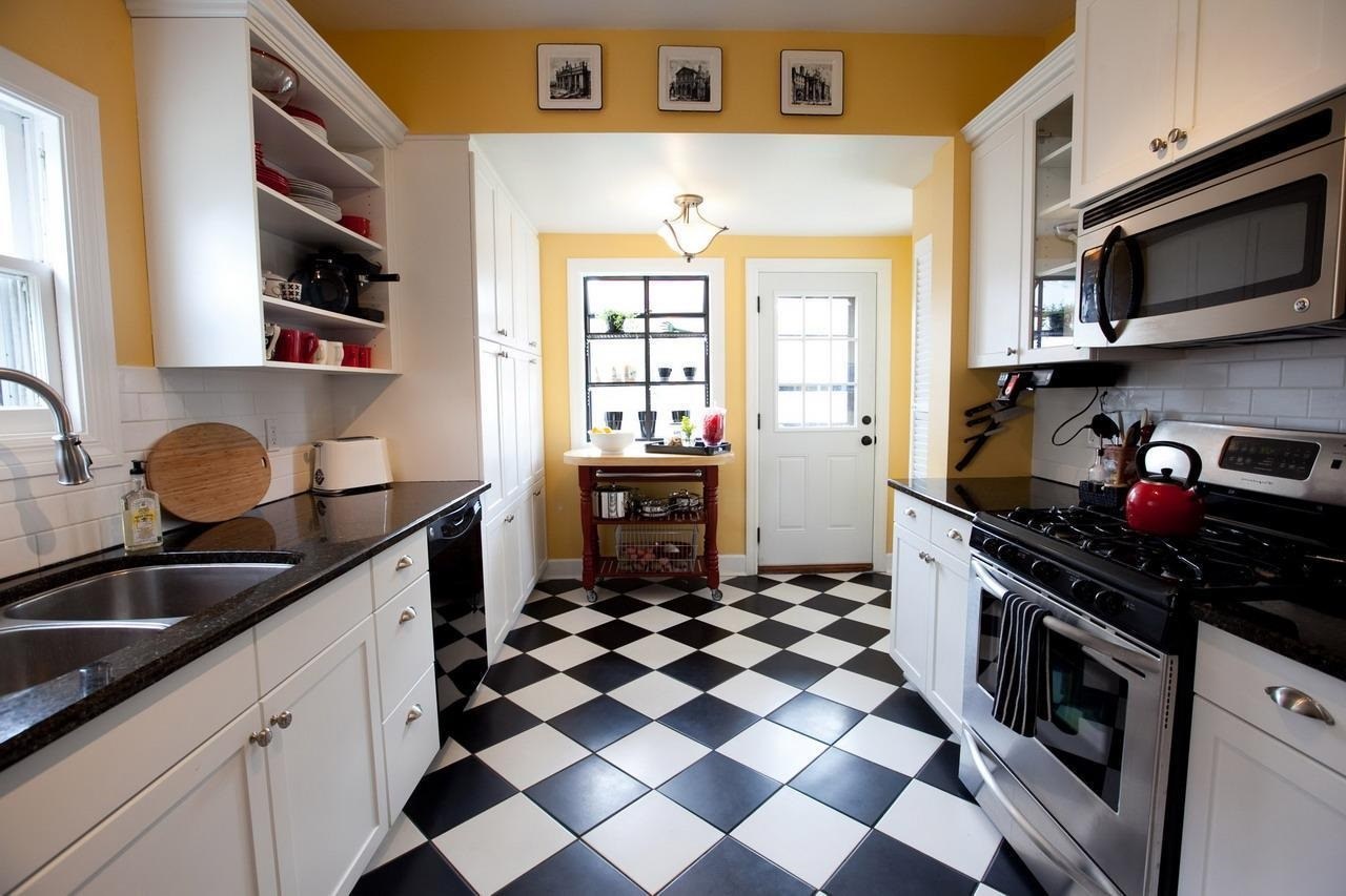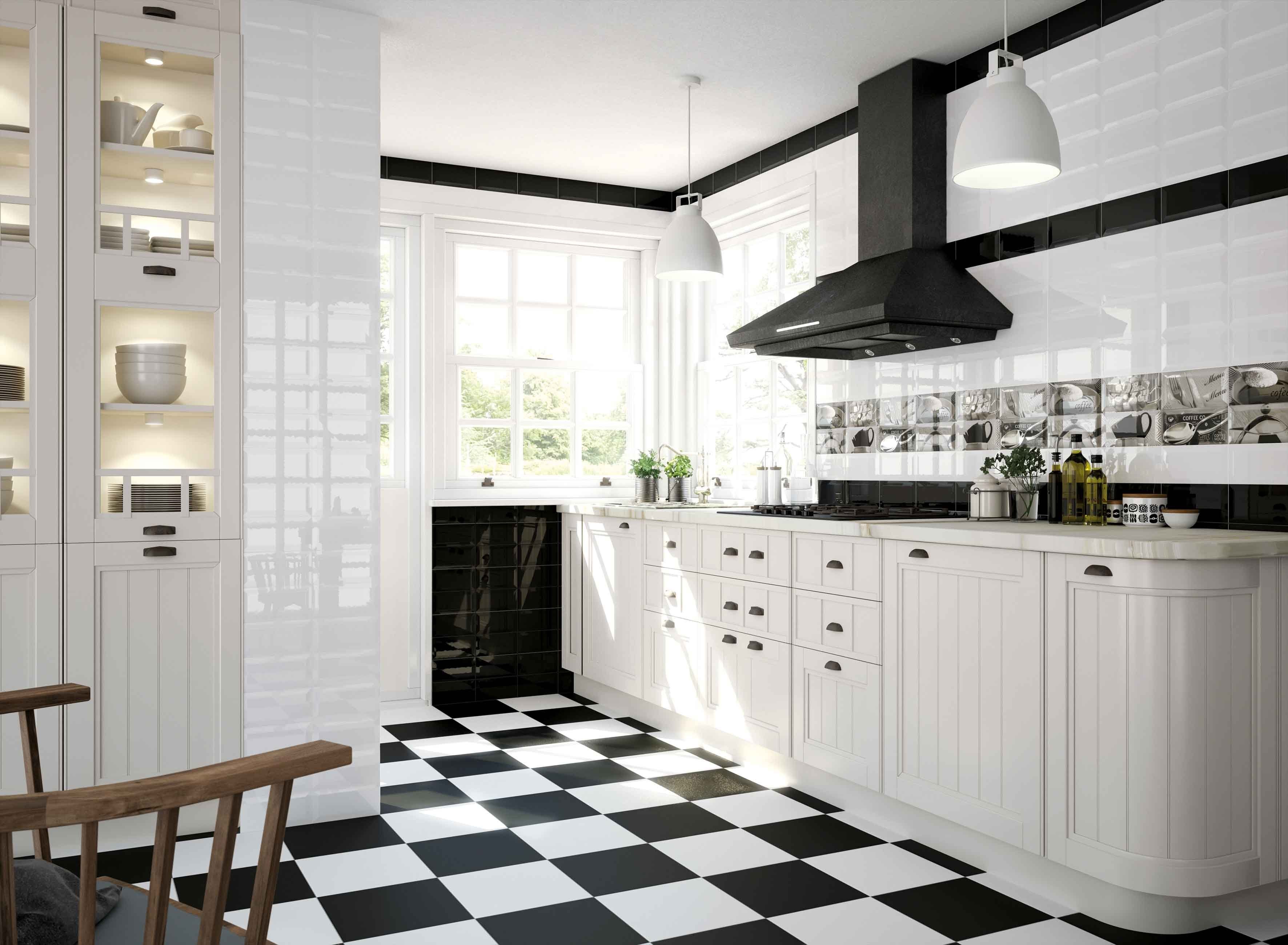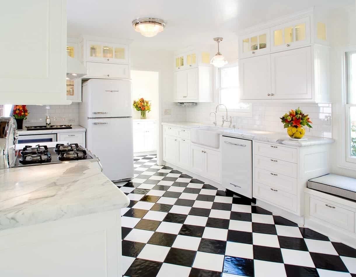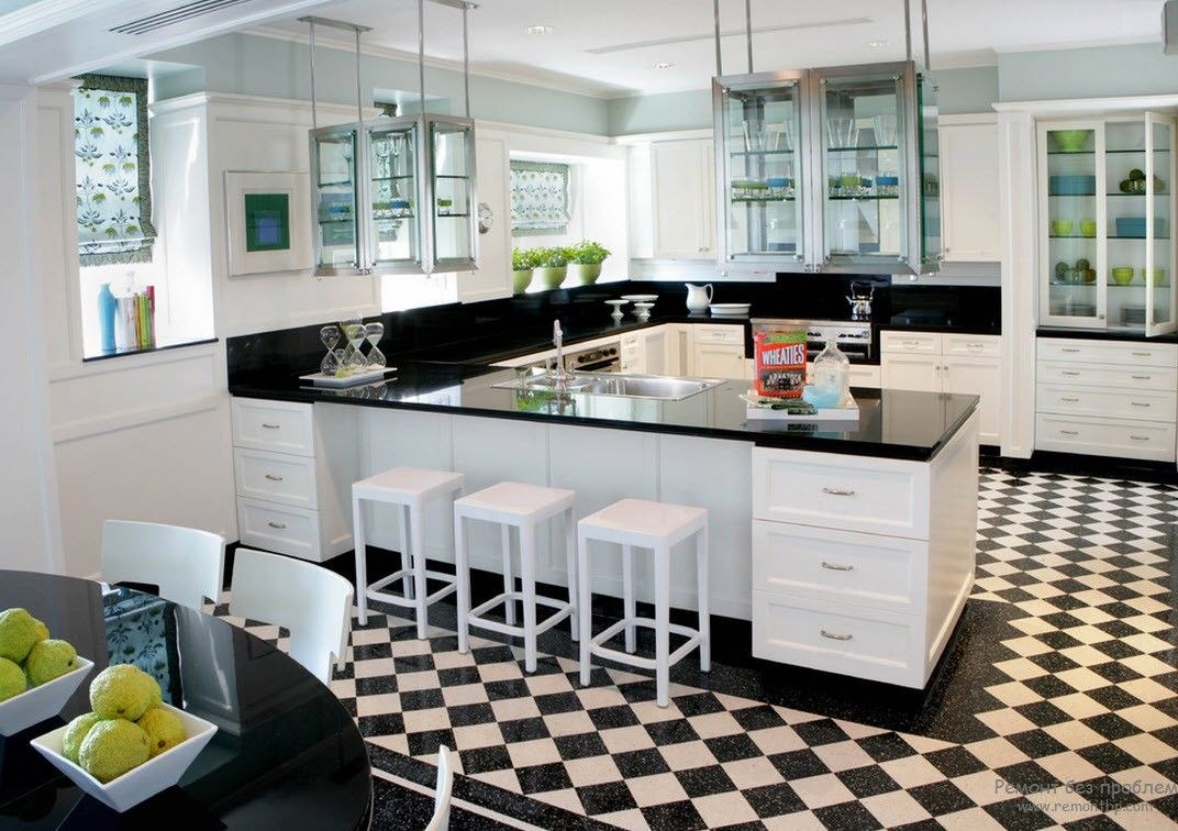 Полы на кухне белые с черным цветом