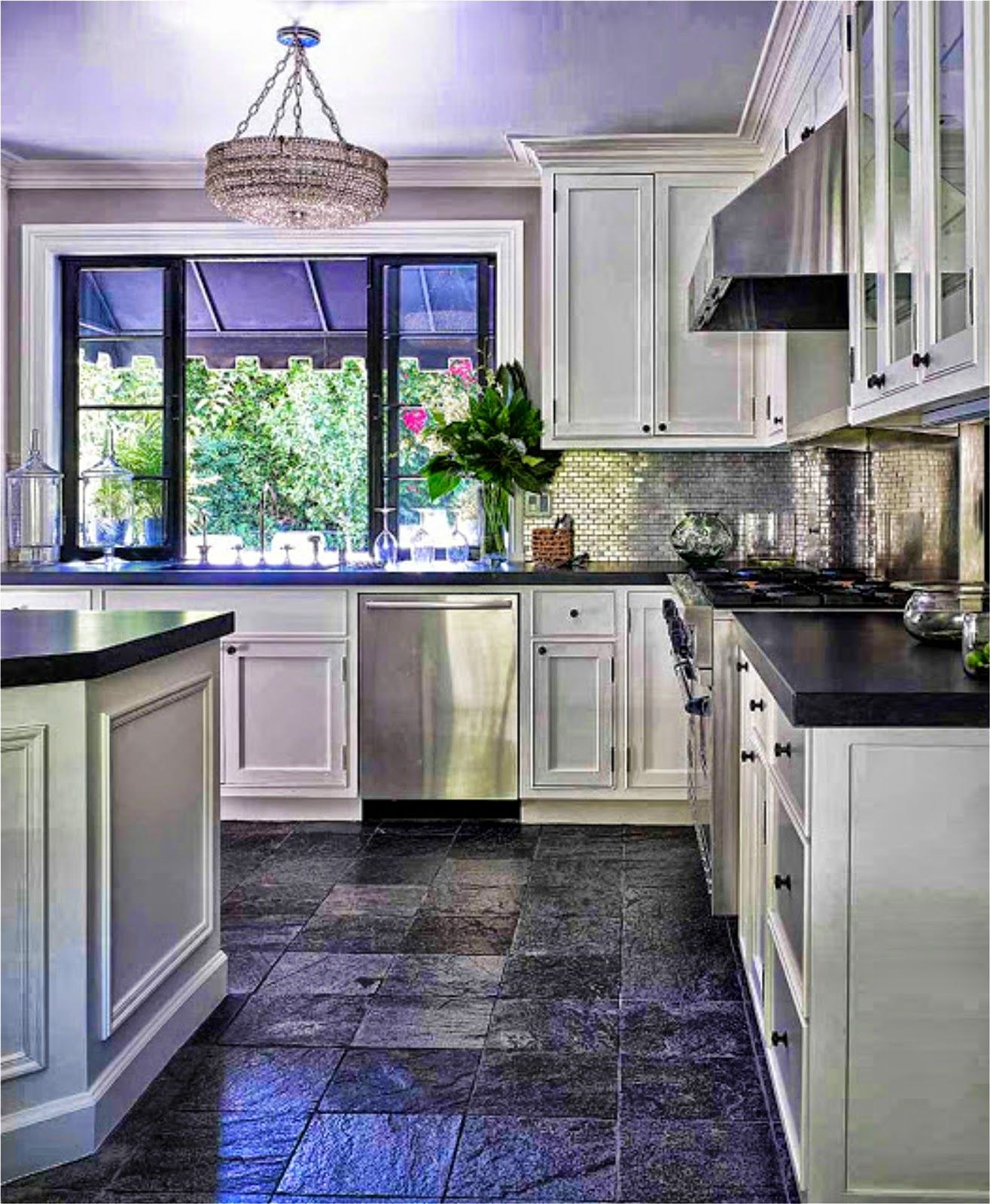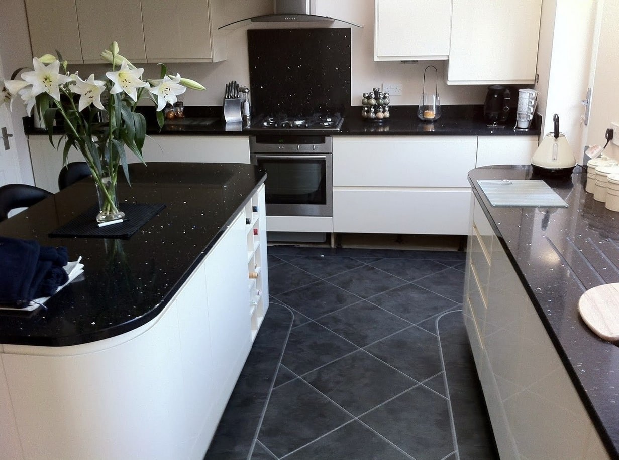 Черный мраморный пол на кухне