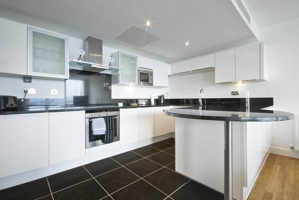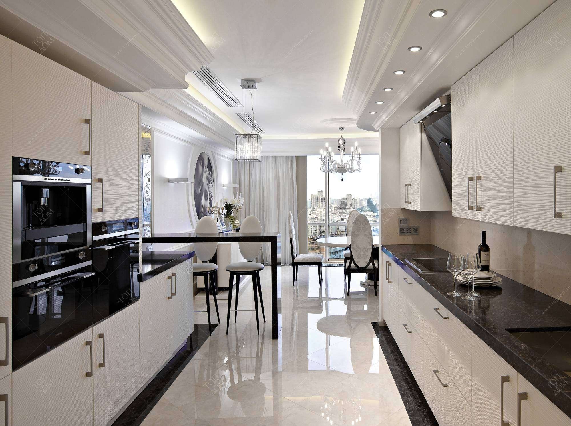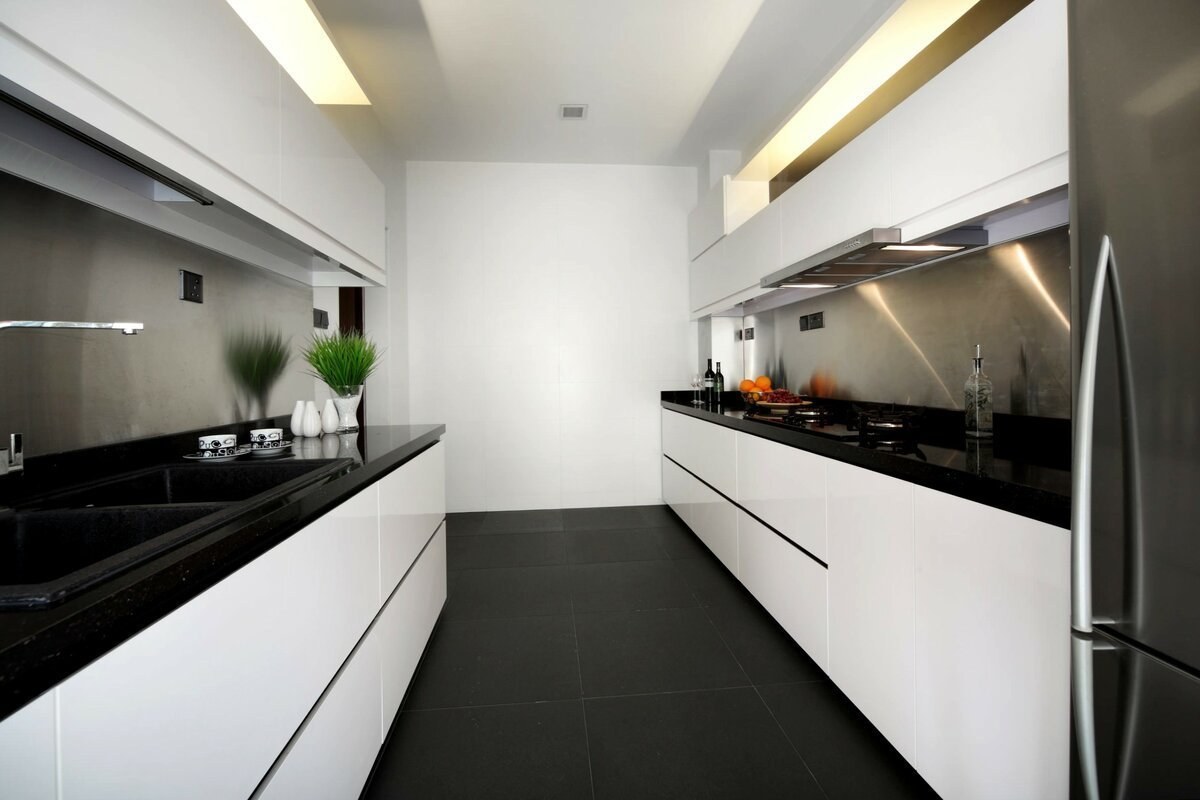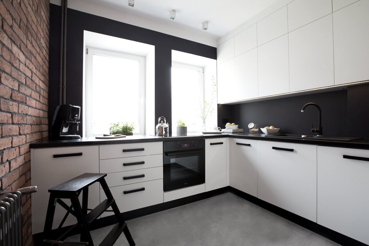 Чёрно белая кухня беллый пол