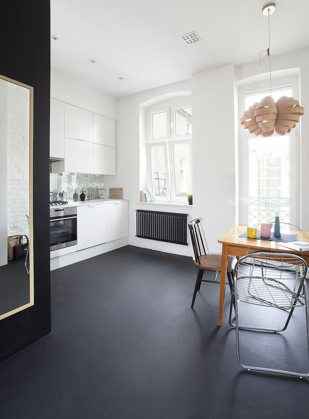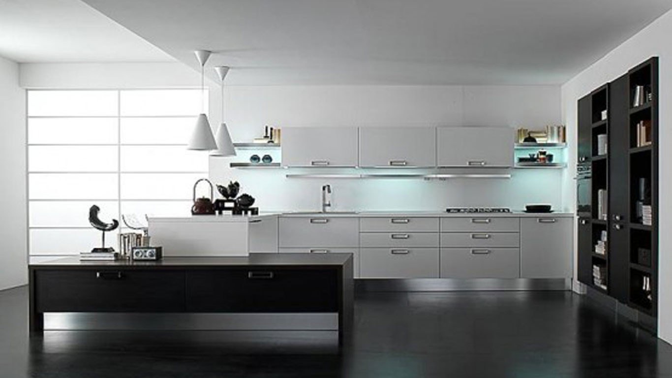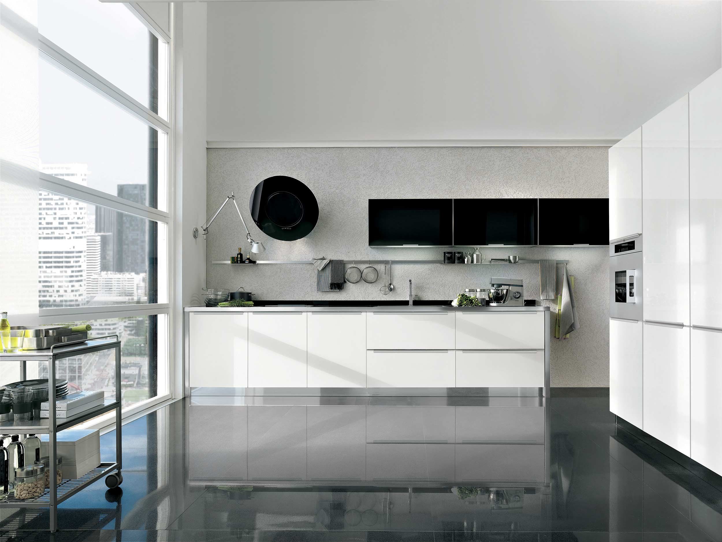 Чёрно белая кухня беллый пол