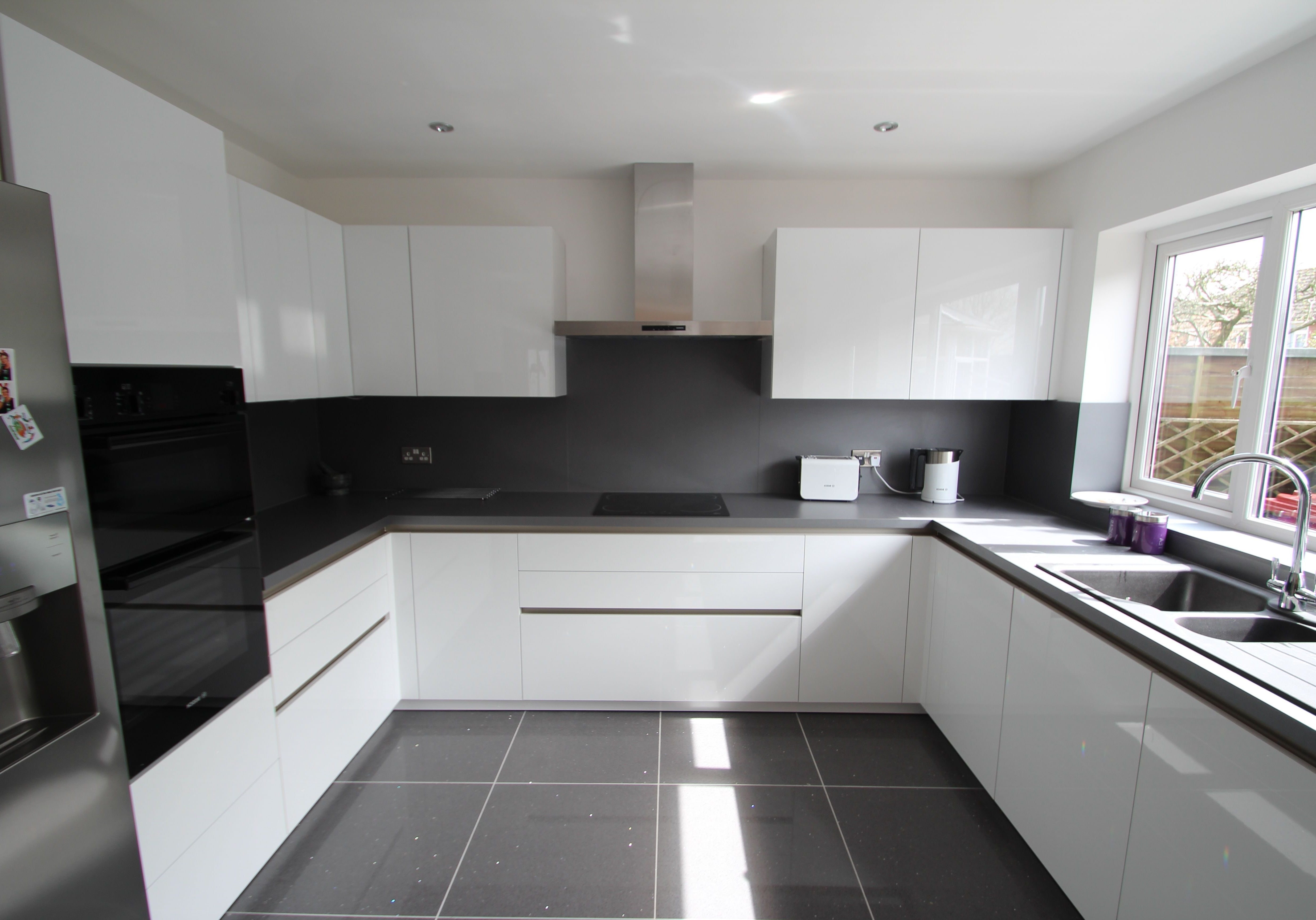 Белая глянцевая кухня с черной столешницей