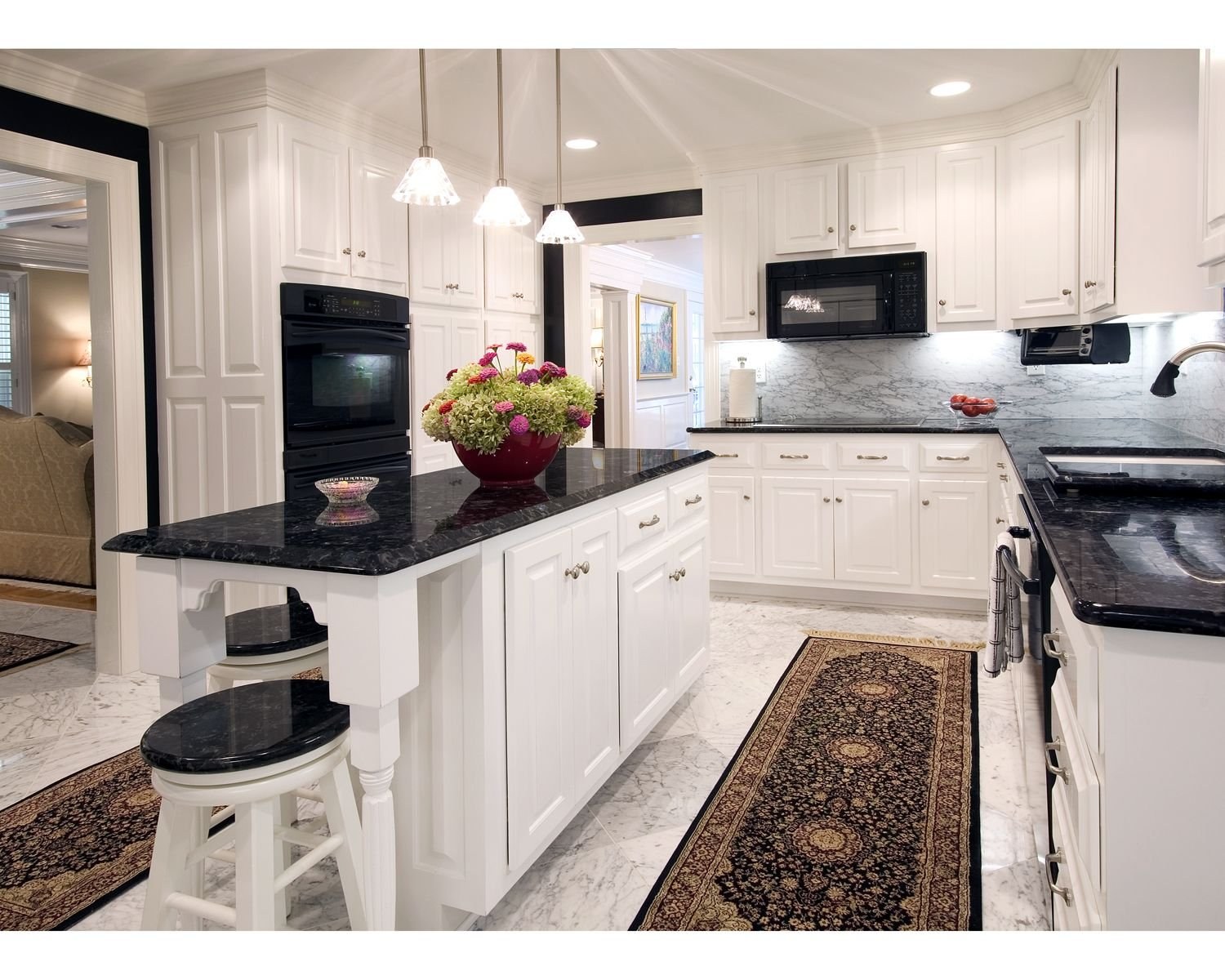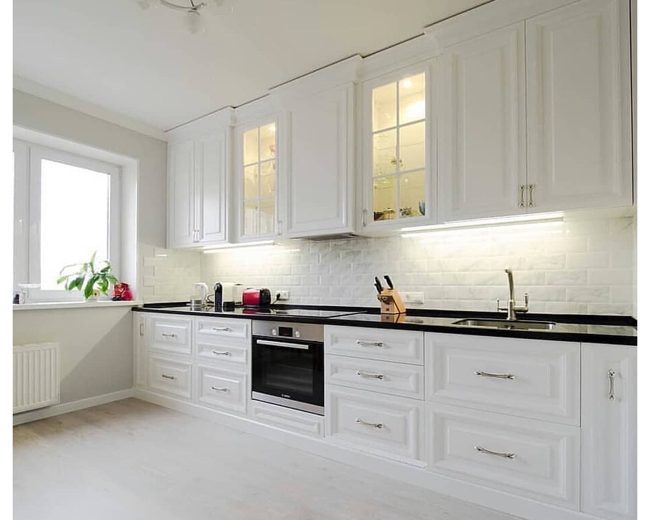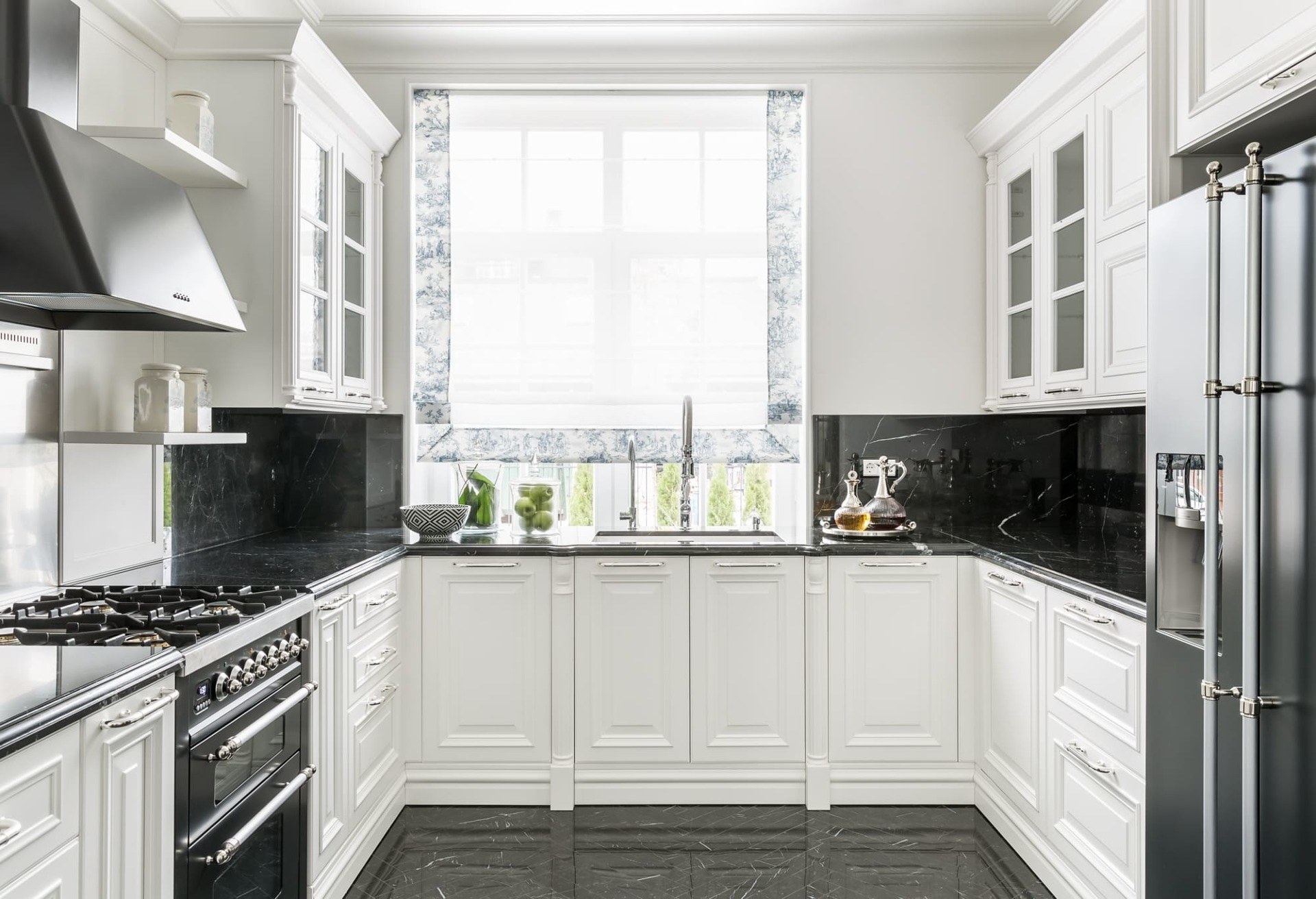 Белая классическая кухня с черной столешницей
