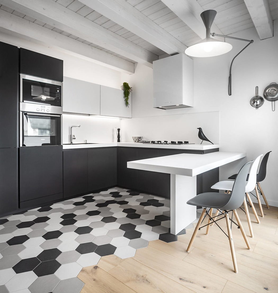 Черно-белая плитка на пол в кухне