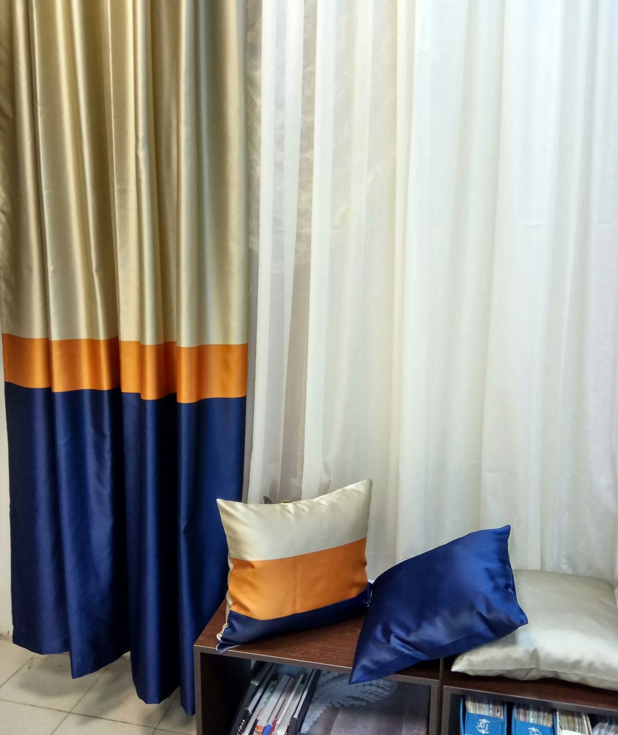 Шторы синие с бежевым