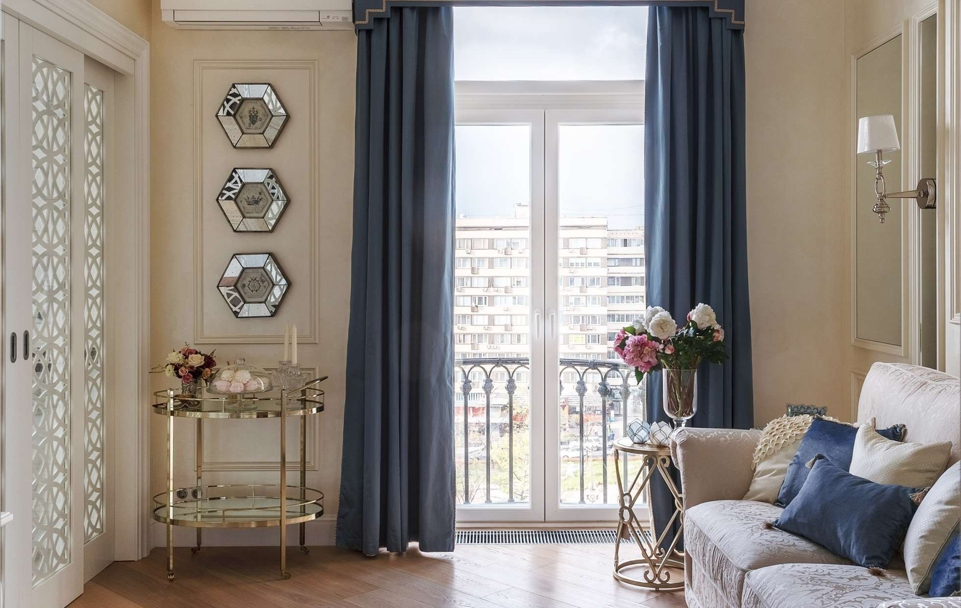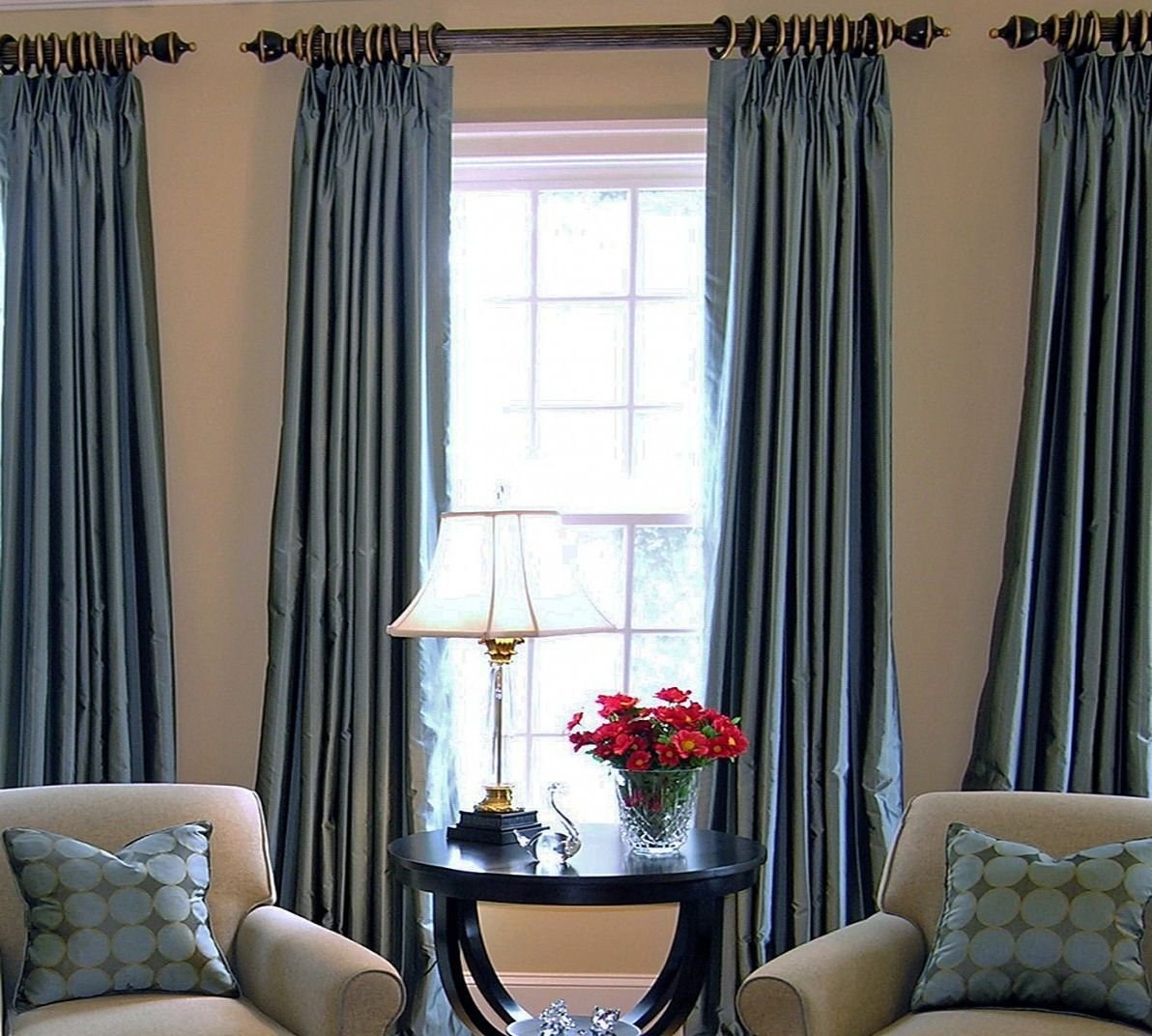 Серо голубые шторы в интерьере