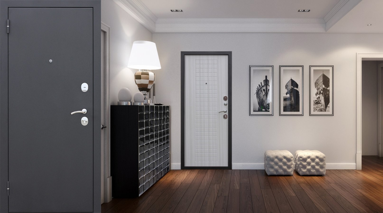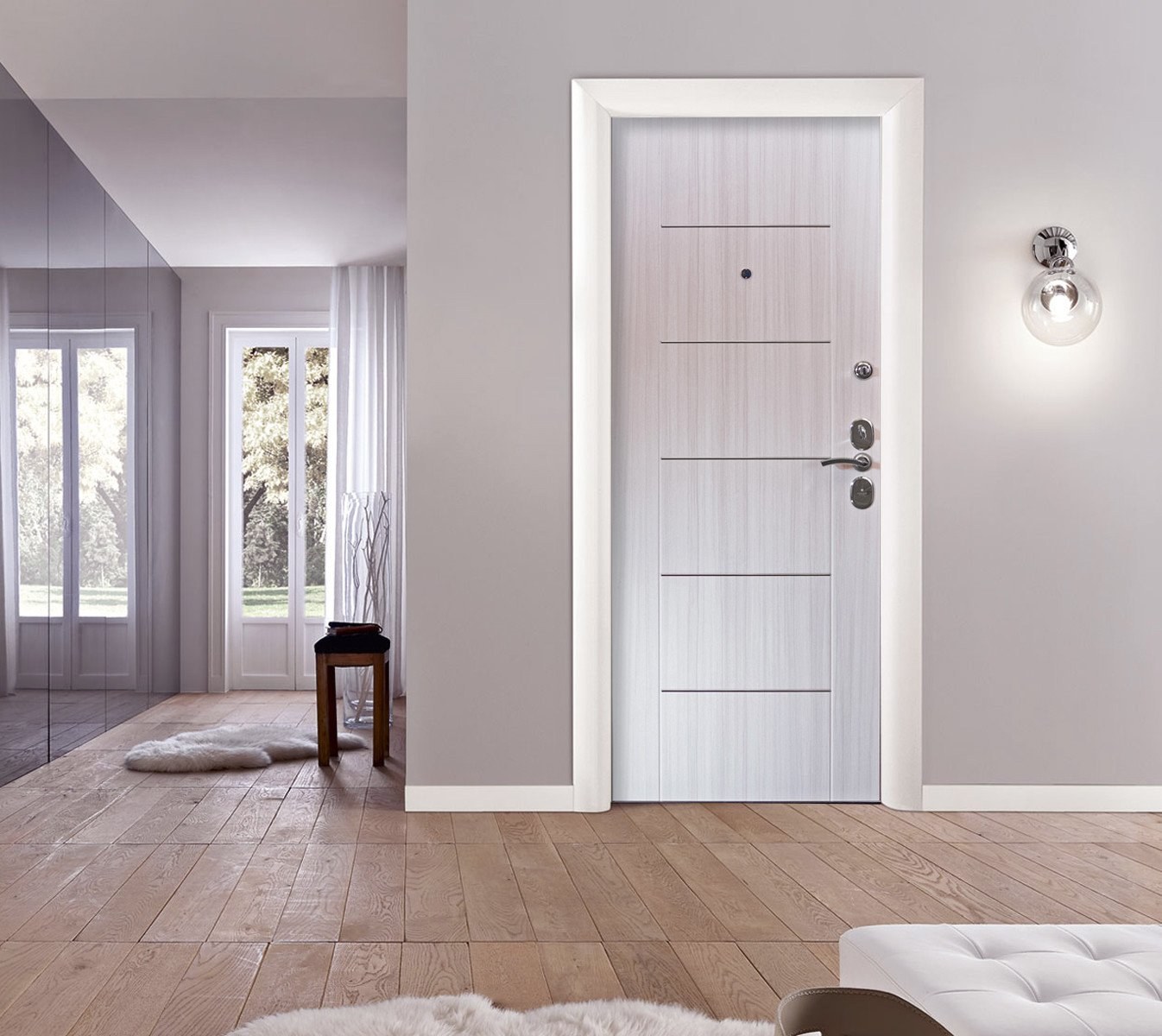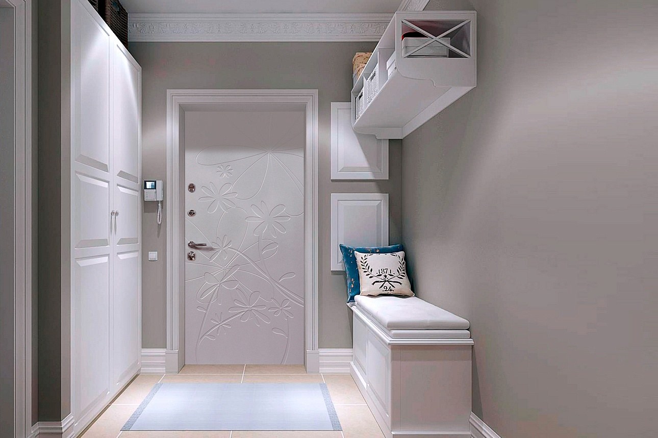 Белая входная дверь в интерьере прихожей