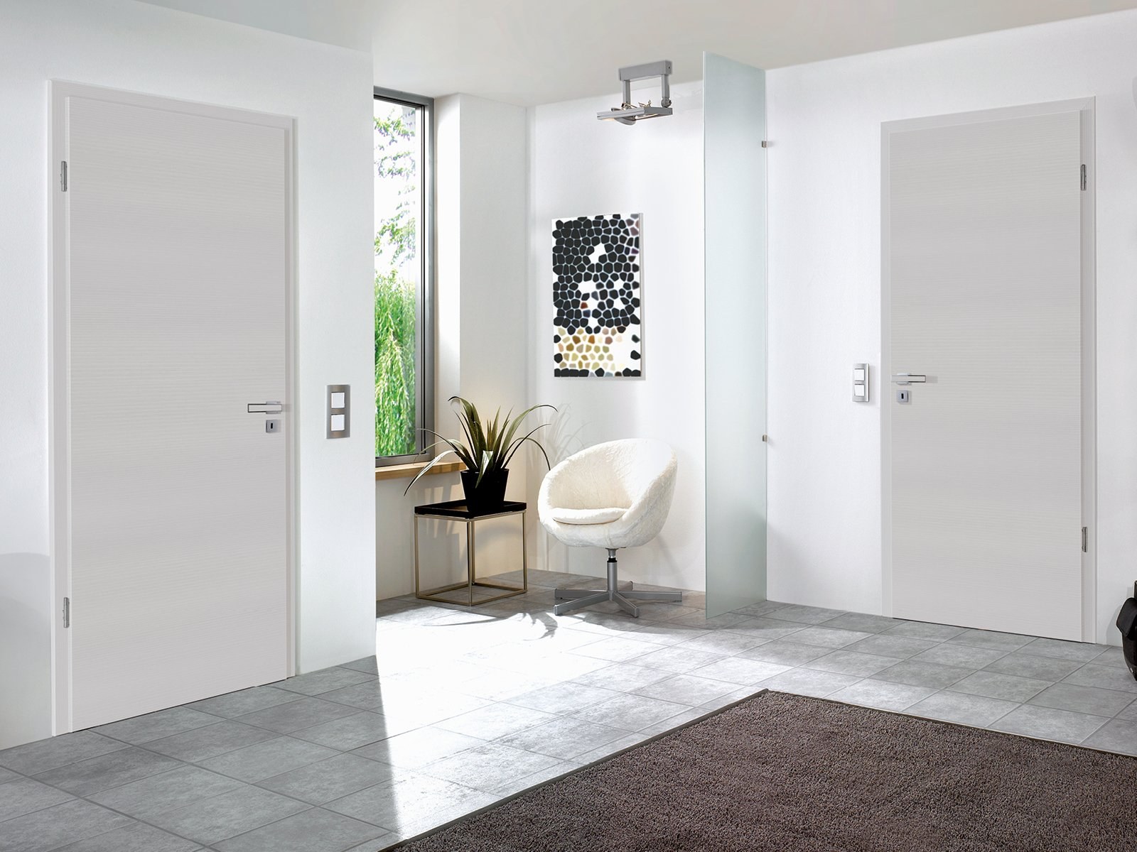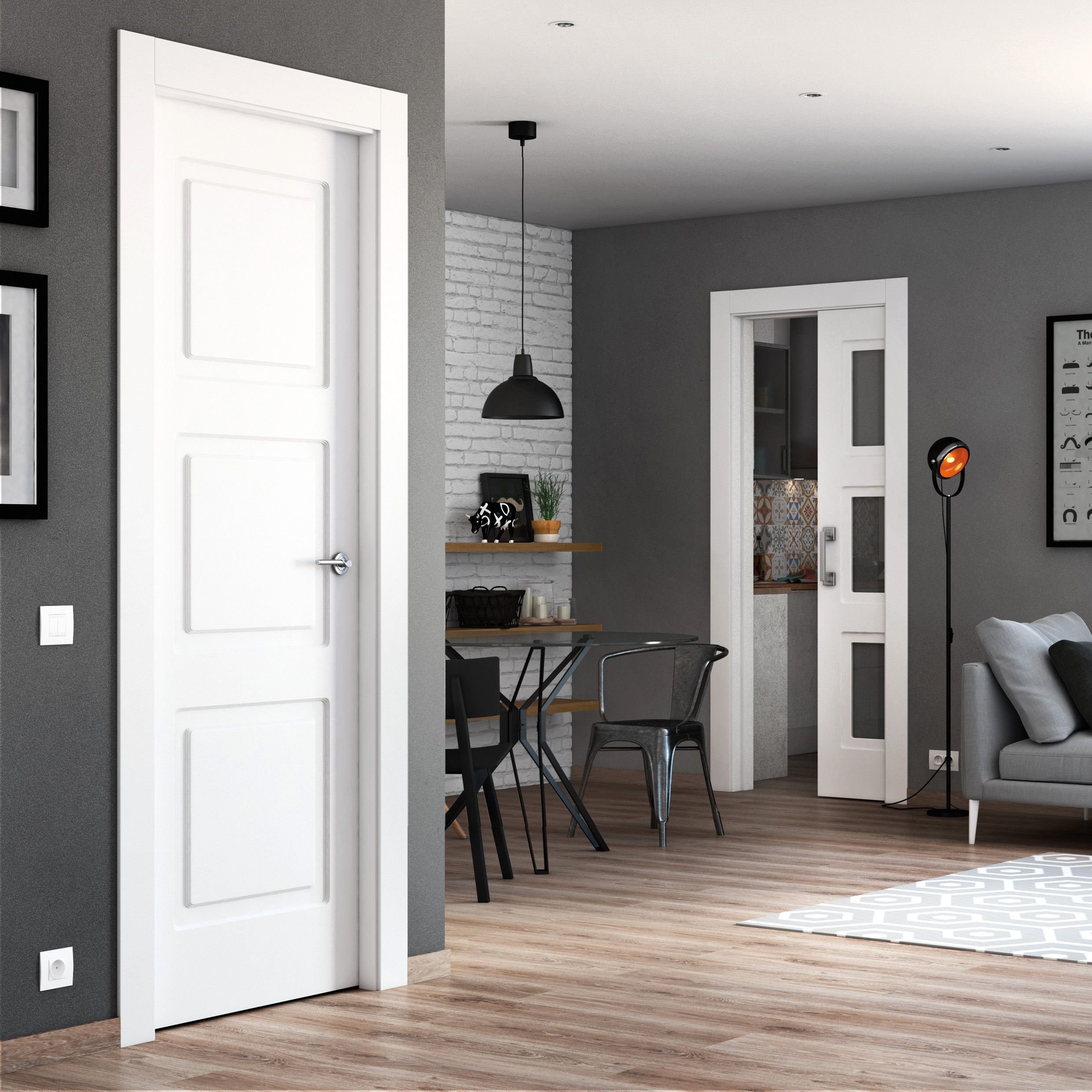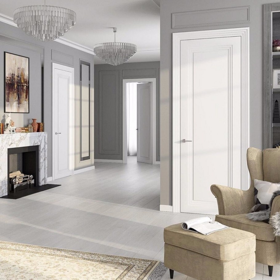 Белые двери в сером интерьере