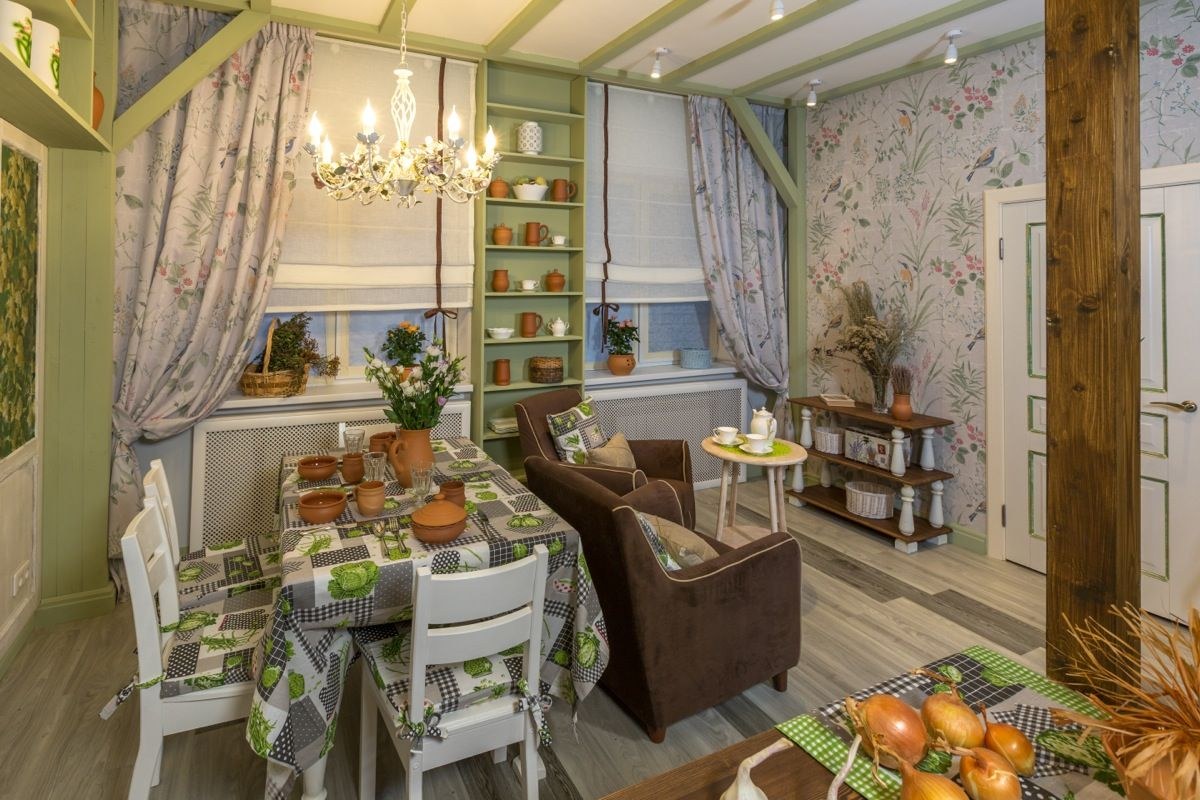Кухня-гостиная бревенчатого дома в стиле Прованс