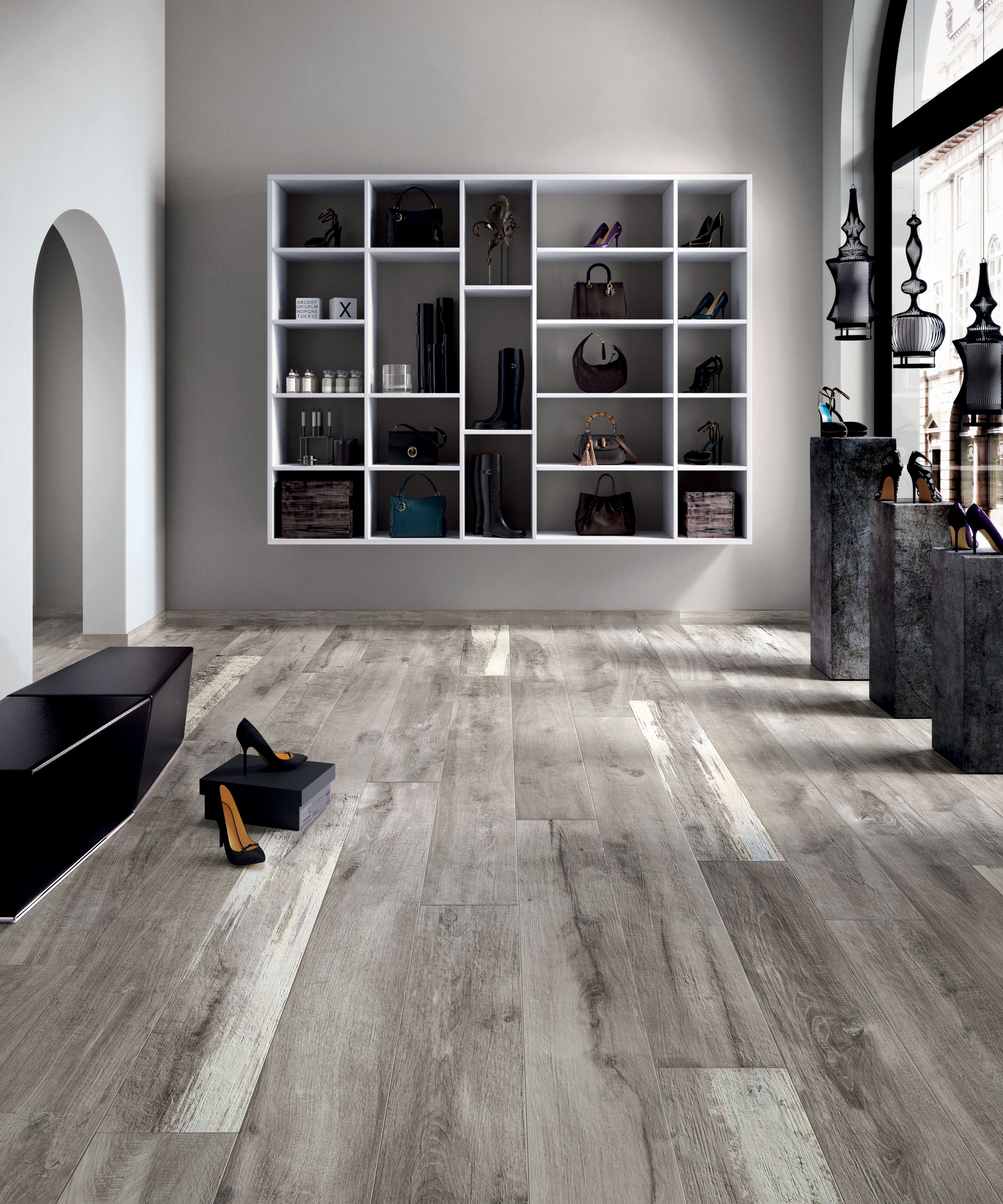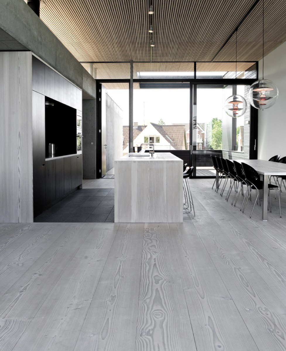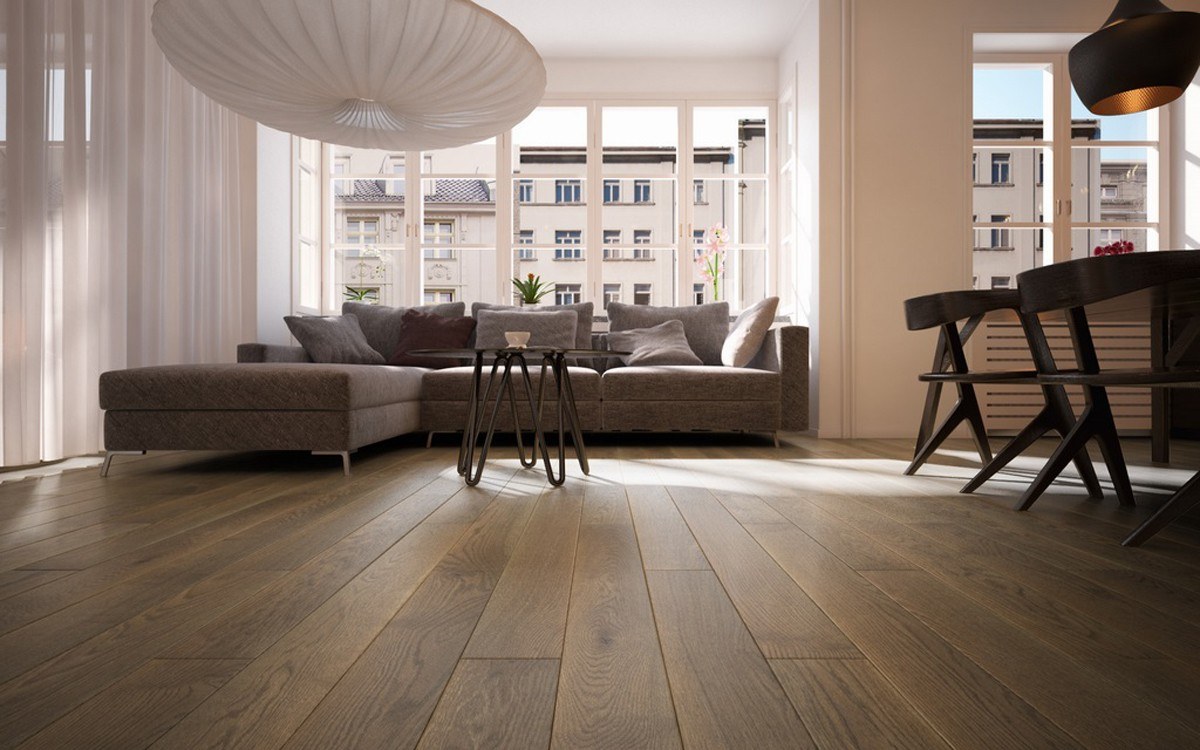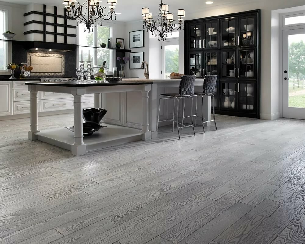 Серый деревянный пол в интерьере