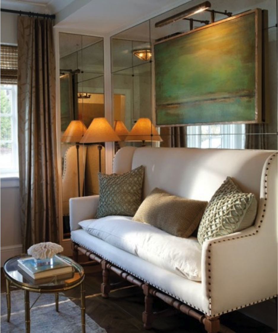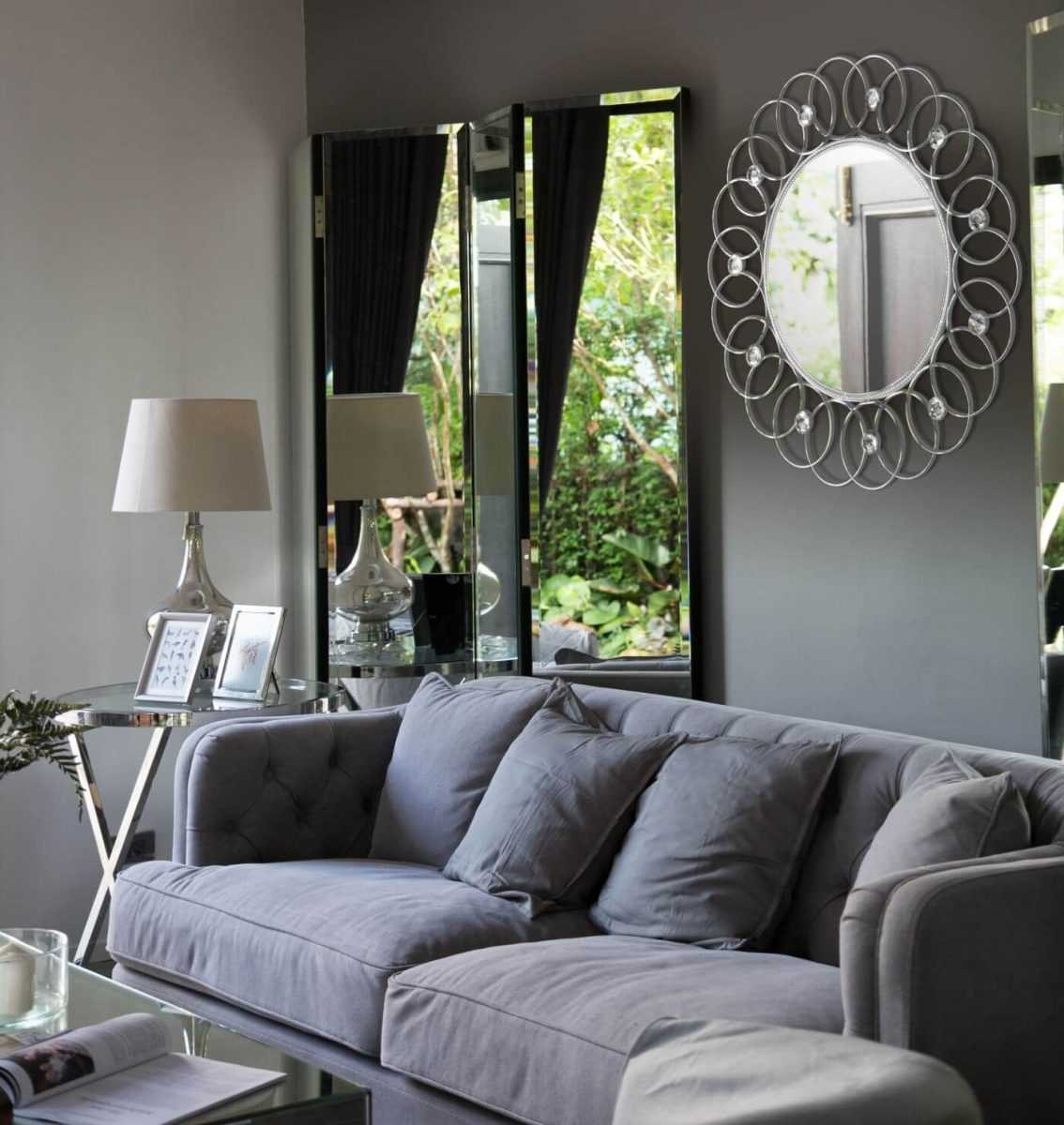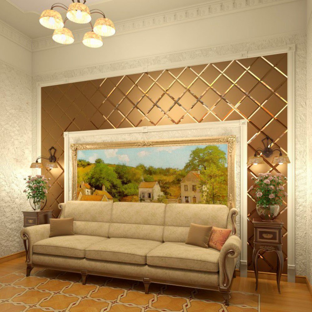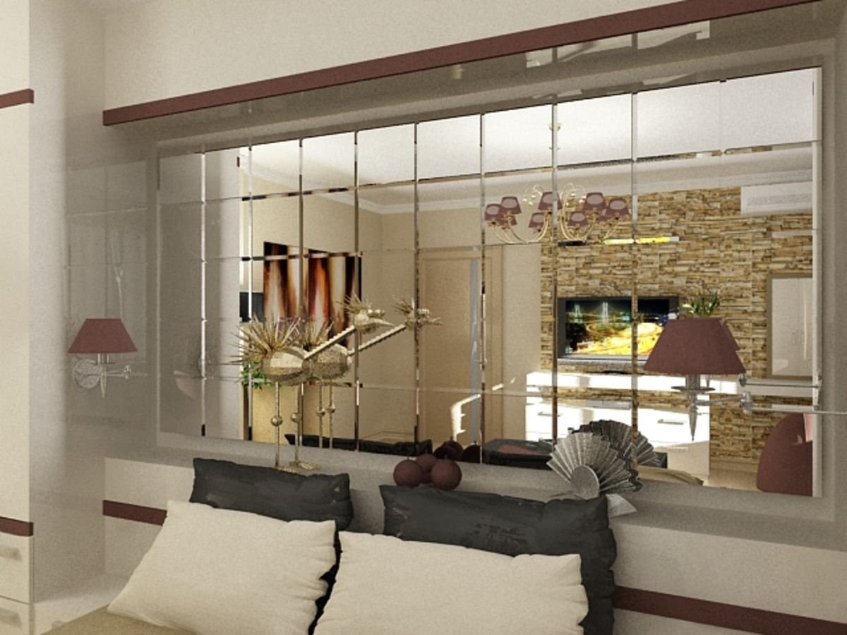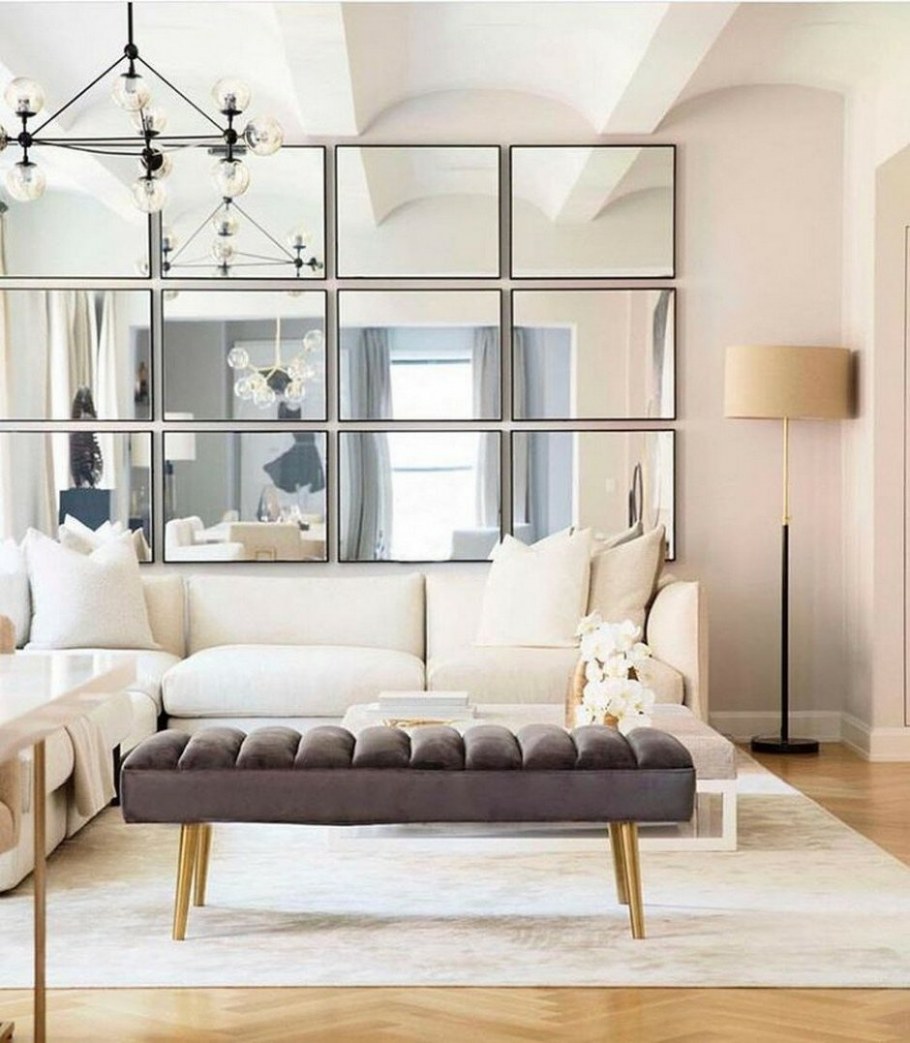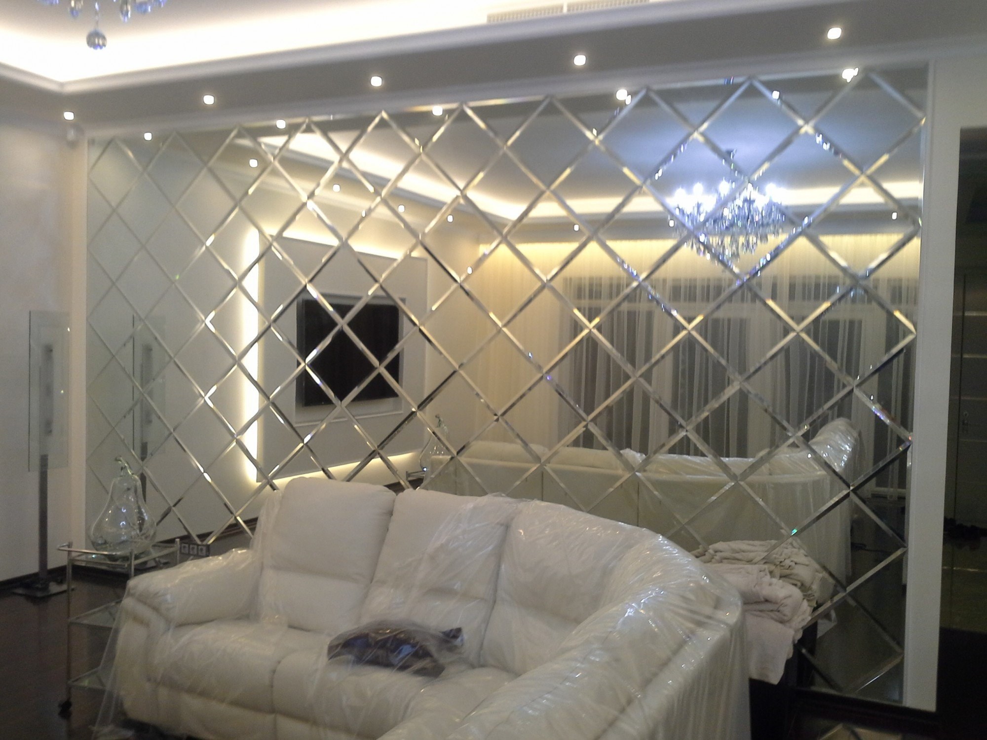 Зеркальное панно в гостиной за диваном в интерьере (77 фото)