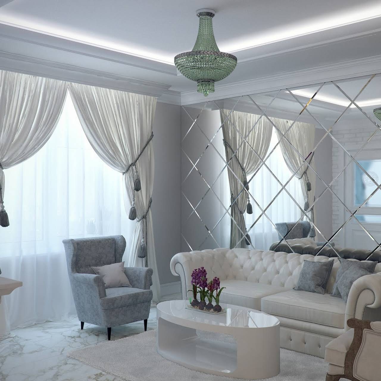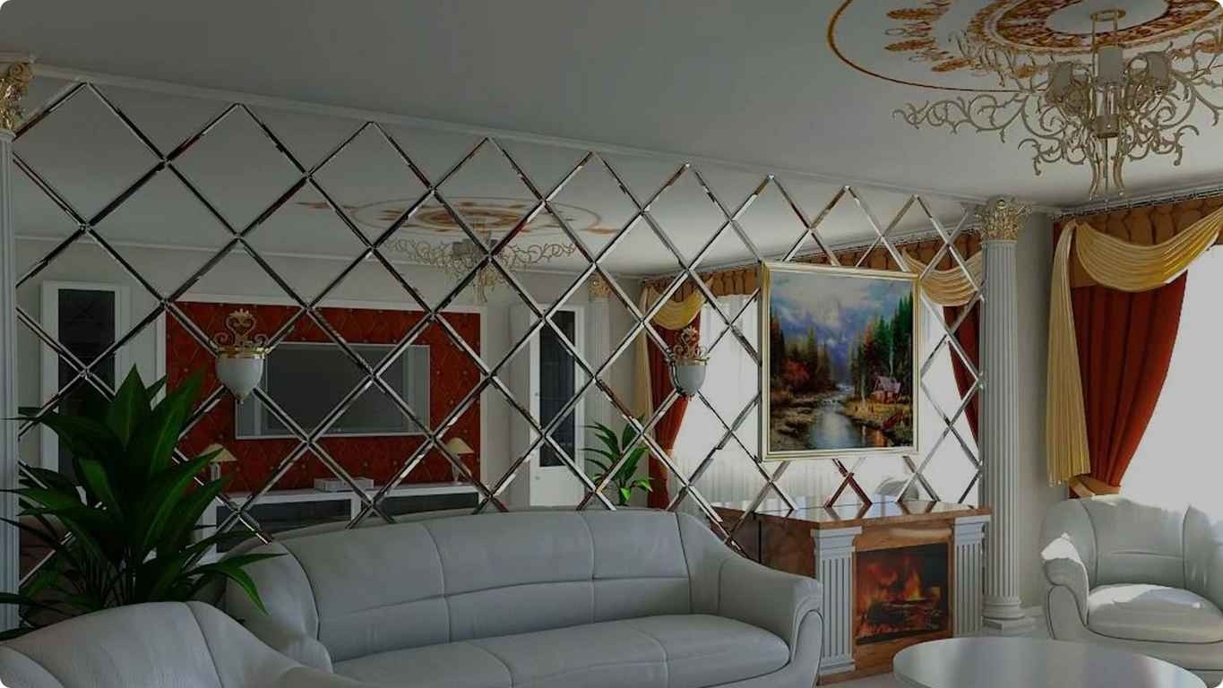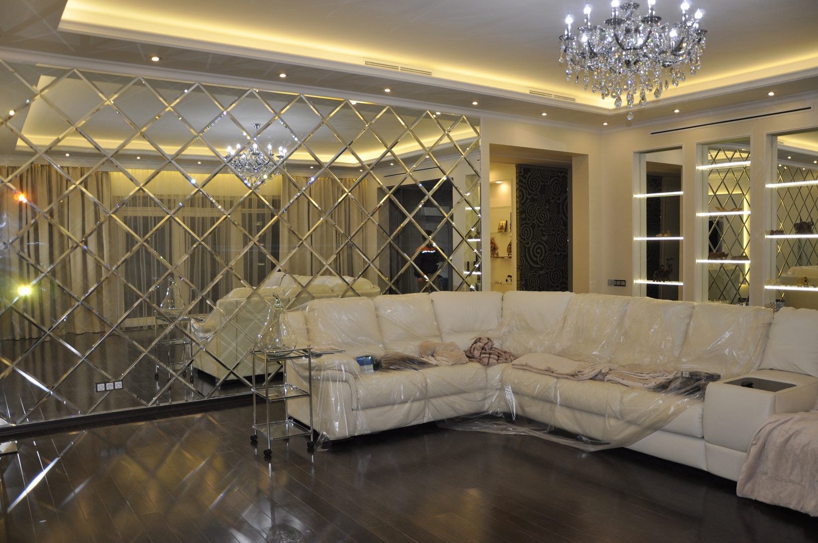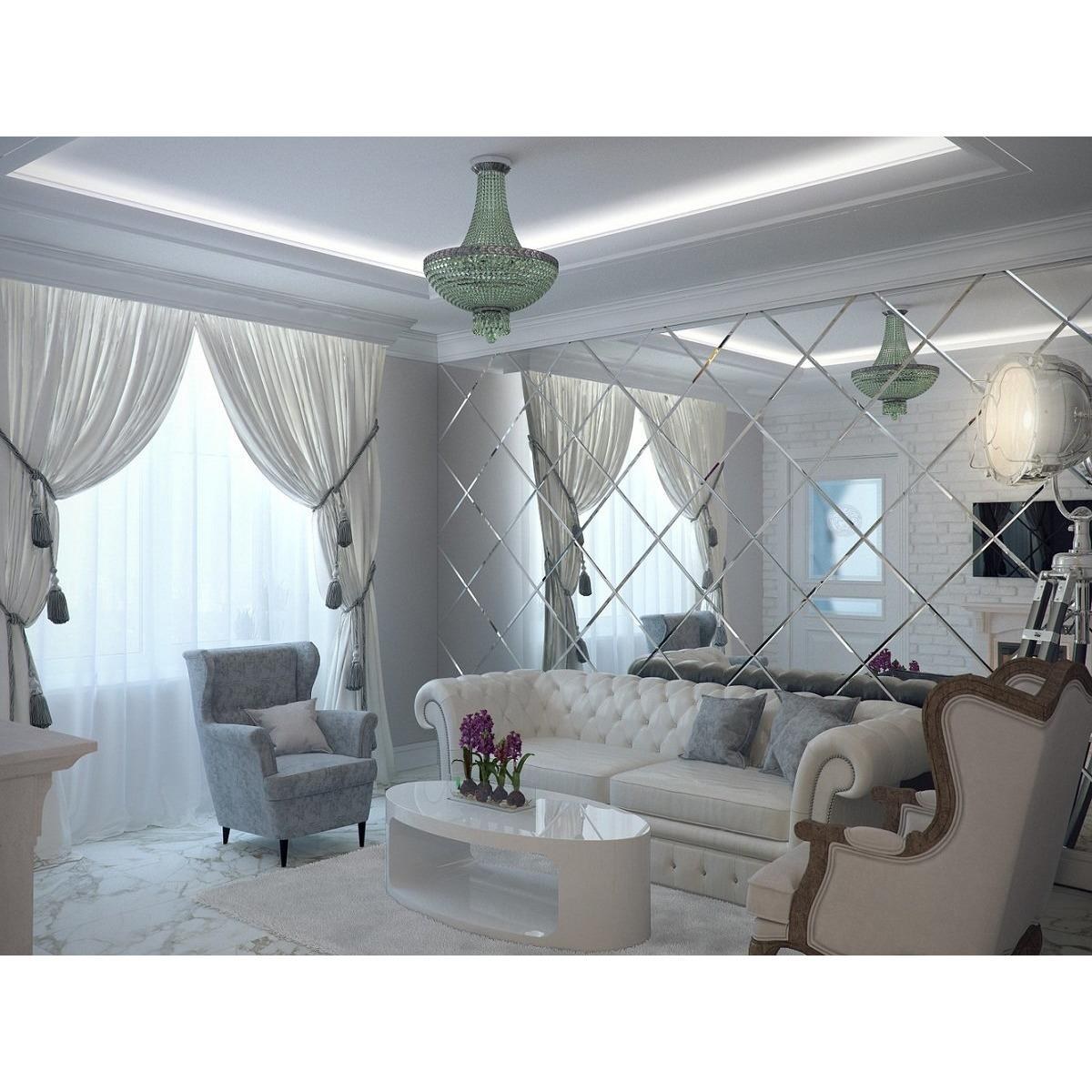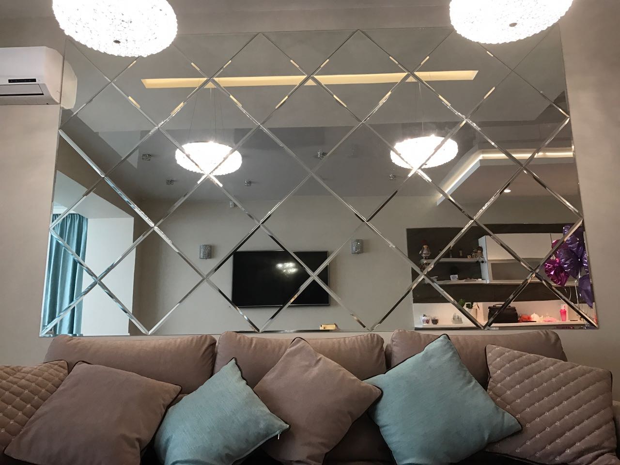 Зеркальное панно в гостиной за диваном в интерьере (77 фото)