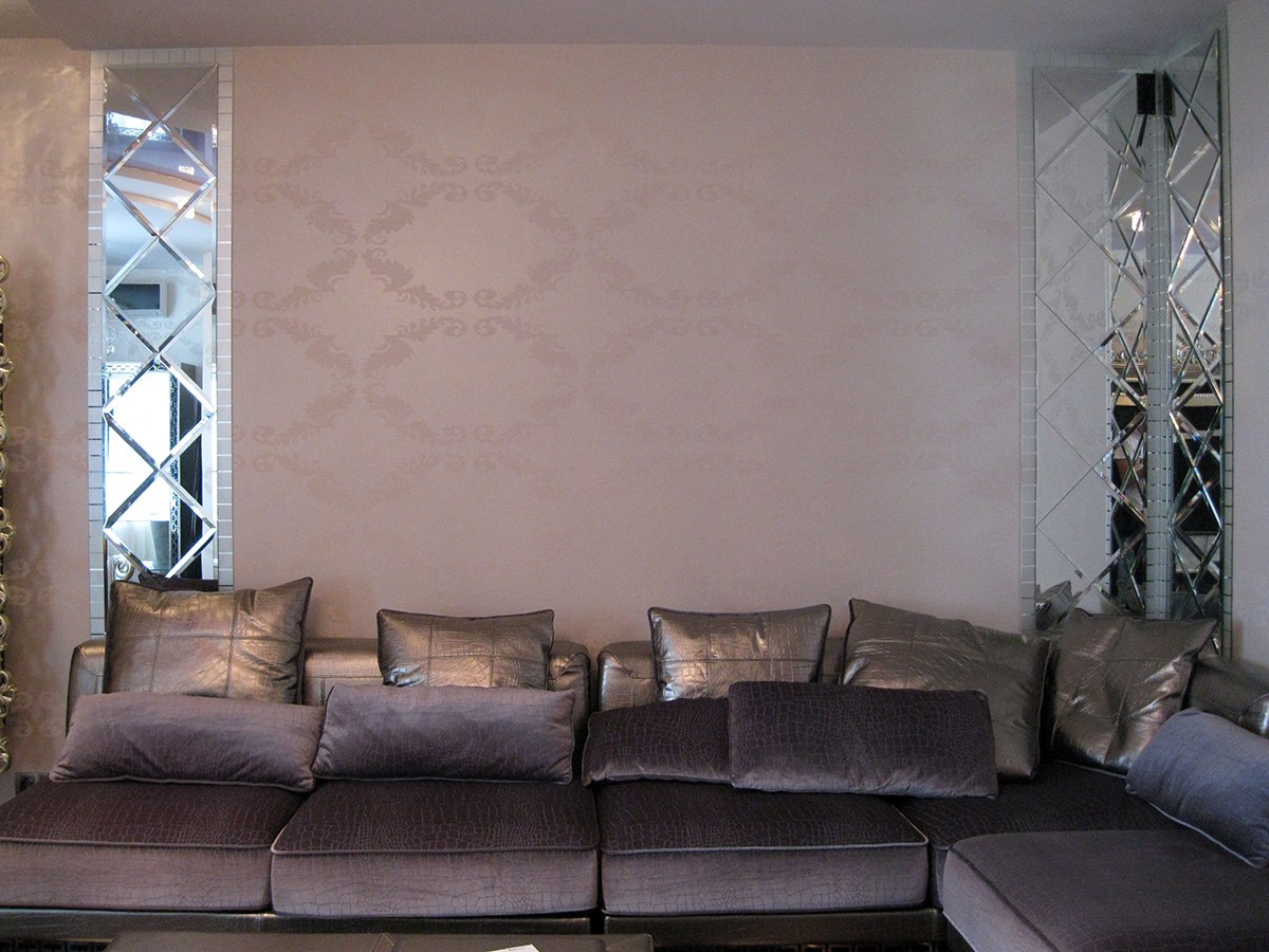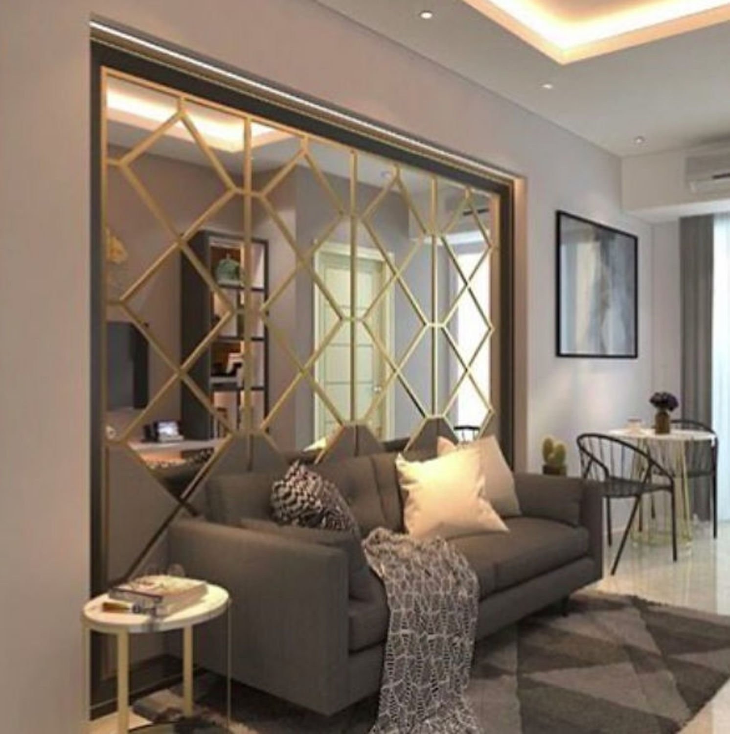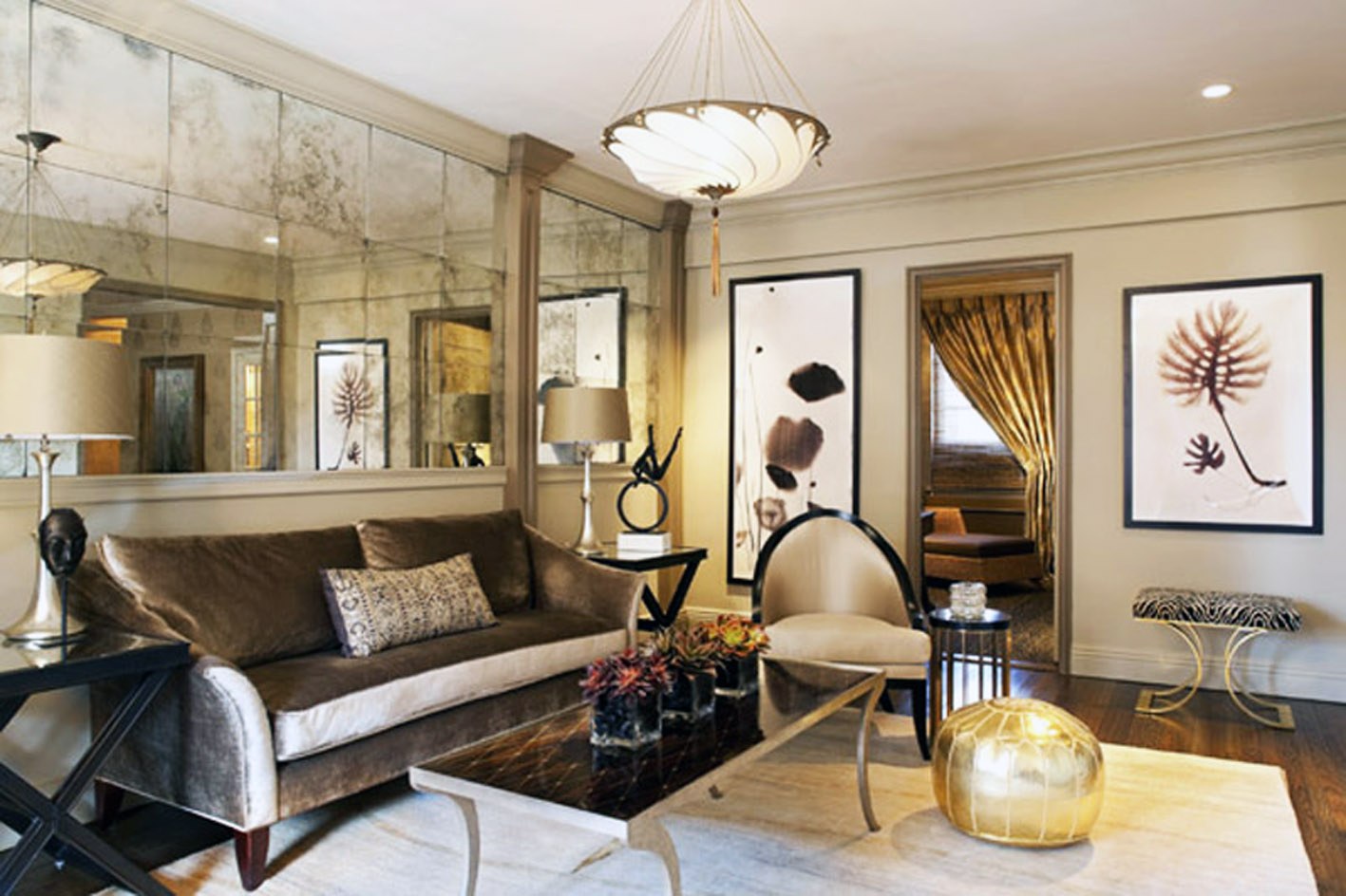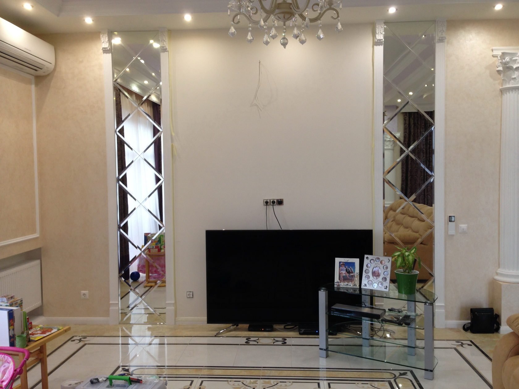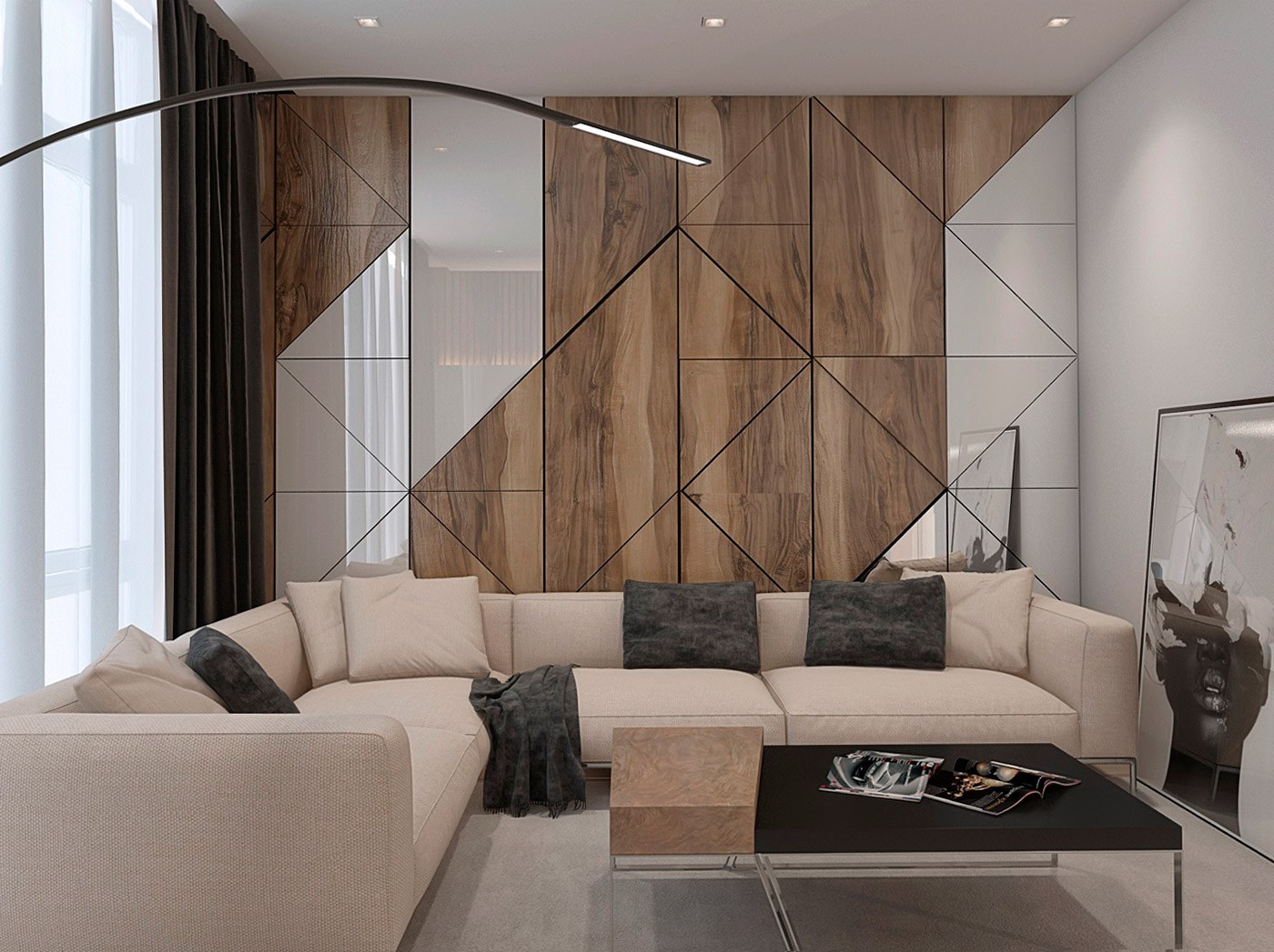 Зеркальное панно в гостиной за диваном в интерьере (77 фото)