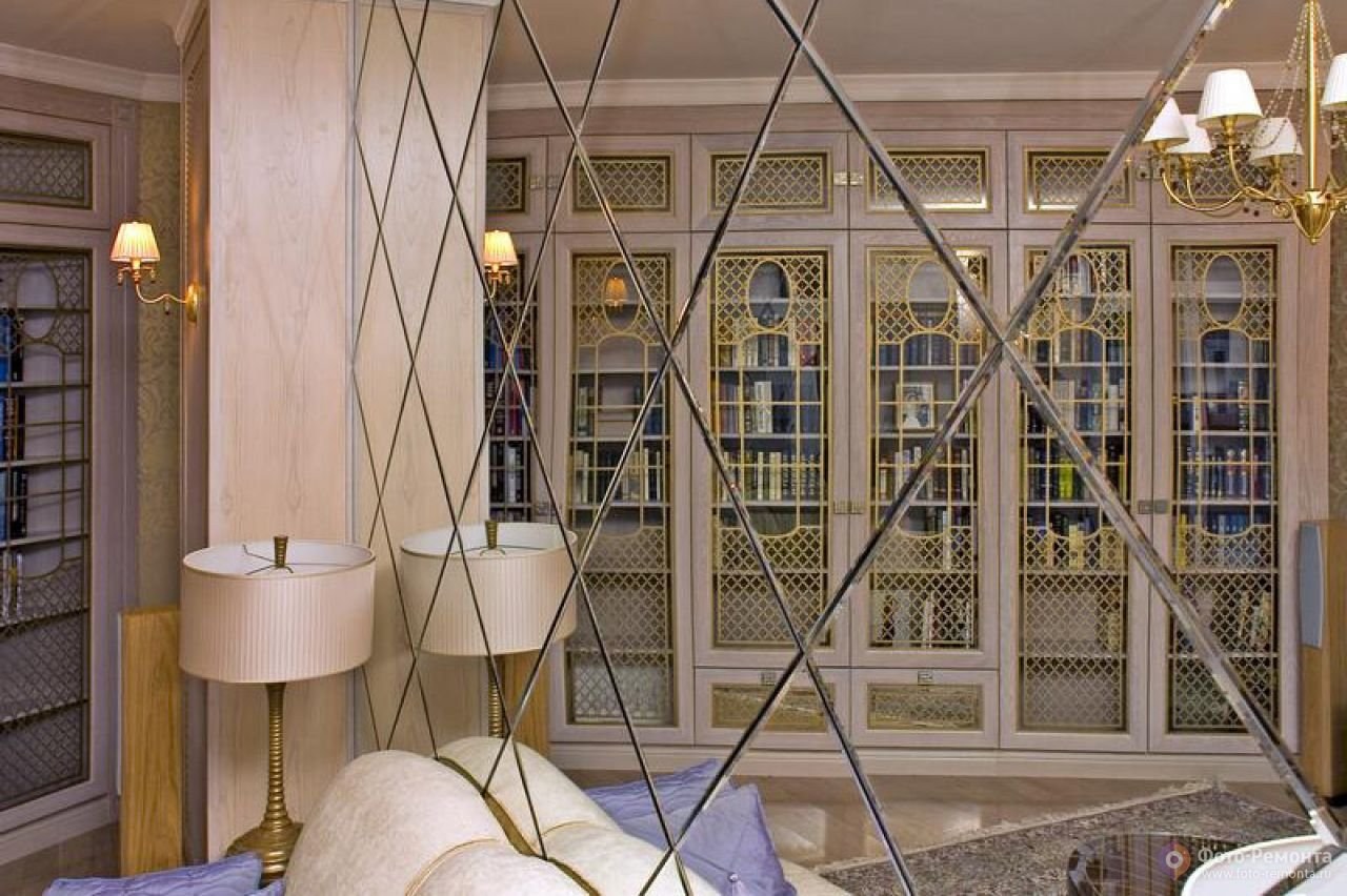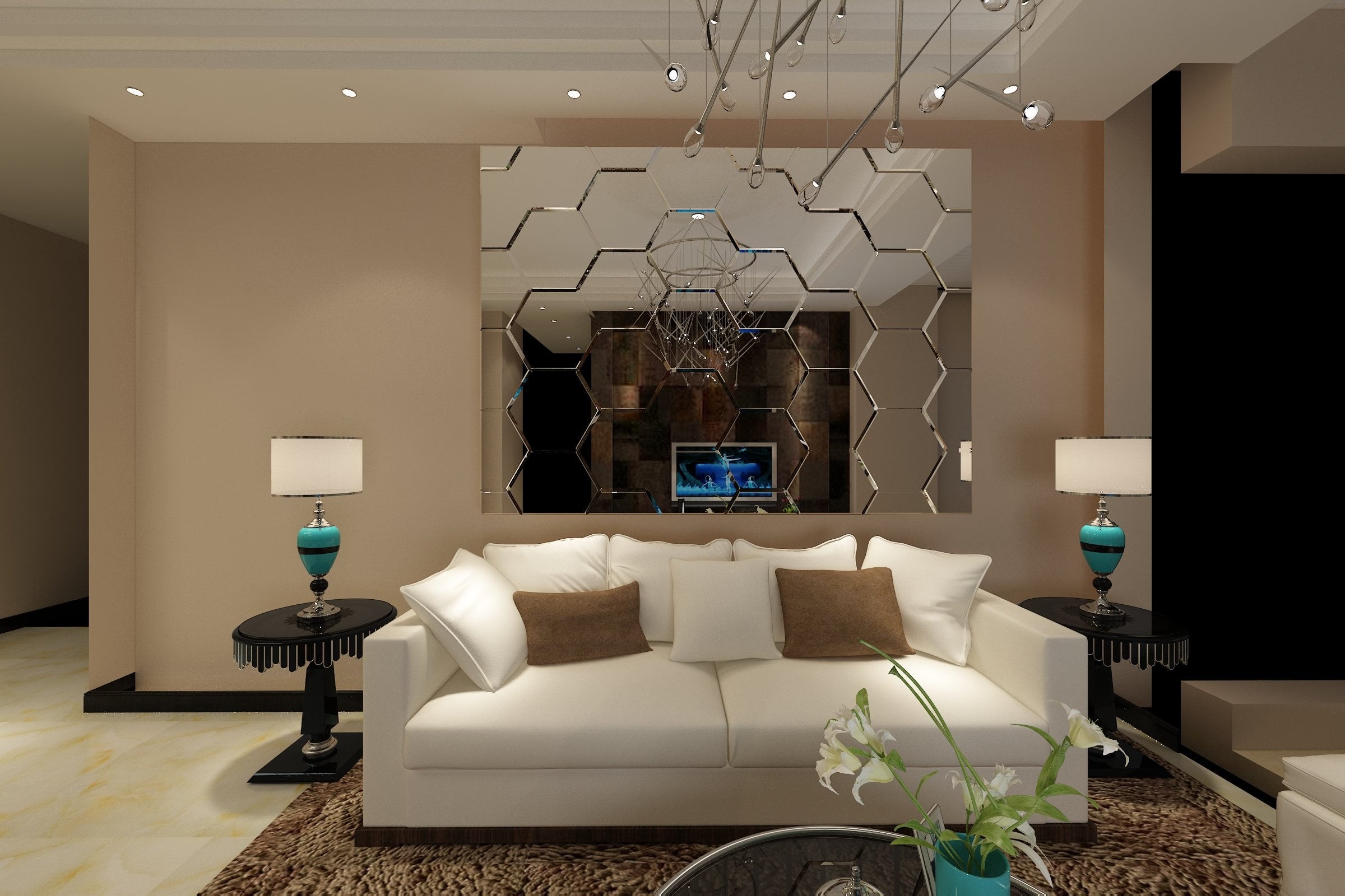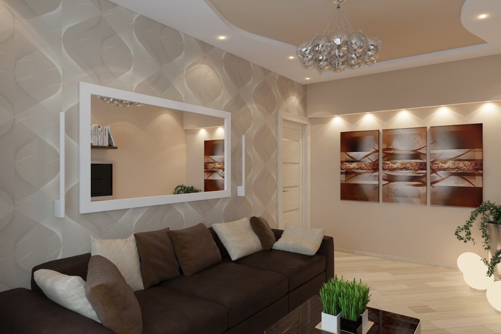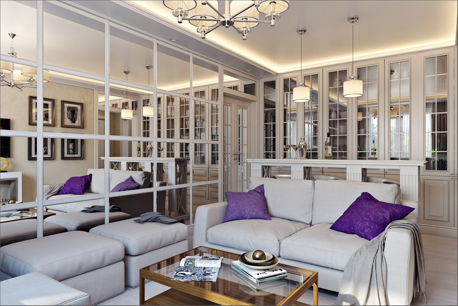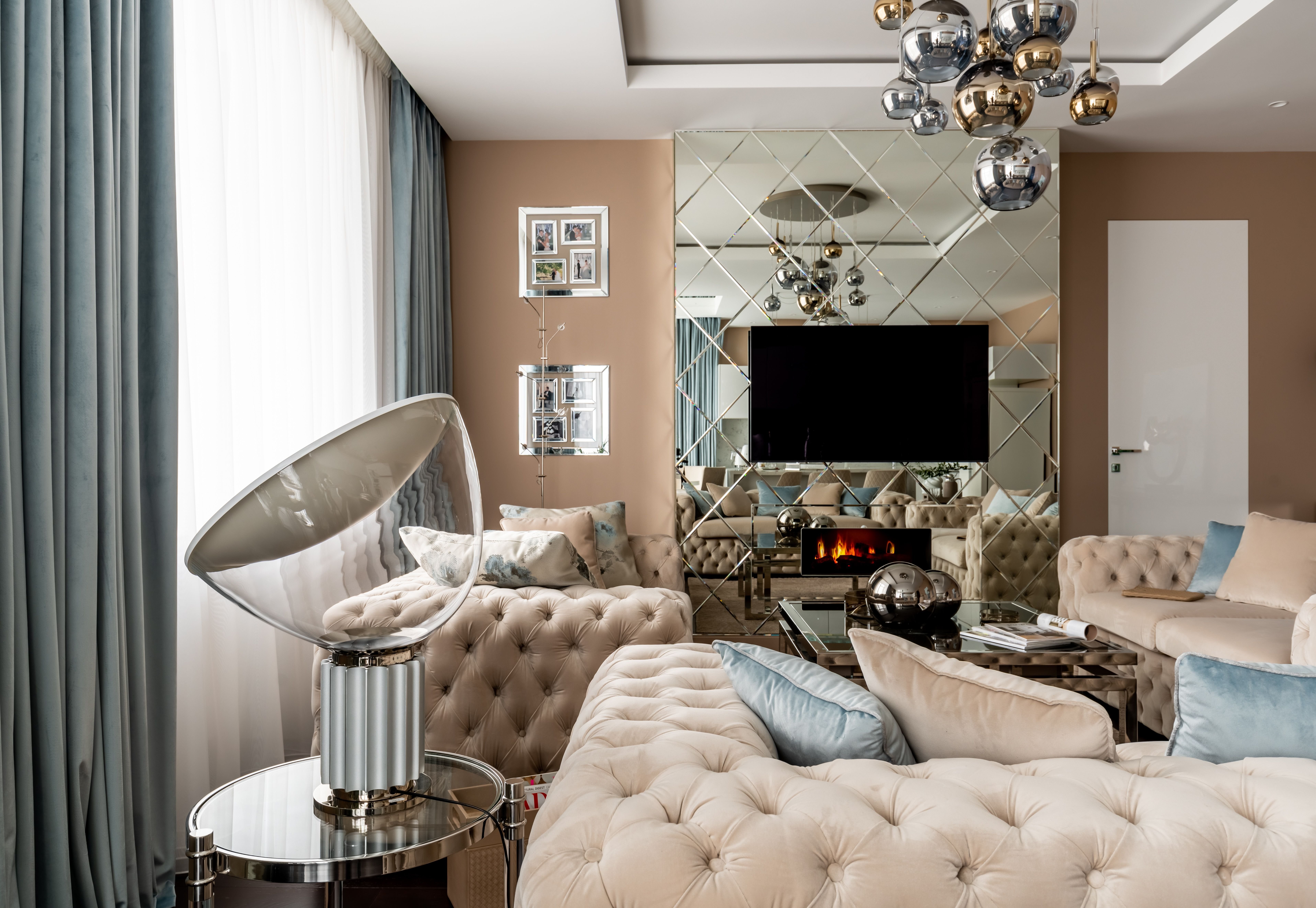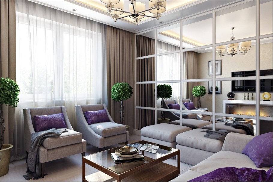Зеркальное панно в гостиной за диваном в интерьере (77 фото)