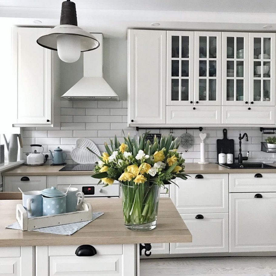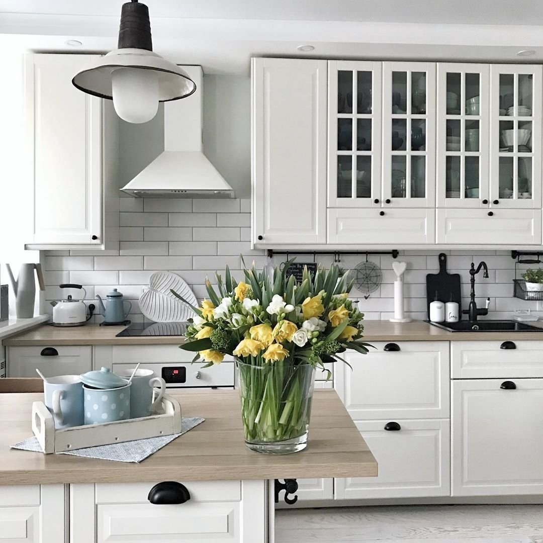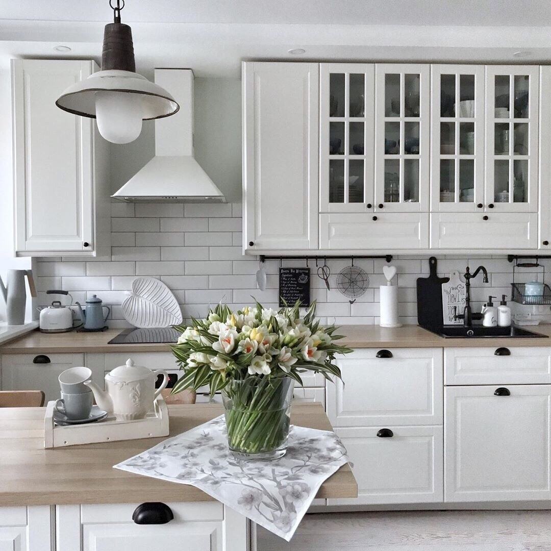Кухня Будбин икеа белая с деревянной столешницей
