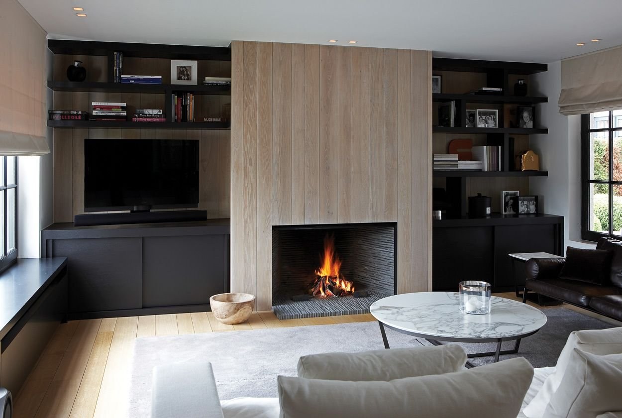 Гостиная с камином и полками