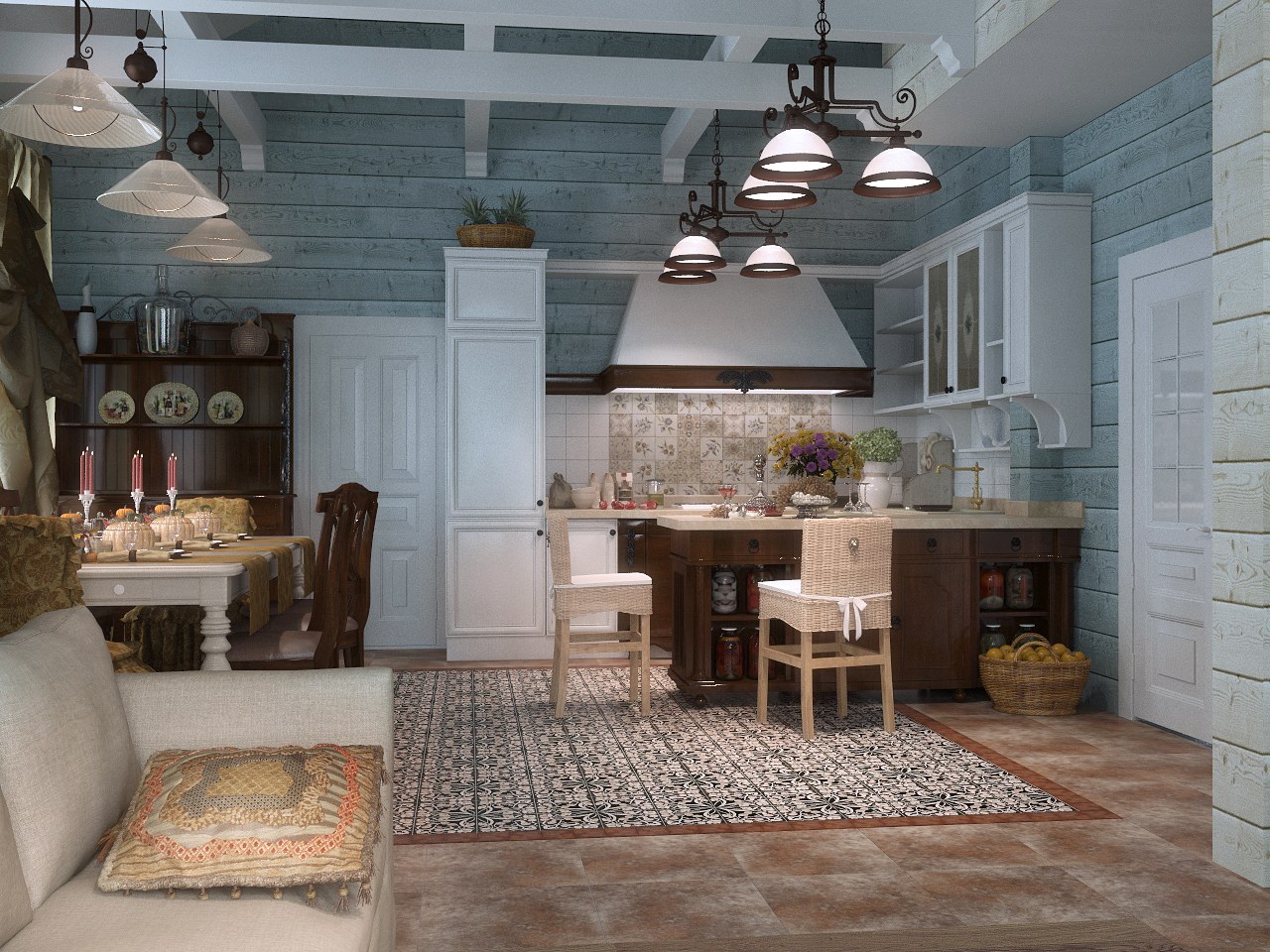 Интерьер кухни гостиной в стиле Прованс в загородном доме