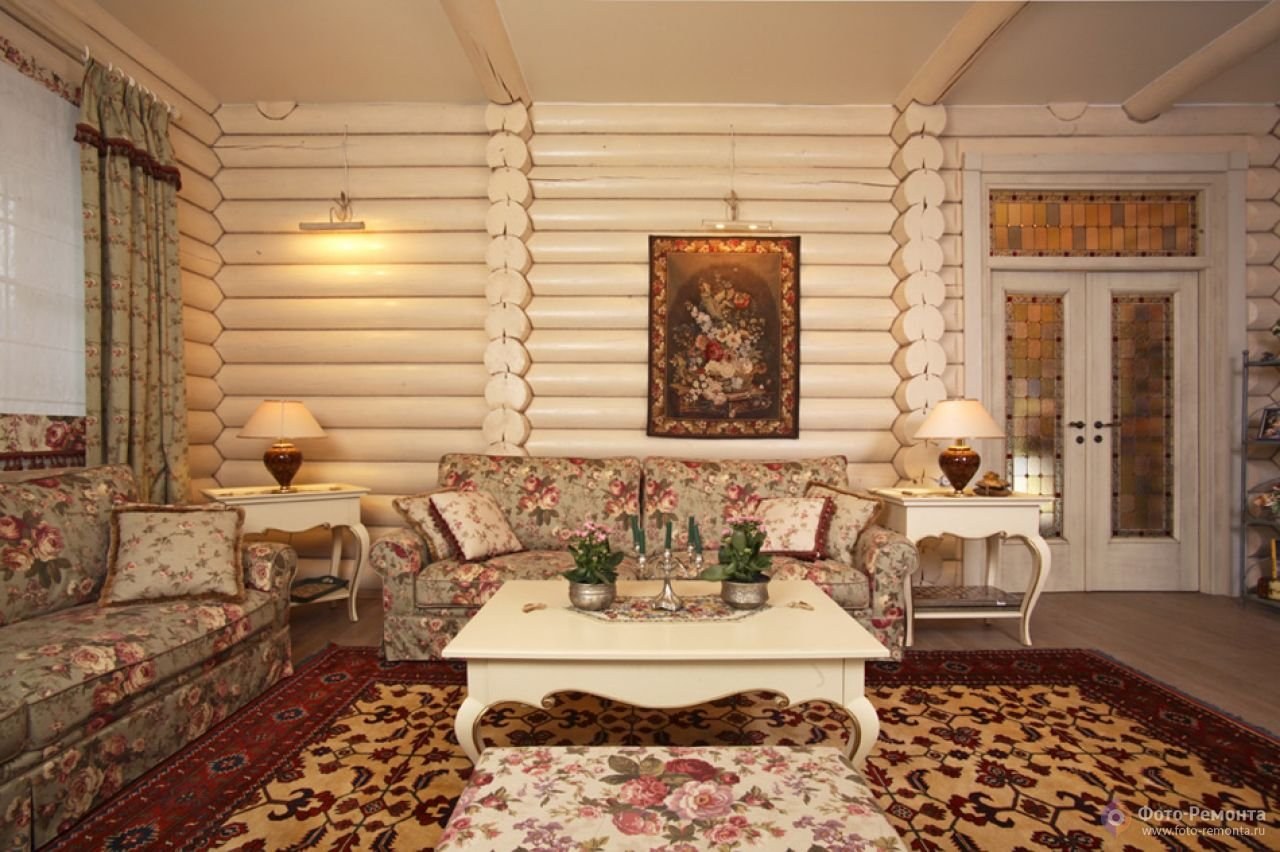 Гостиная Прованс Кантри в бревенчатом доме