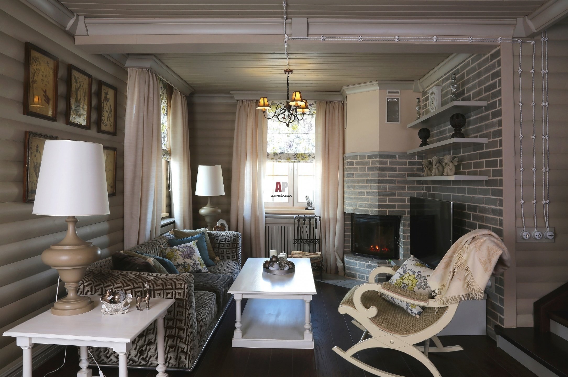 Гостиная в стиле Прованс в деревянном доме с обоями