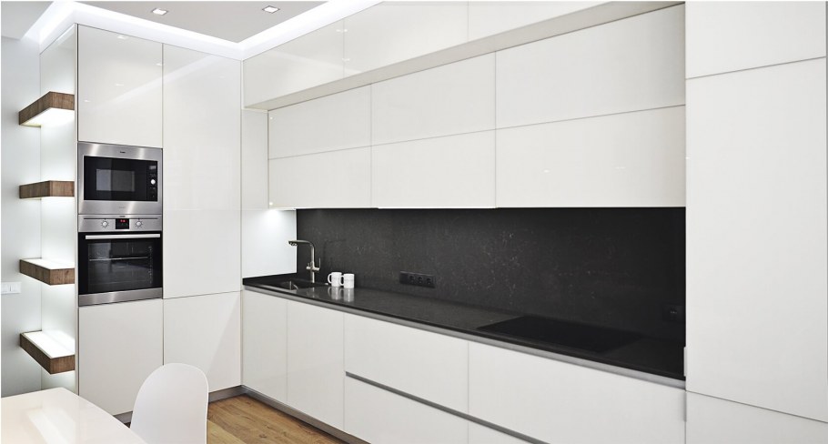 Белая кухня с антресолями и деревянными вставками (81 фото)