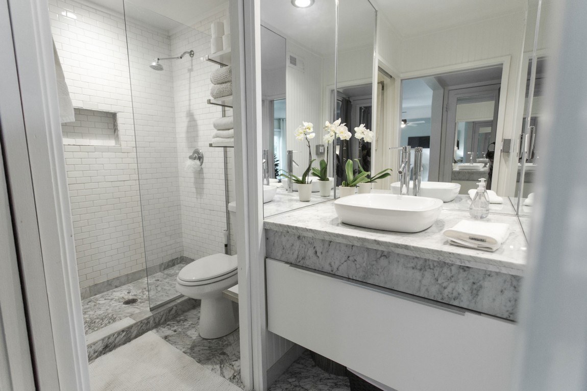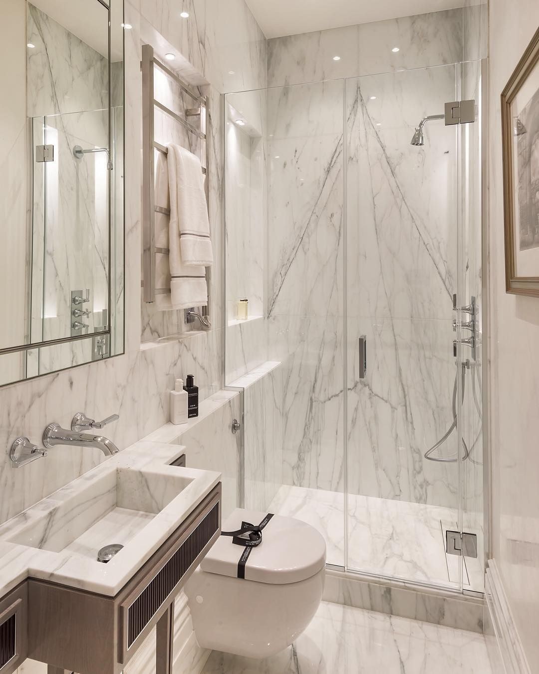 Белый мрамор в маленькой ванной