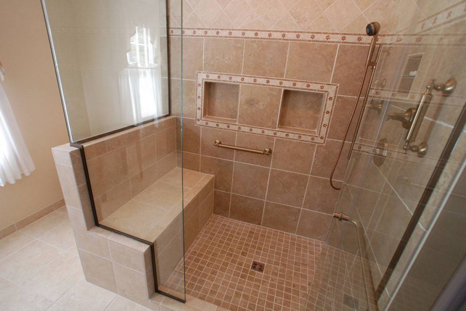 Душевая кабина из плитки со сливом в полу (76 фото)