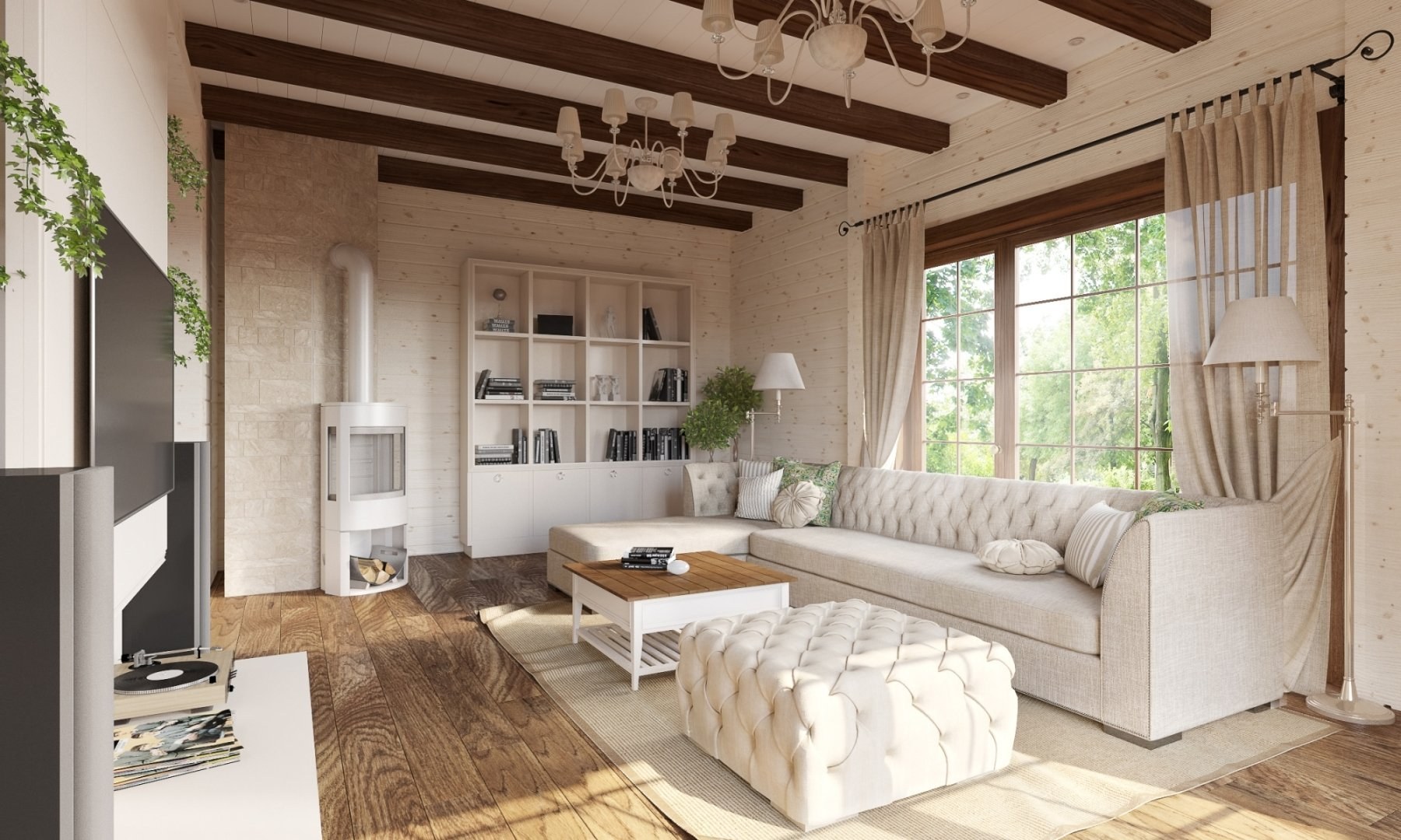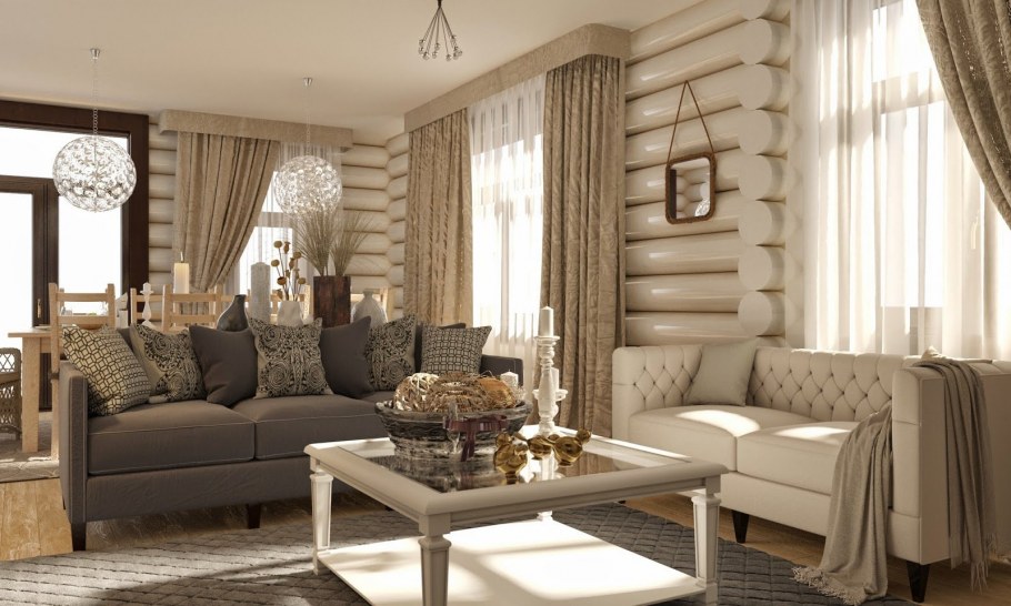 Шторы в гостиной в деревянном доме