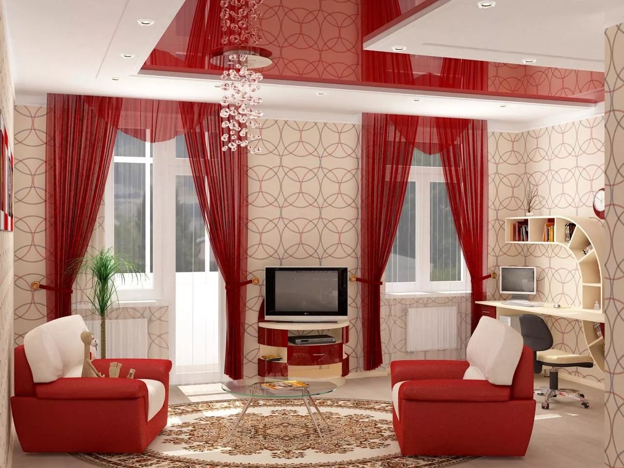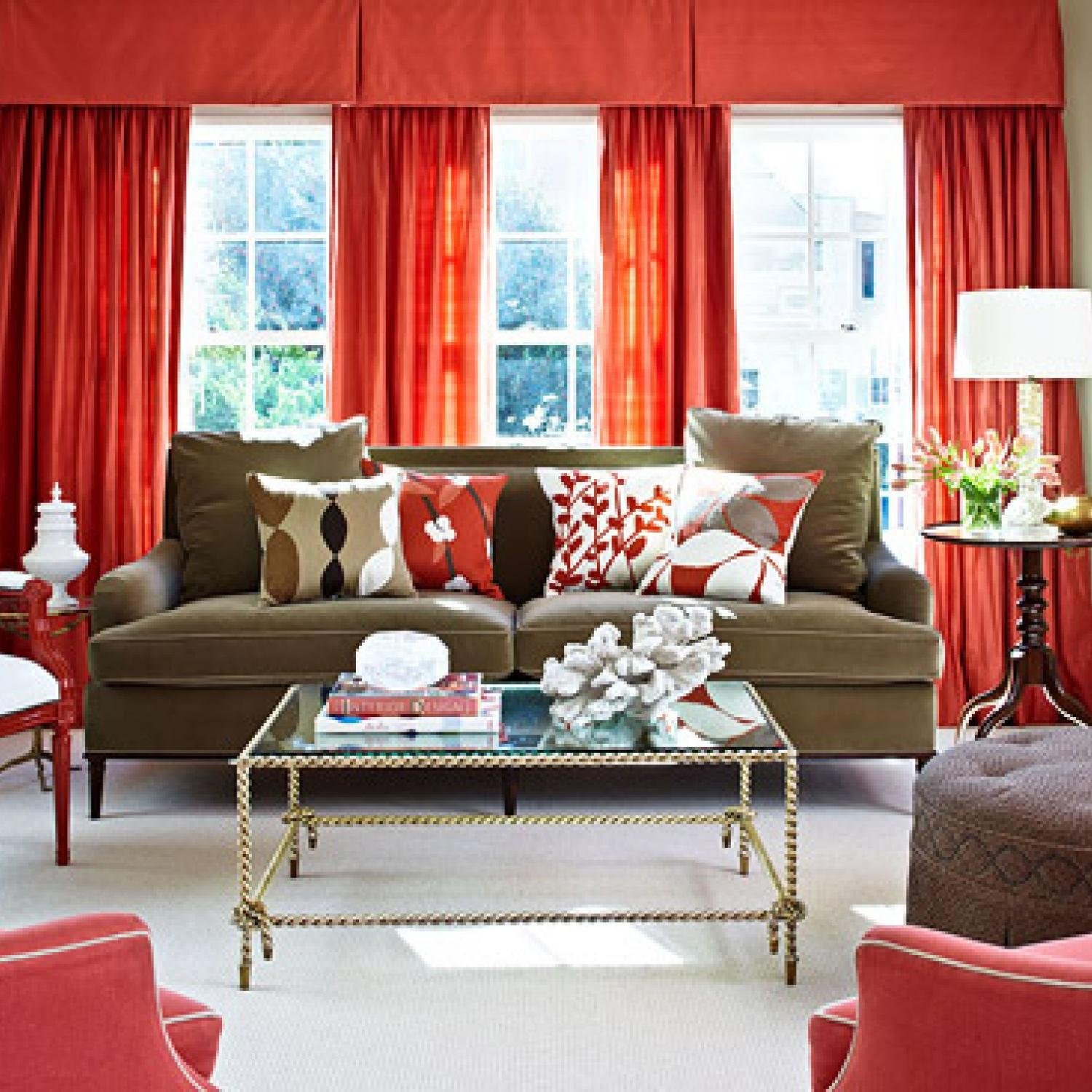 Красные шторы в интерьере гостиной