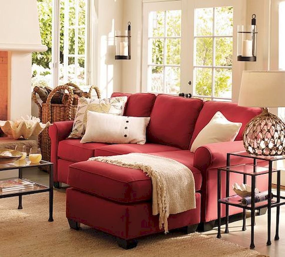 Красный диван в интерьере гостиной
