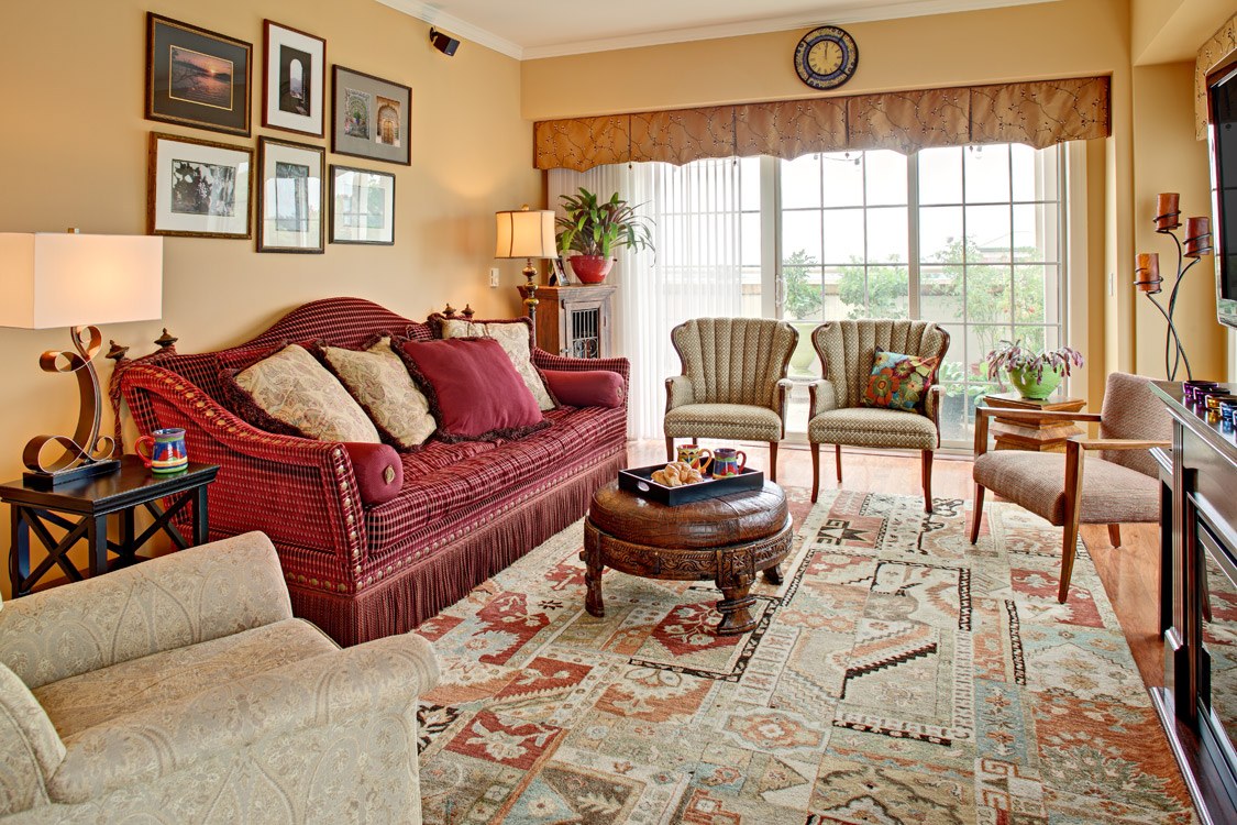 Красный ковер в интерьере гостиной