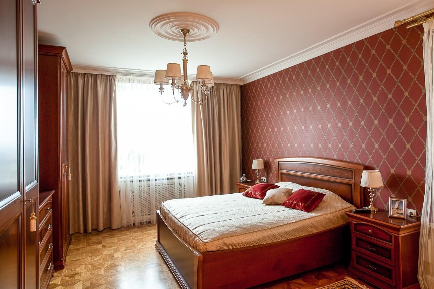 Бордовые обои в спальне