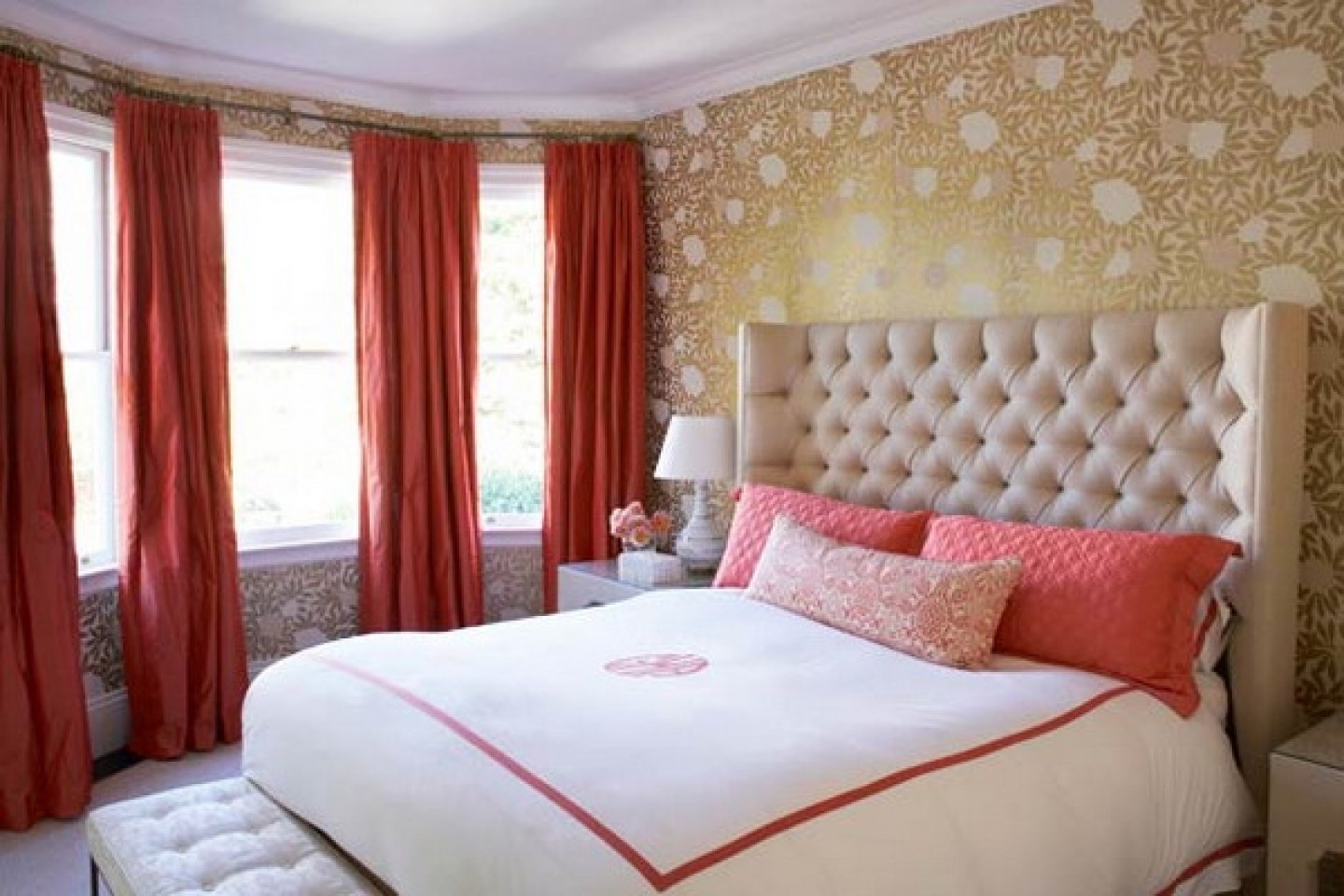 Коралловые обои в спальне